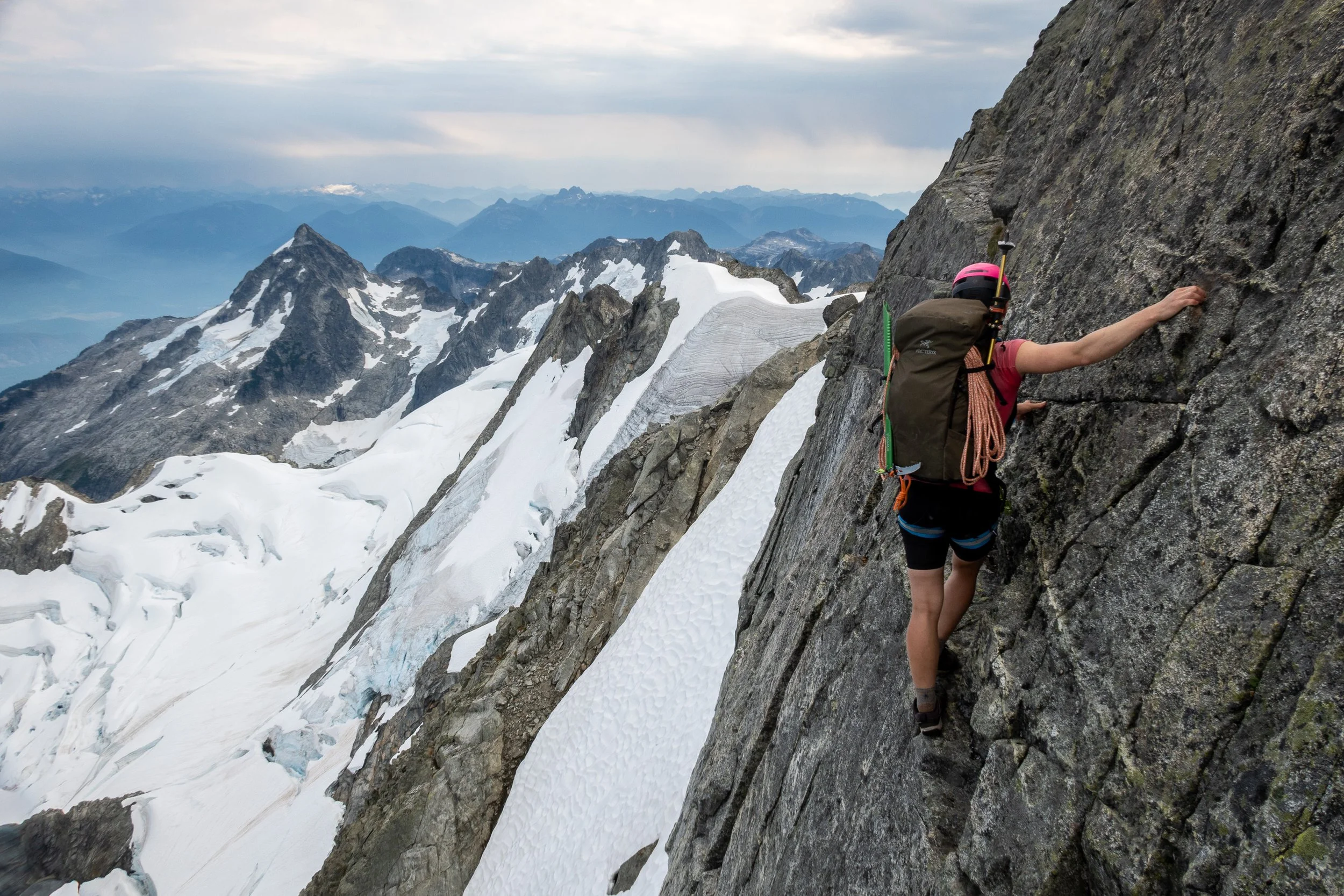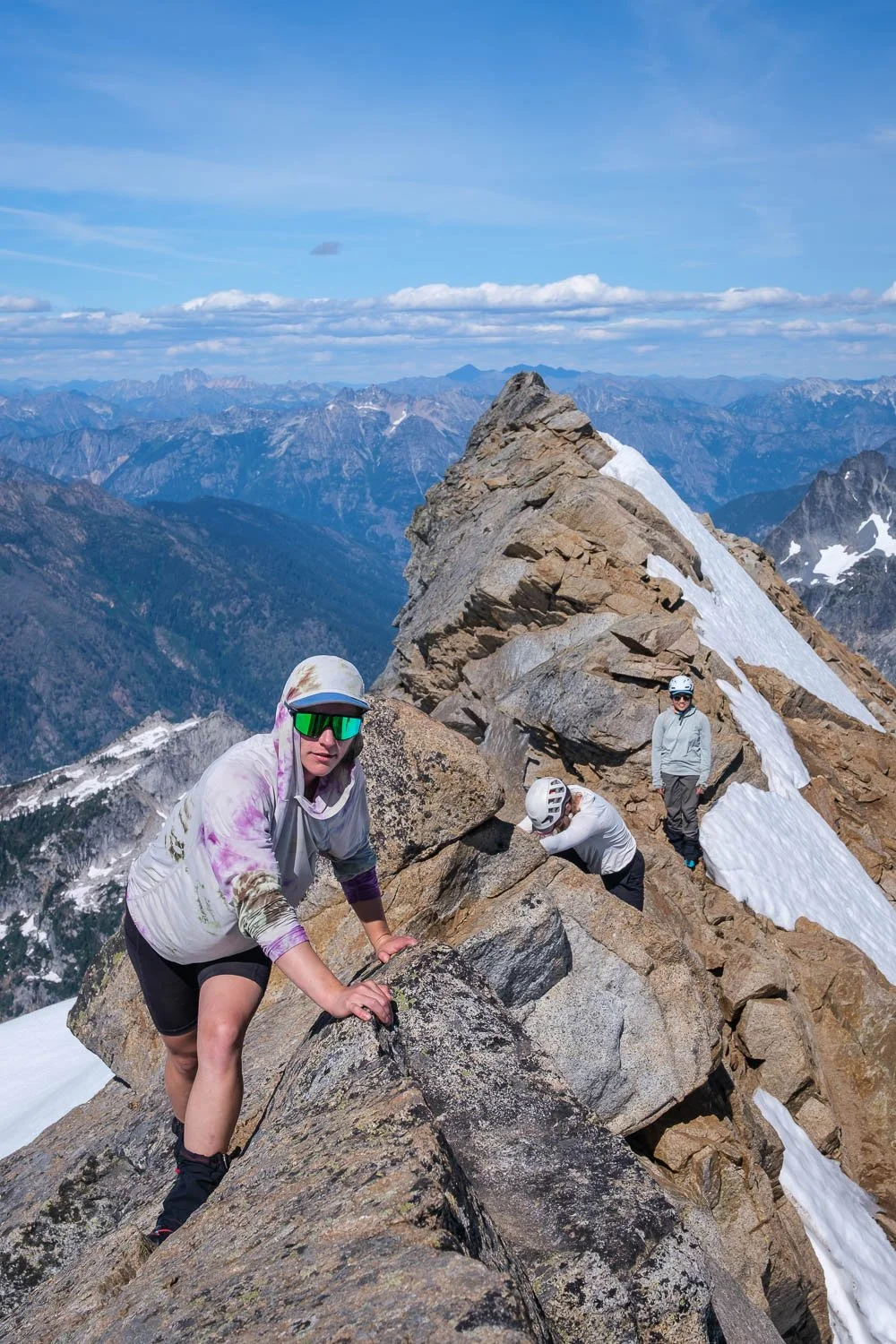 Becca on some amazing exposed (but easy) scrambling close to the summit of Tantalus. Alpha Mountain at left.
