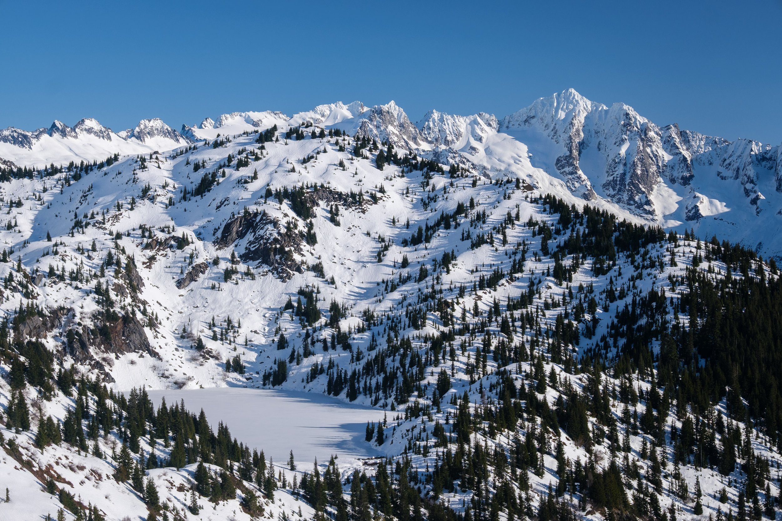 Well well well… we’re in the midst of the shittiest winter the Cascades have seen in a decade, but we still have to make the most of it! Two weeks ago we were confronted with another classic January high pressure system: beautiful clear skies and atrocious skiing. Naturally, it was time for… another silly ski blade mission! After a classic morning-of objective decision, Matt and I headed up the Cascade River Road to the Monogram Lake trailhead, hoping to camp in a beautiful spot and hopefully tag Big Devil, the highest summit of Teebone Ridge, a part of North Cascades National Park that I’d never visited before.