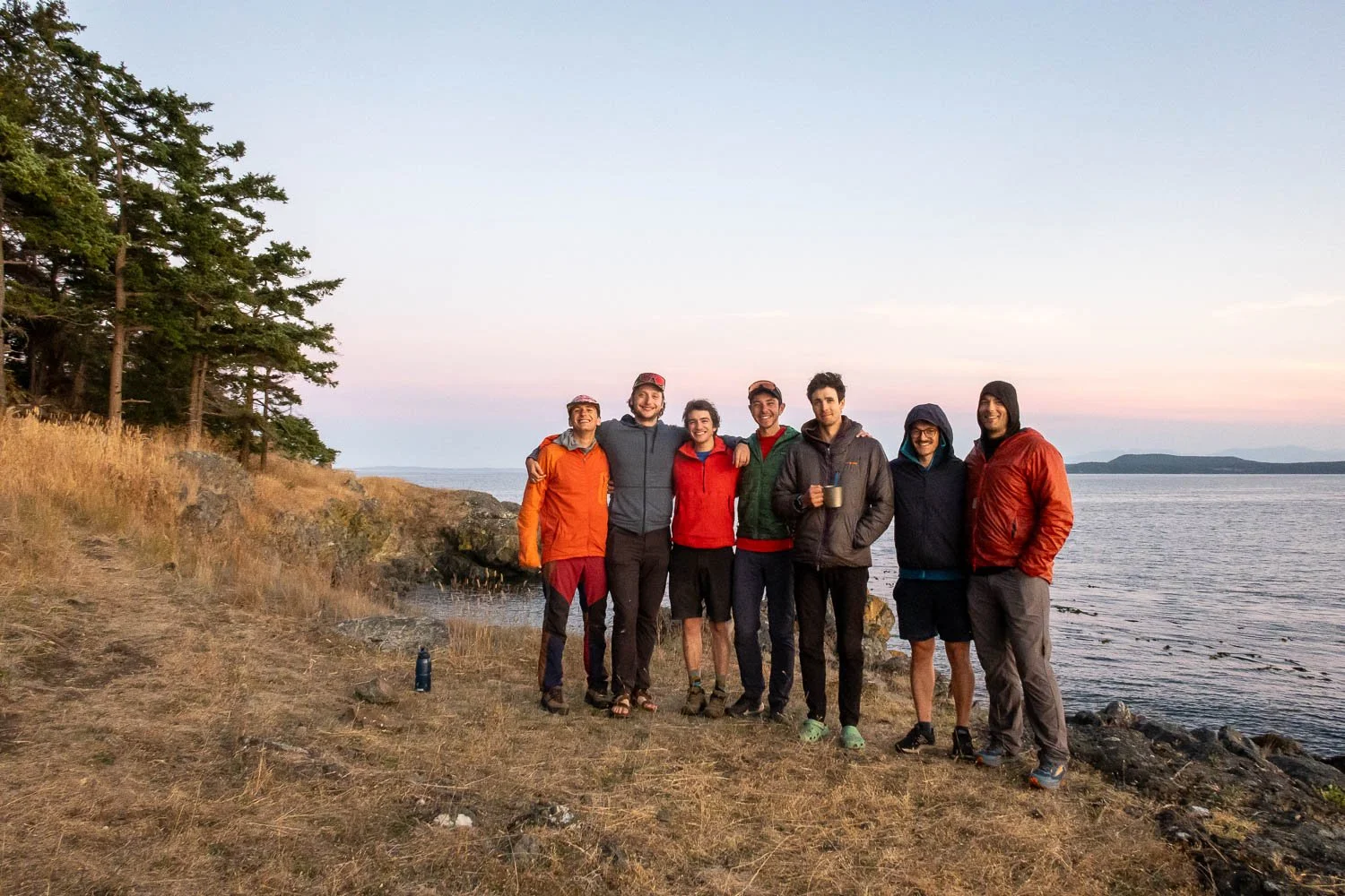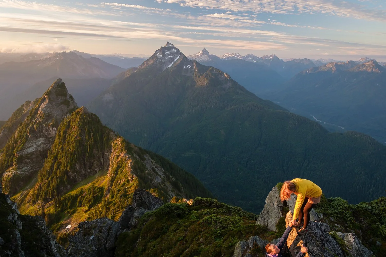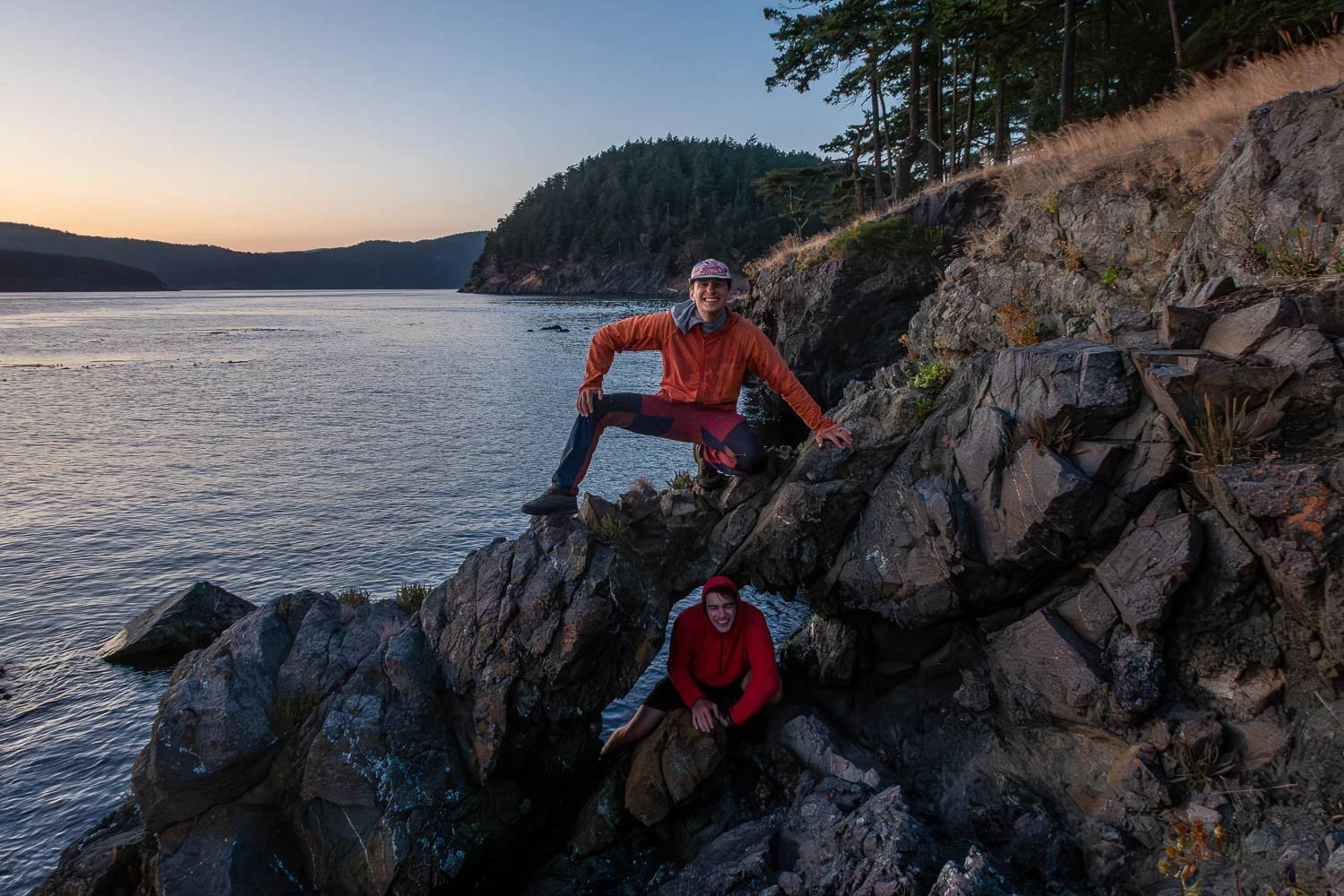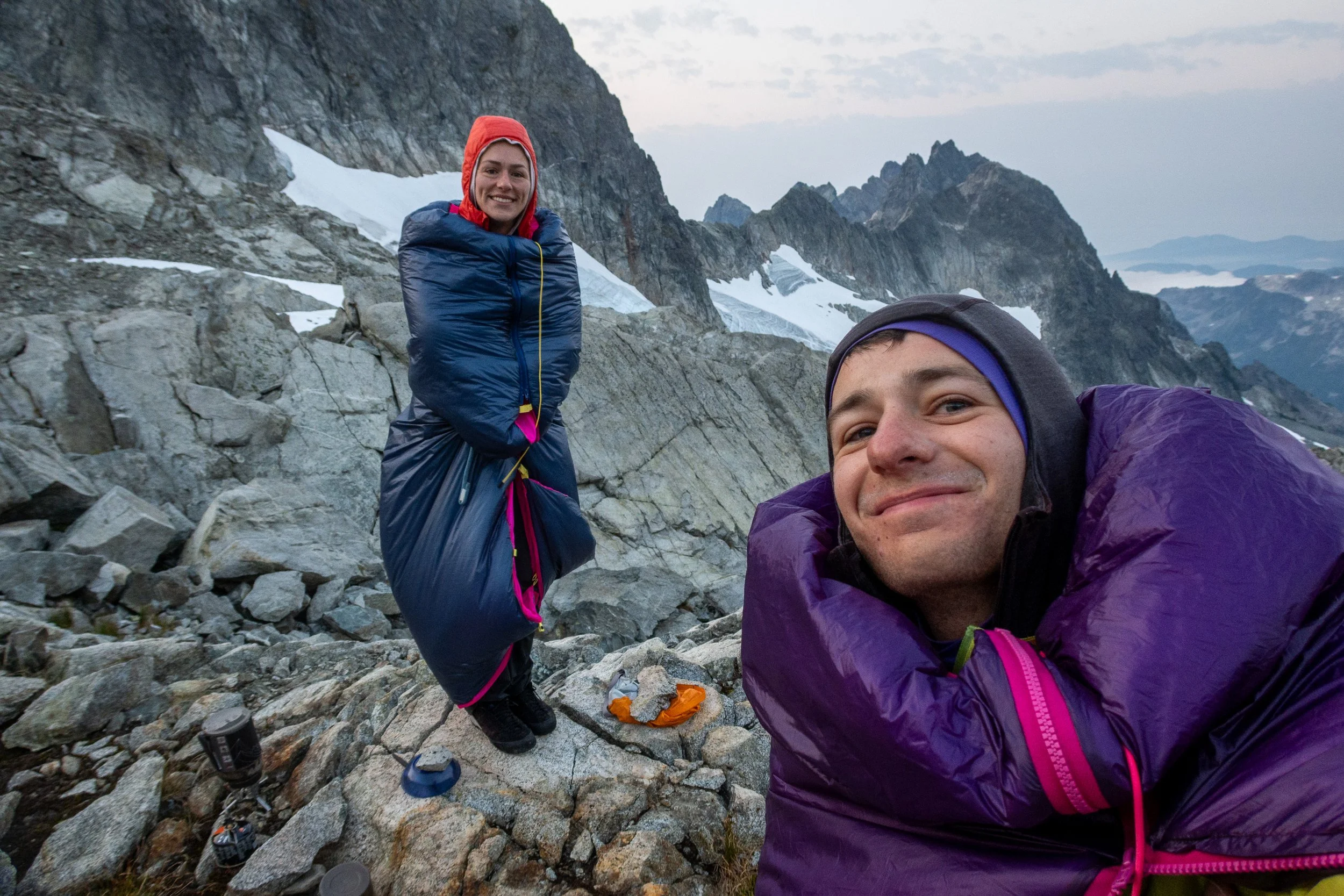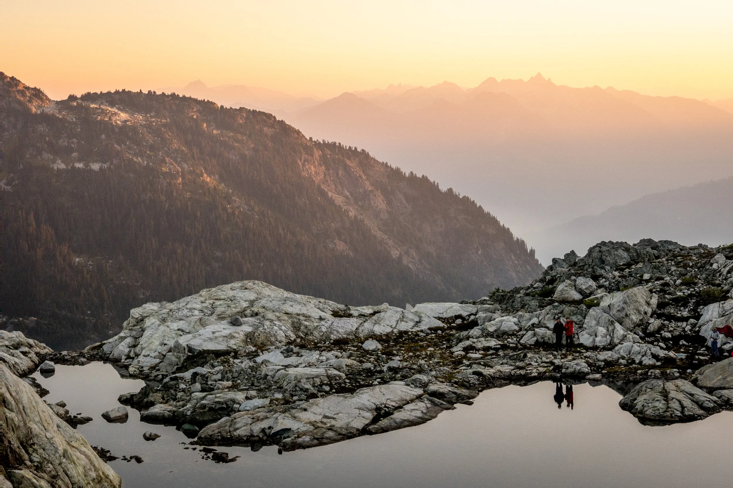 Matt and Austin at our camp, with the summits of Garibaldi Park glowing in the slightly smoky sunrise.