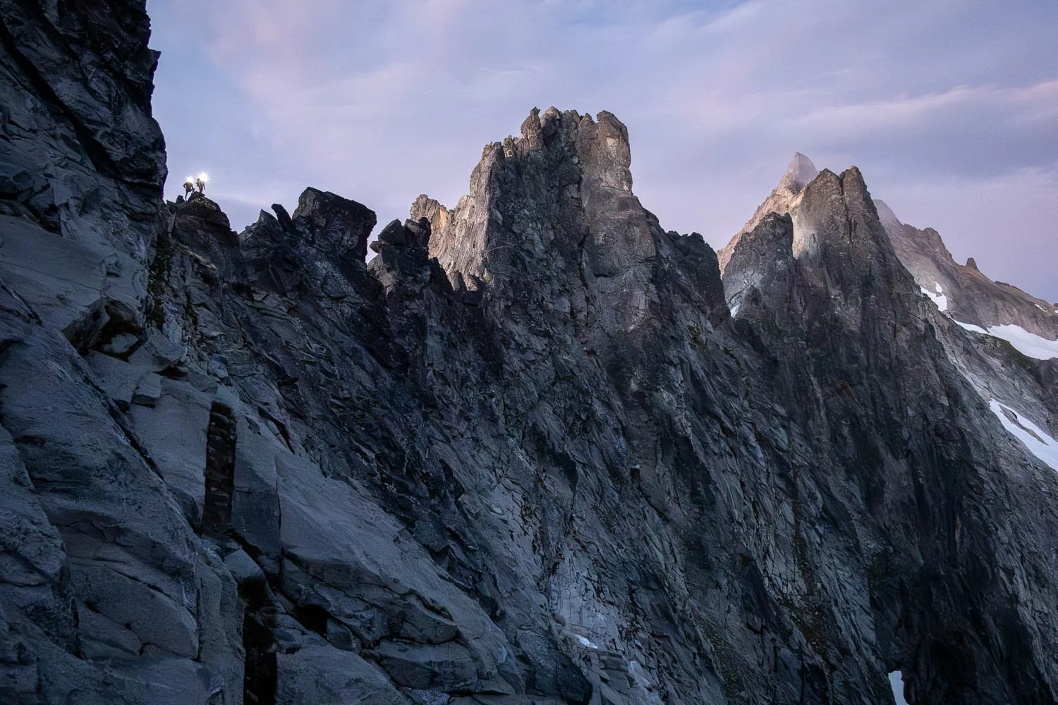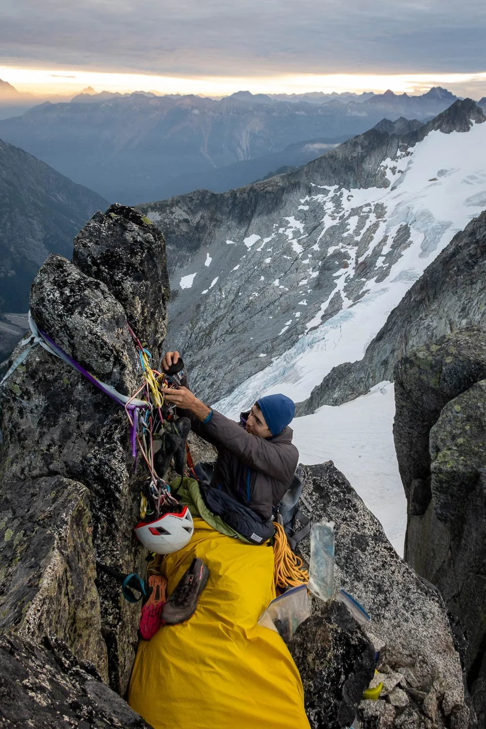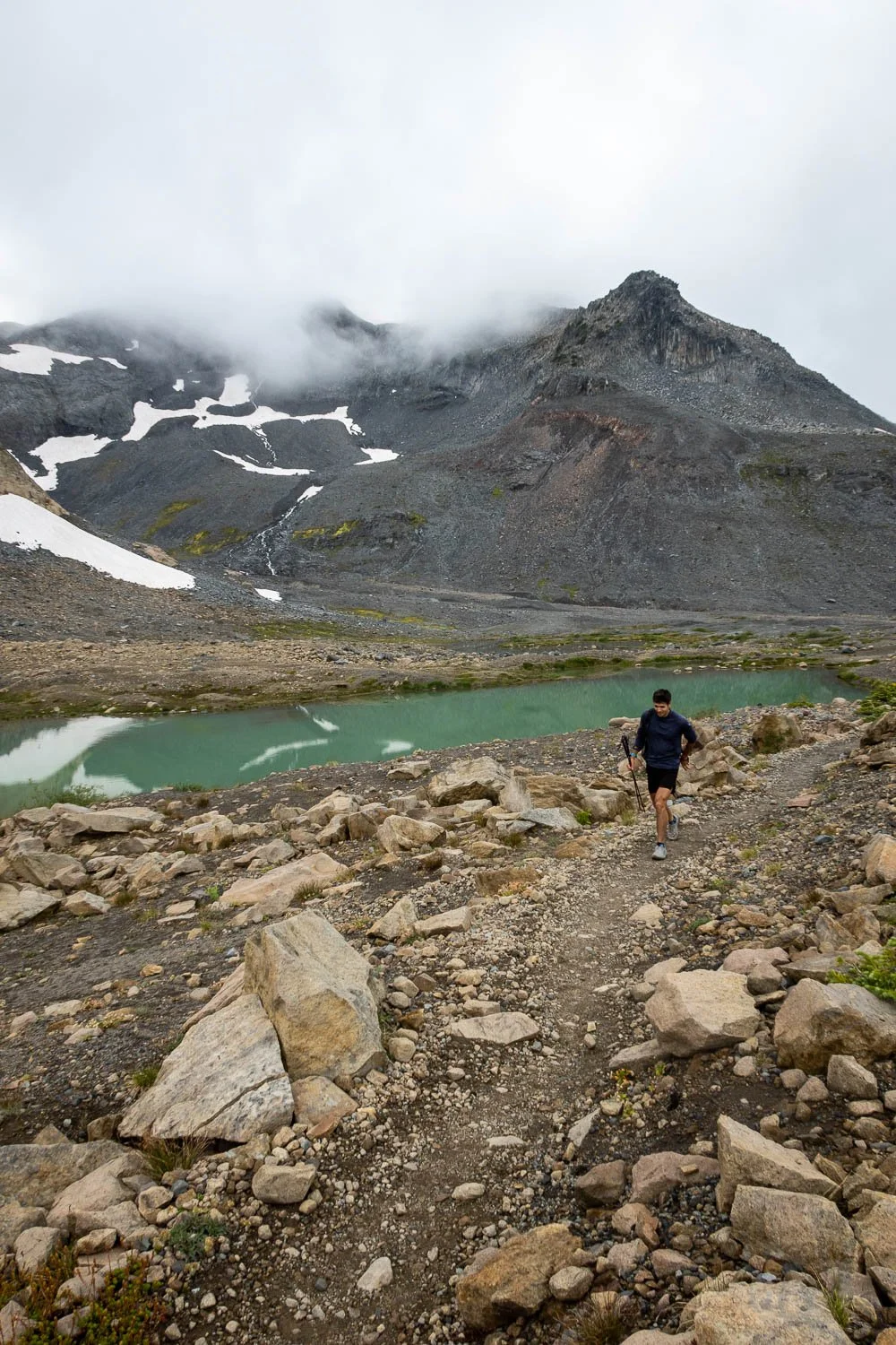 After doing a bit more downclimbing to reach the snow, we continued along the ridge on easier terrain. I got my hopes up that it would be quick going from here all the way to the Haberl hut, but we had to do some more loose downclimbing to reach the Dione Glacier. Once on the glacier, it was only about 1.5 miles to the hut, but with lots small ups and downs, this part dragged a bit. We finally reached the hut at 19:00, only an hour before sunset, and with 7,000 vertical feet of nontrivial descending remaining, it became pretty clear we were going to be camping for a second night. We faffed around a bit looking for a descent camp site, and found one with running water not too far from the hut. Just as the sun dropped below the horizon, it started raining torrentially, and thankfully the downpour stopped as quickly as it started, which was a relief. None of us were looking forward to the prospect of spending a rainy night in our bivies. The excitement for the evening wasn’t over, however, as a thunderstorm formed in the dark and rolled over the area, with a few roars of thunder that felt right over head. We watched with sympathy the headlamps of a party descending Serratus in the dark, rainy, and lightning-studded night. There were a few more brief showers, but thankfully it never really rained too much more. We woke up the next morning, slightly soggy, and packed off for our last push down to the Squamish River, far below.