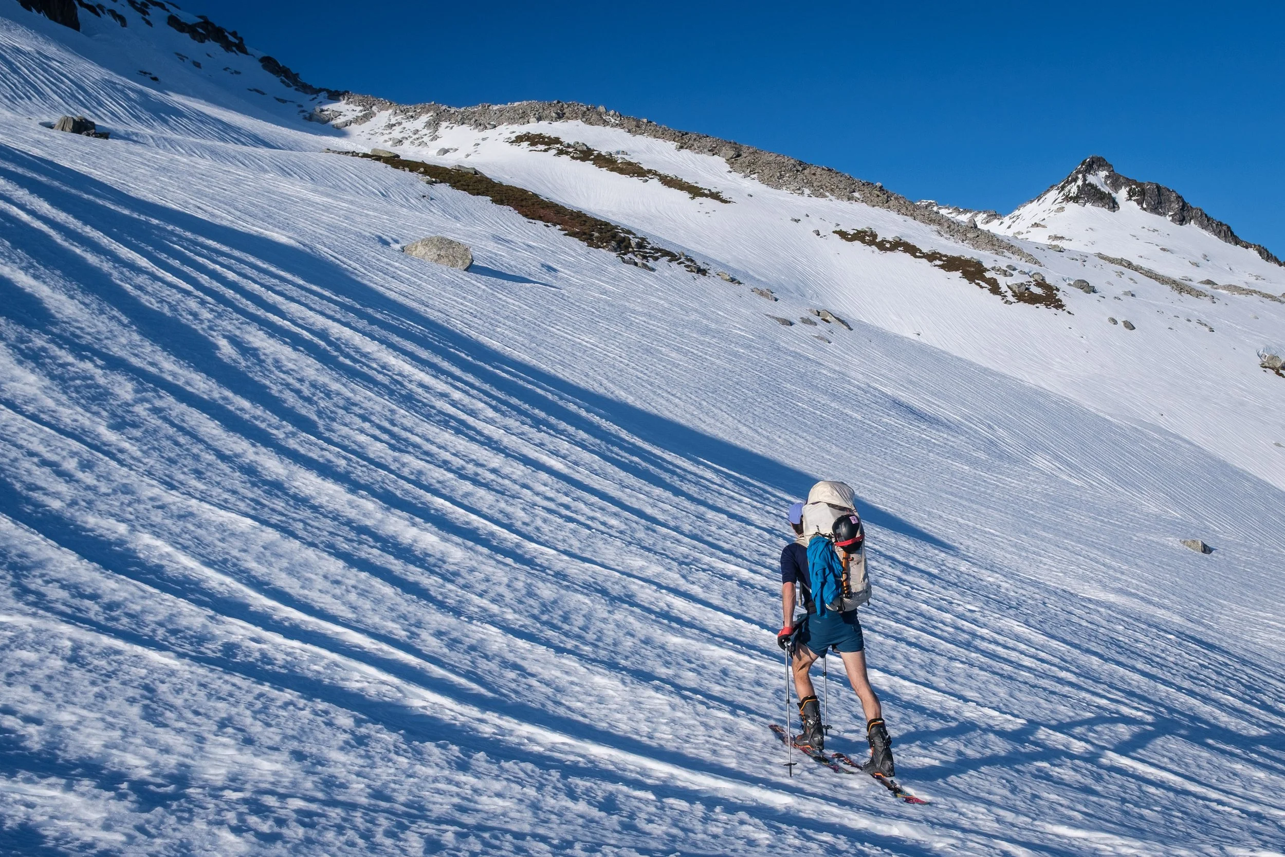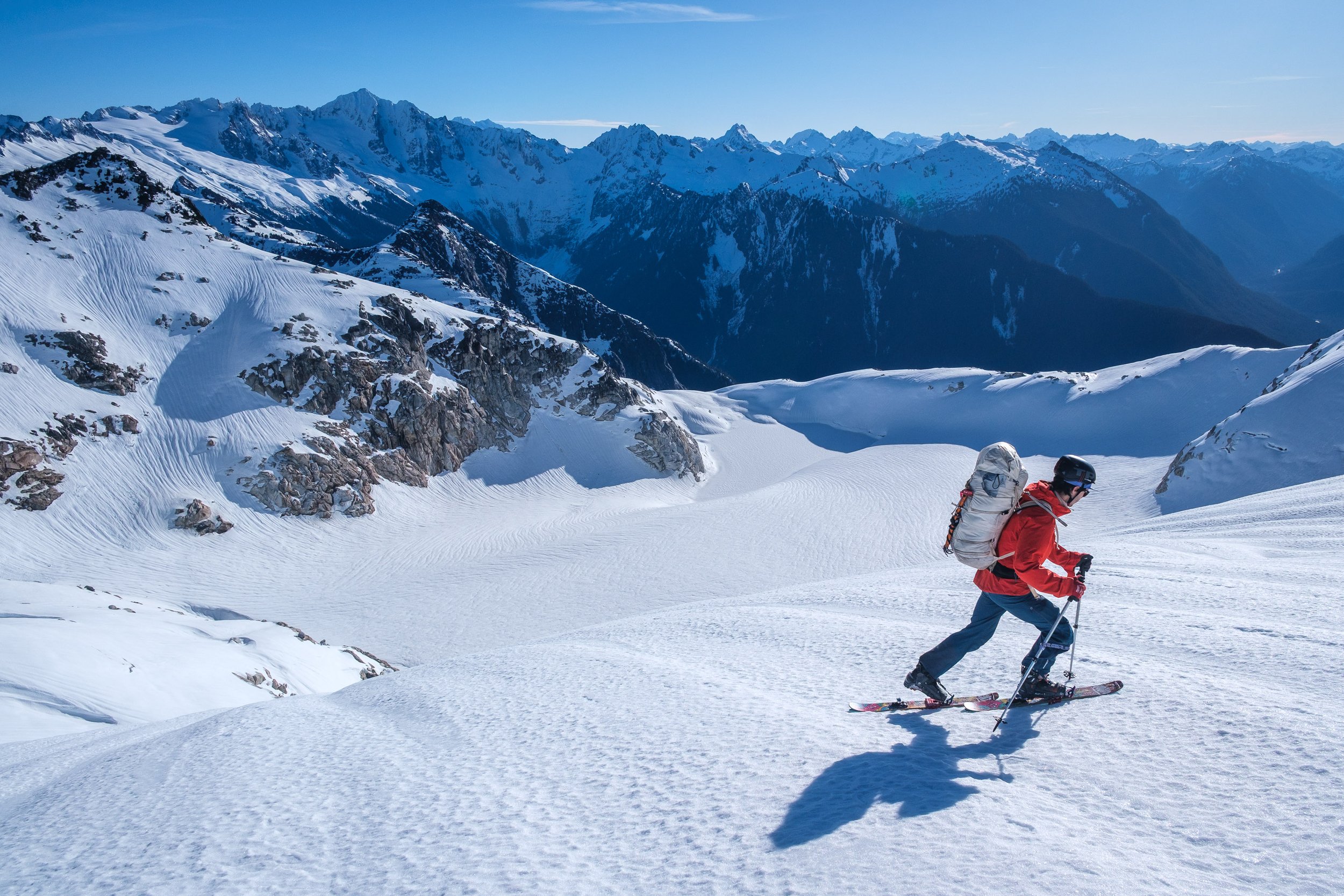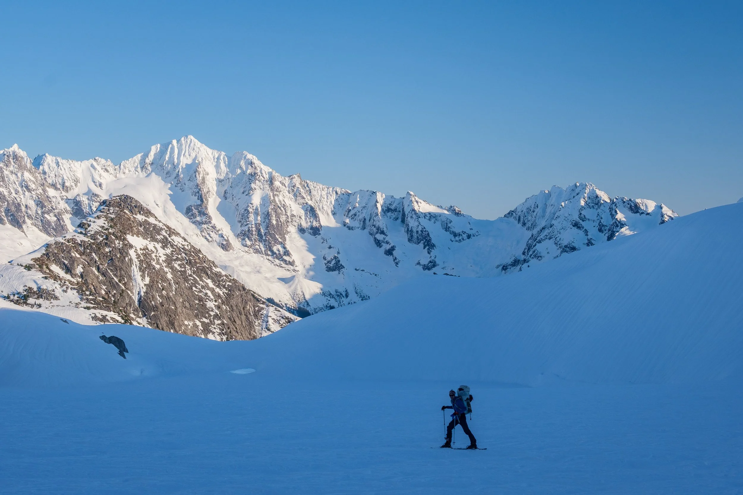 Skinning above the Monogram Glacier, with Eldorado, the Three Dicks, and Hidden Lake Peaks across Marble Creek behind.