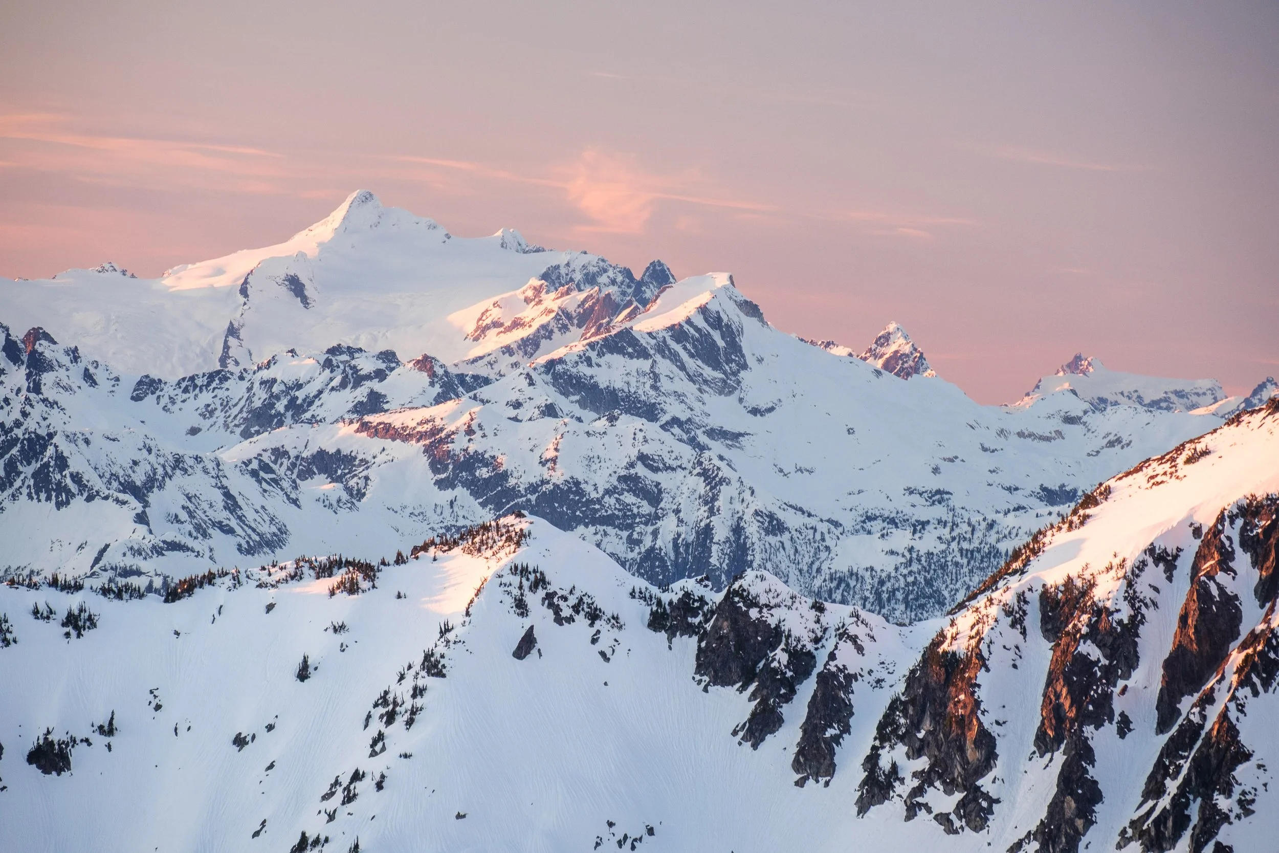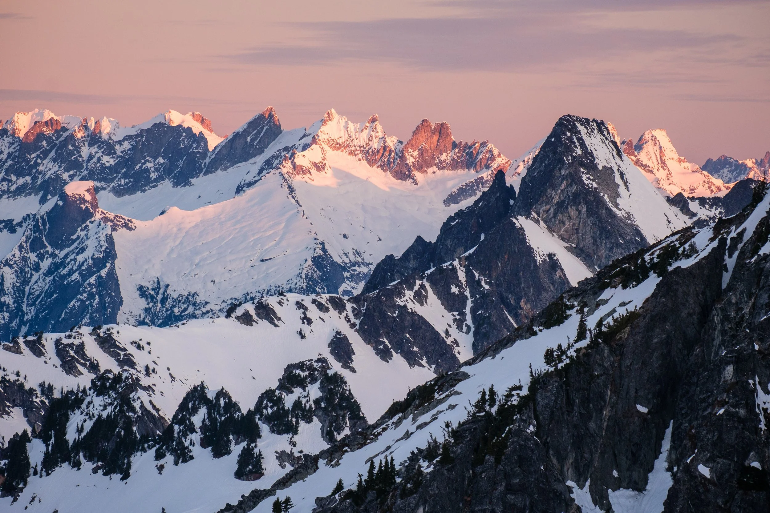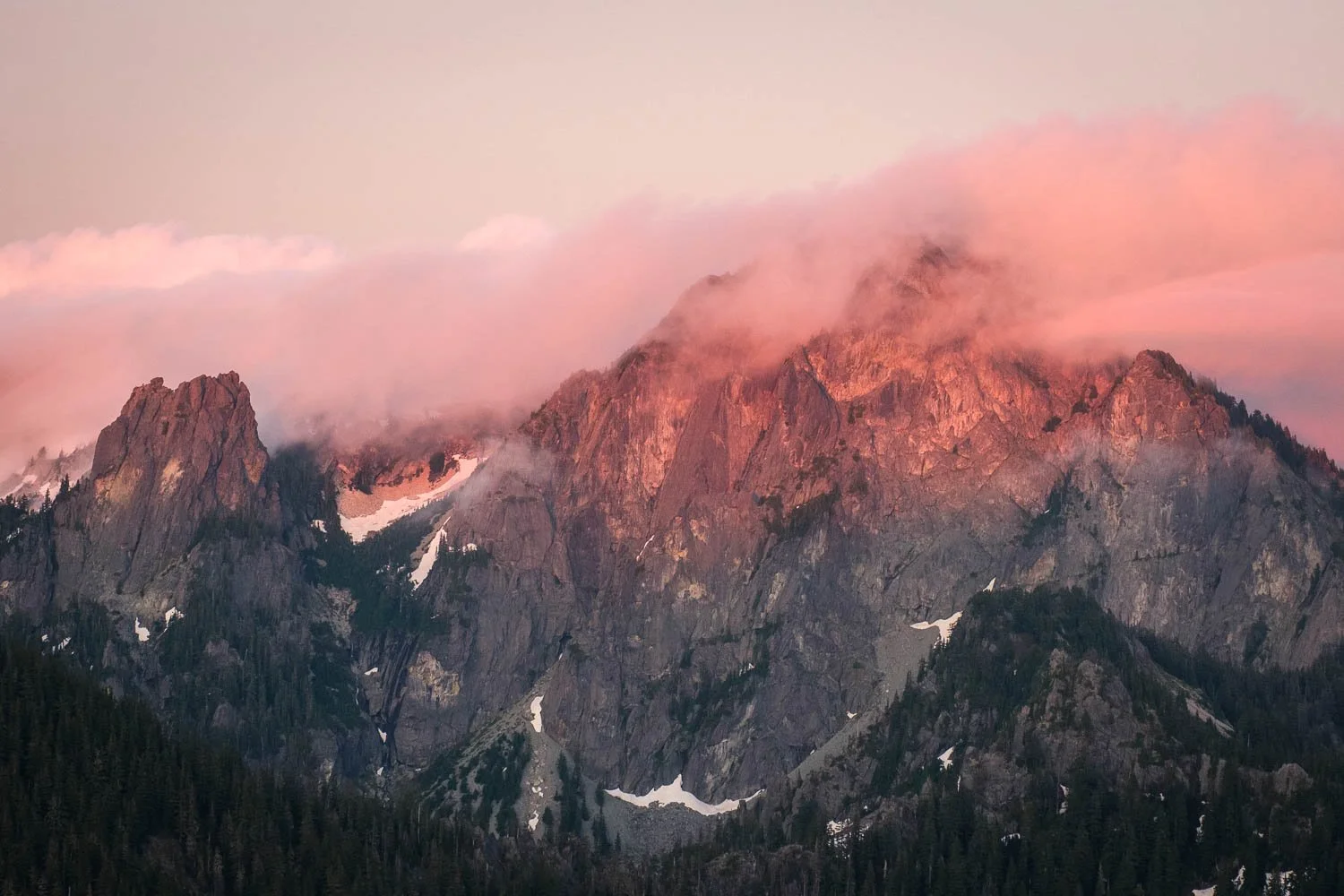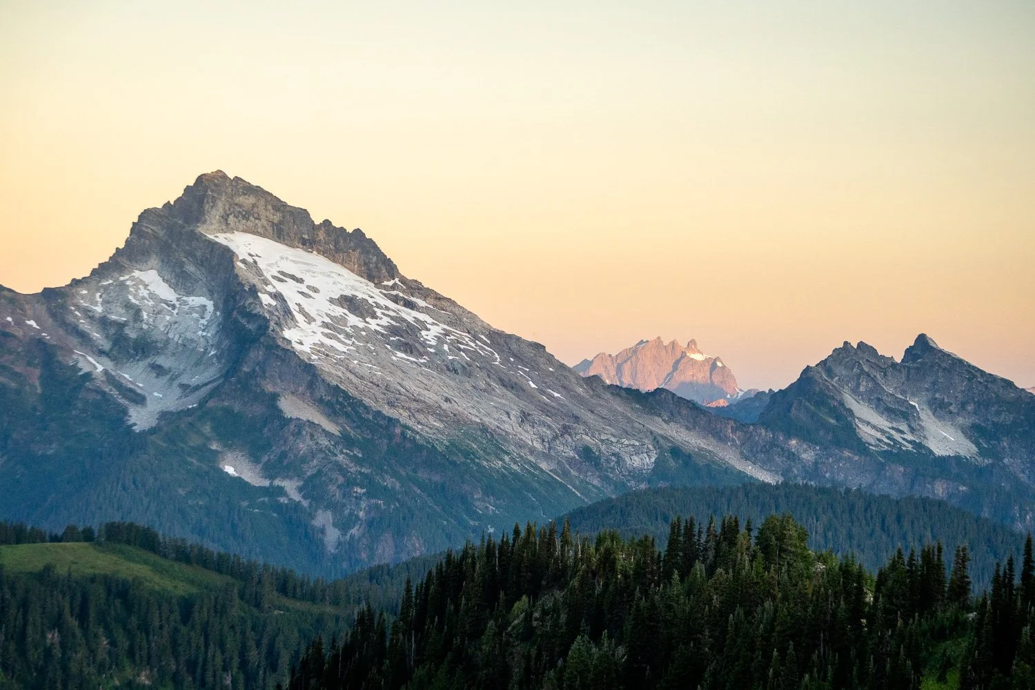 Pugh and Sloan Peak at dawn, with the Monte Cristo summits partially obscured by trees at the right.