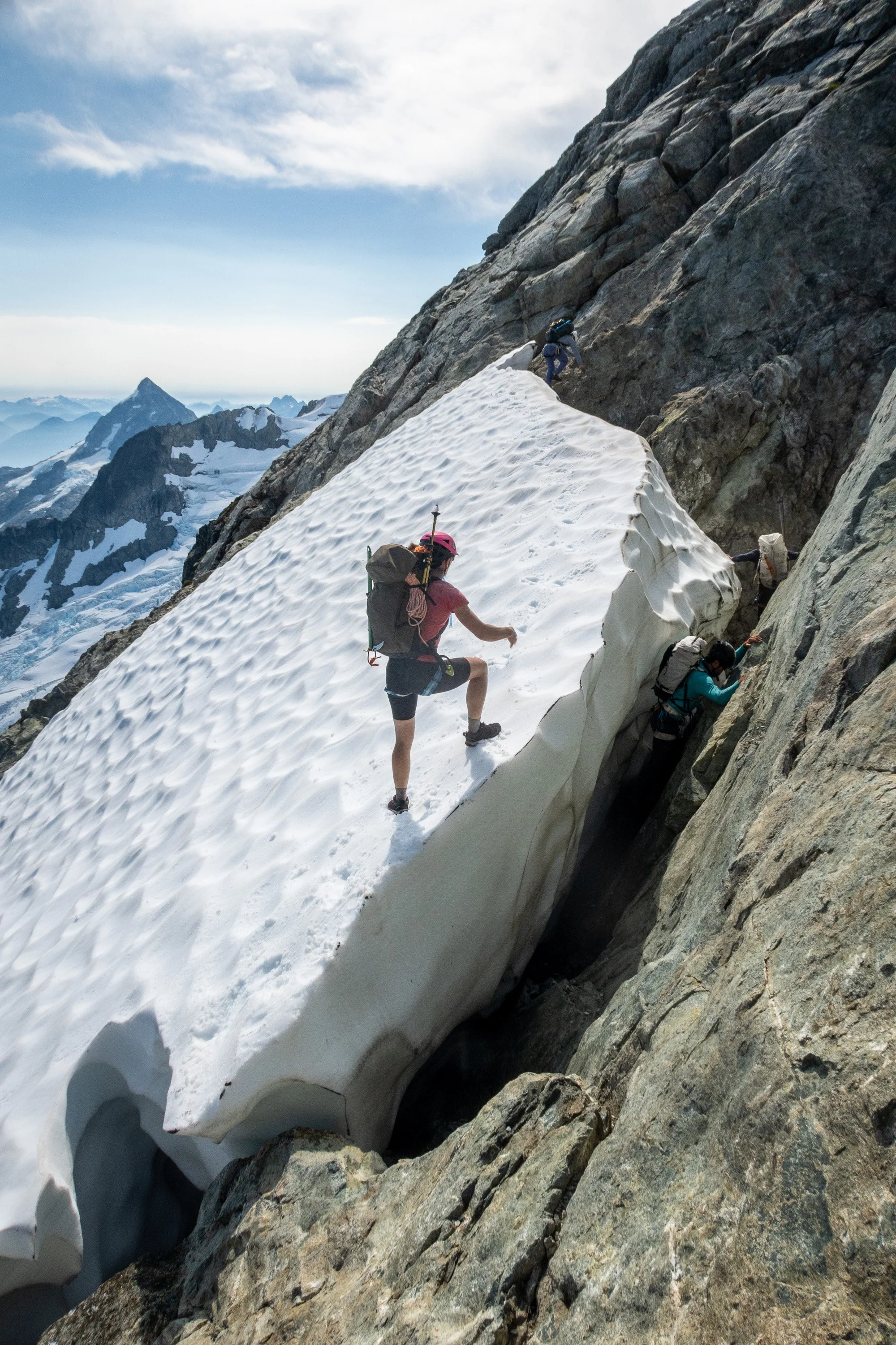 This first stretch of ridge went fairly quickly, and before long, the summit of Tantalus was looking much closer. At around 2,400 meters, 200 meters below the summit, the Rumbling Glacier rises all the way to the ridge crest, inserting two short sections of snow and ice into our path to the summit. The first one was pretty easy to cross with a not-too-bad moat and gentle snow, but the second one was quite a bit steeper, with a deep and wide moat at this point in the season (early September). Here we whipped out the rope, belayed folks across a nubbin of snow that bridged the moat. We climbed up the steep snow back to the ridge crest, got back onto the rock on the far side without much trouble, and climbed some steep and dirty but easy rock to surmount the next step on the ridge. From there, it was easy and beautifully exposed scrambling to hit the standard ascent route (and rap anchors) just below the summit, which we scrambled up to at 14:00, 6.5 hours from camp.