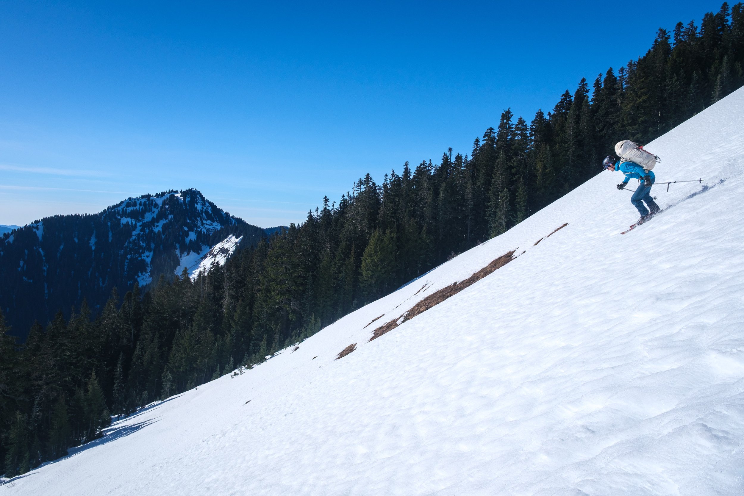 The best skiing of the trip was also the last skiing of the trip, in the broad bowl above the trail in the Lookout Creek drainage. Lookout Mountain in the distance.