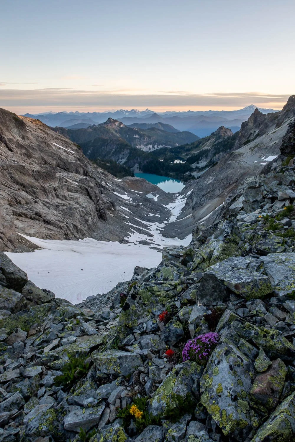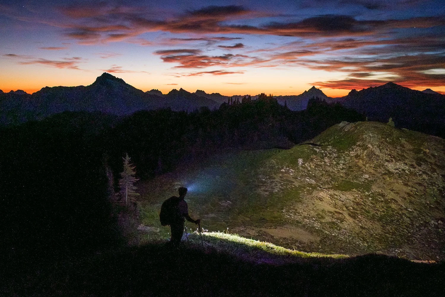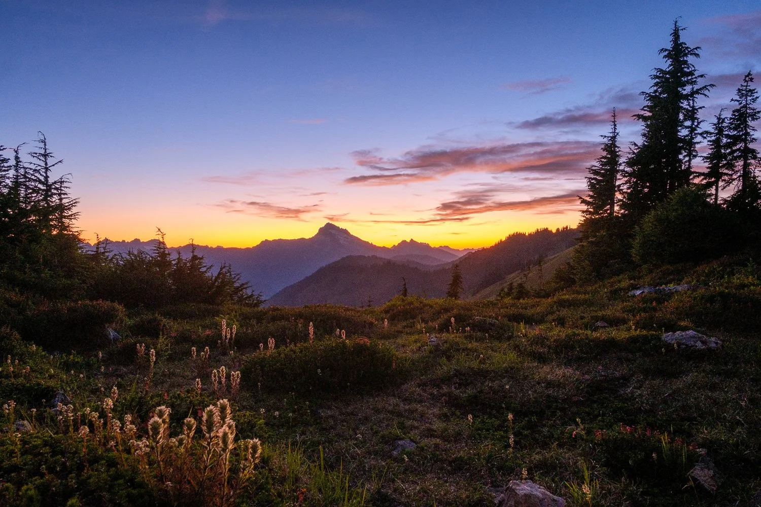 An hour or so before sunset, the light got absolutely gorgeous, and we had a grand time snapping countless pictures from the site of the old fire lookout (built in 1939 and apparently abandoned in 1959). Just before sunset, we started slowly making our way back down the trail, photographing flowers and meadows. The light faded as we continued a bit further along the Pilot Ridge trail, but it was one of those magical evenings where the color seems to linger on the clouds forever. Absolutely stunning. Eventually, though, we pulled out our headlamps to find a pleasant campsite just off the trail, and we tucked in for the night.