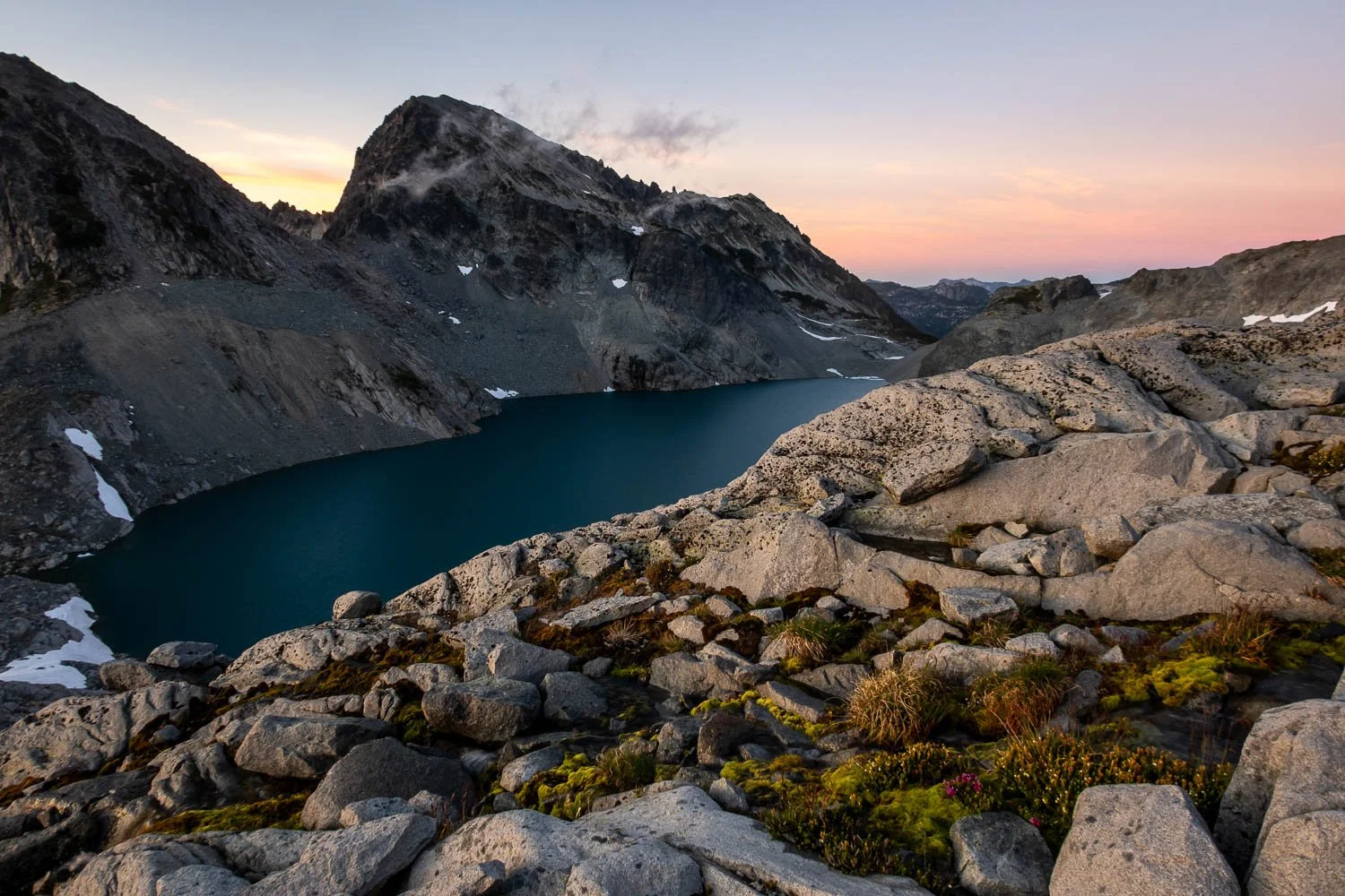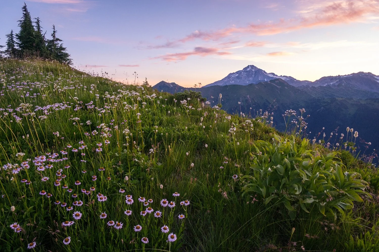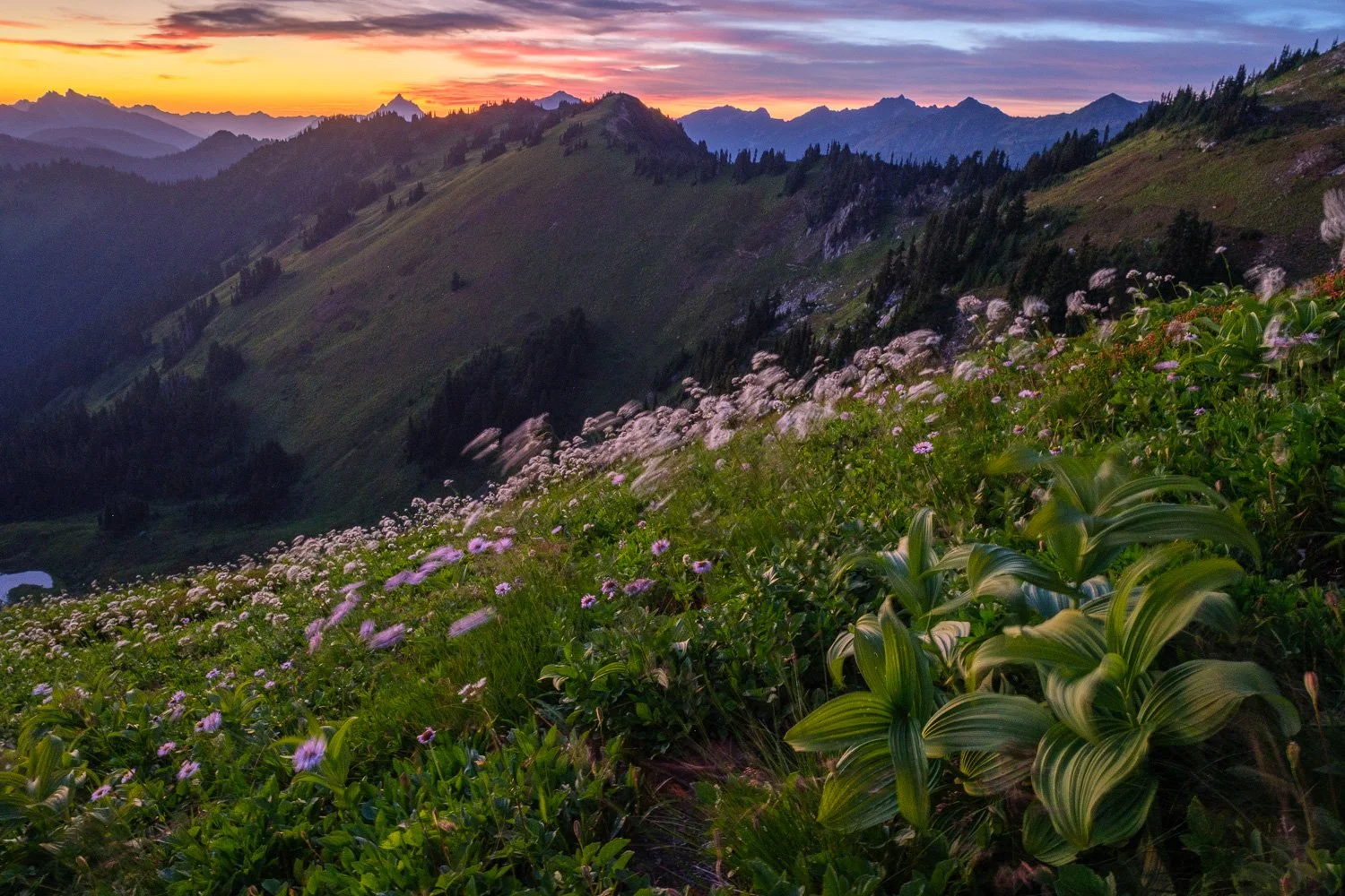 An hour or so before sunset, the light got absolutely gorgeous, and we had a grand time snapping countless pictures from the site of the old fire lookout (built in 1939 and apparently abandoned in 1959). Just before sunset, we started slowly making our way back down the trail, photographing flowers and meadows. The light faded as we continued a bit further along the Pilot Ridge trail, but it was one of those magical evenings where the color seems to linger on the clouds forever. Absolutely stunning. Eventually, though, we pulled out our headlamps to find a pleasant campsite just off the trail, and we tucked in for the night.