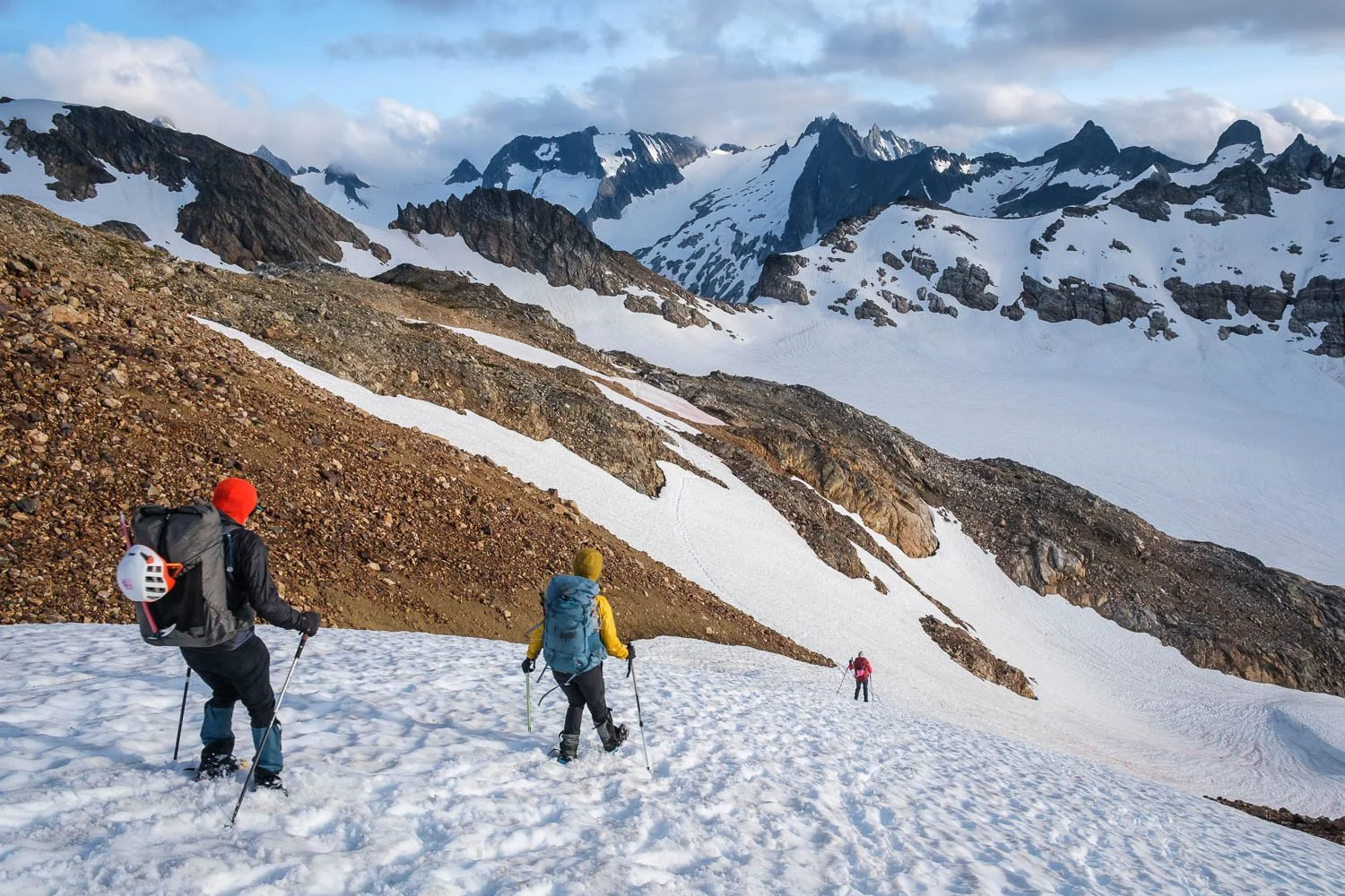 With just a bit of afternoon mush, we gained the high ridge connecting Katsuk and Pachyderm Peaks, and crossed onto the Kimtah Glacier, the third and last of the day. We climbed steeply above the glacial icefall, then traversed through beautiful and straightforward terrain to reach the saddle on the Ragged Ridge just below the summit of Cosho Peak, the westernmost and most diminutive summit of the ridge, where we planned on camping.
