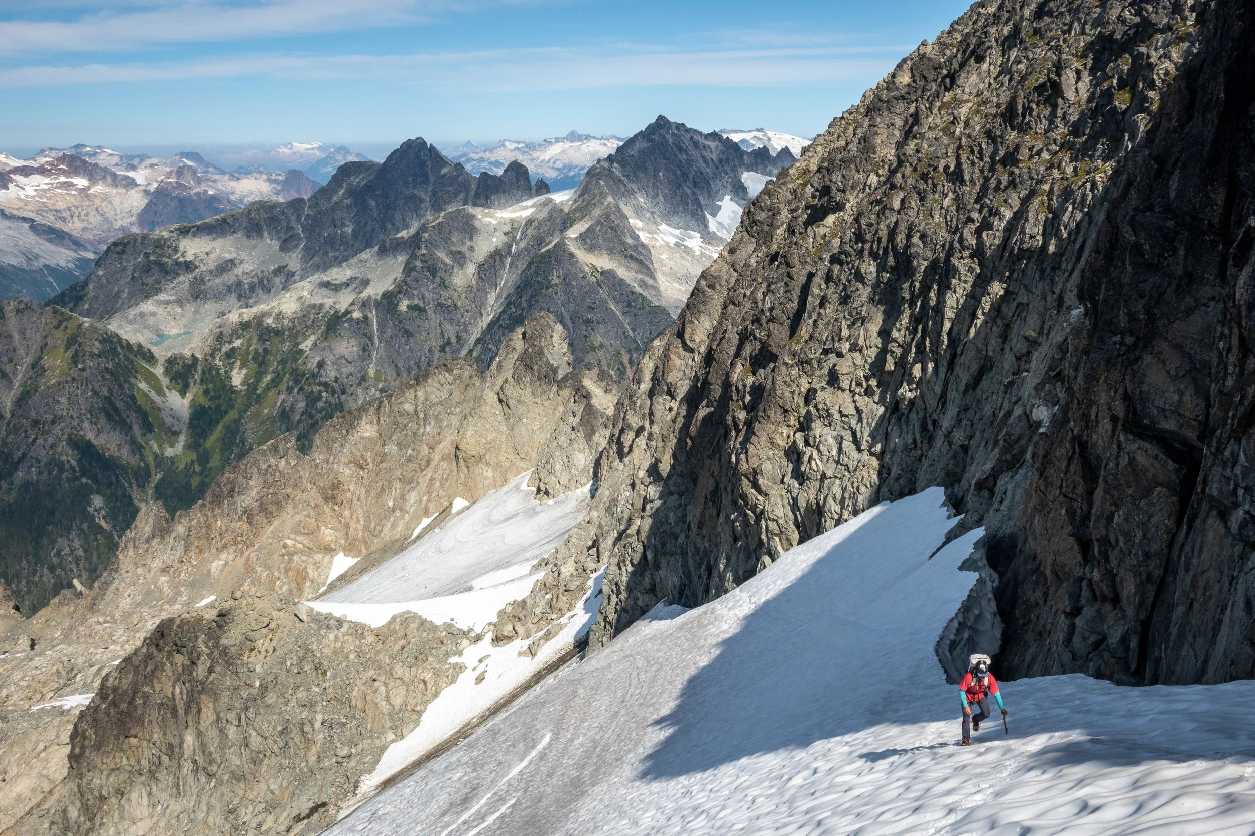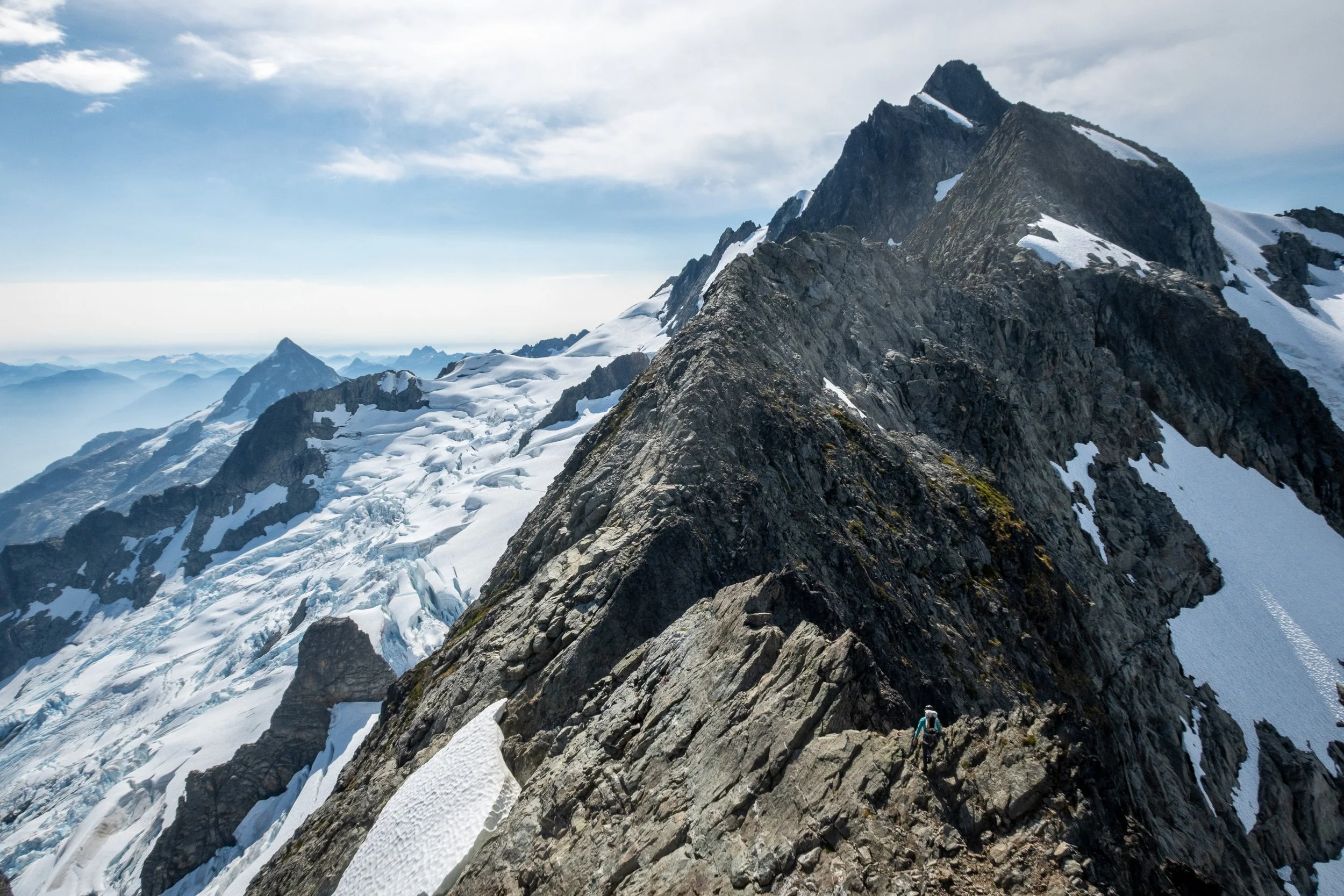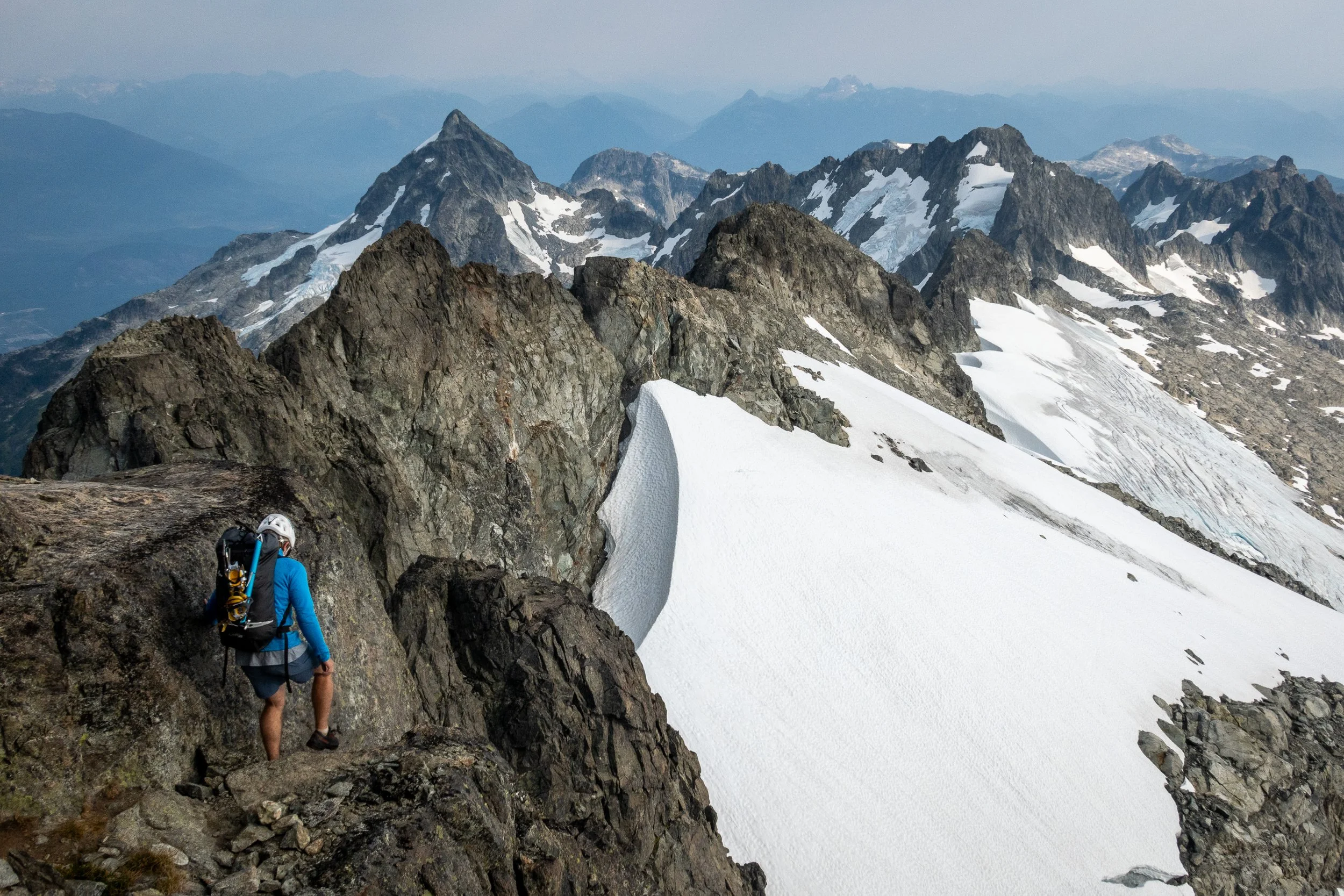 The North Ridge stretching onwards to Tantalus’ summit, with the gorgeous Rumbling Glacier on the left. Spot Austin on the ridge crest at the bottom of the frame.