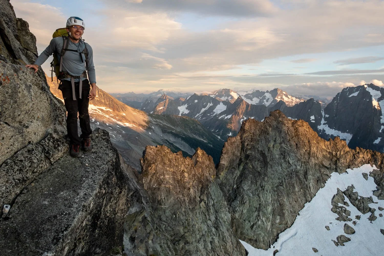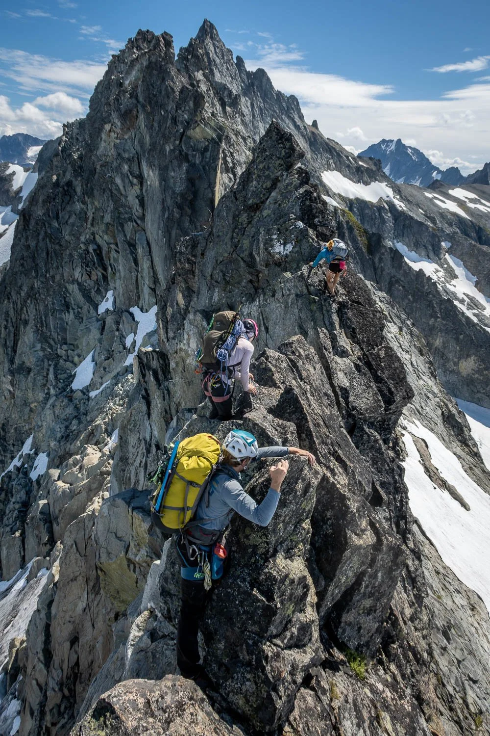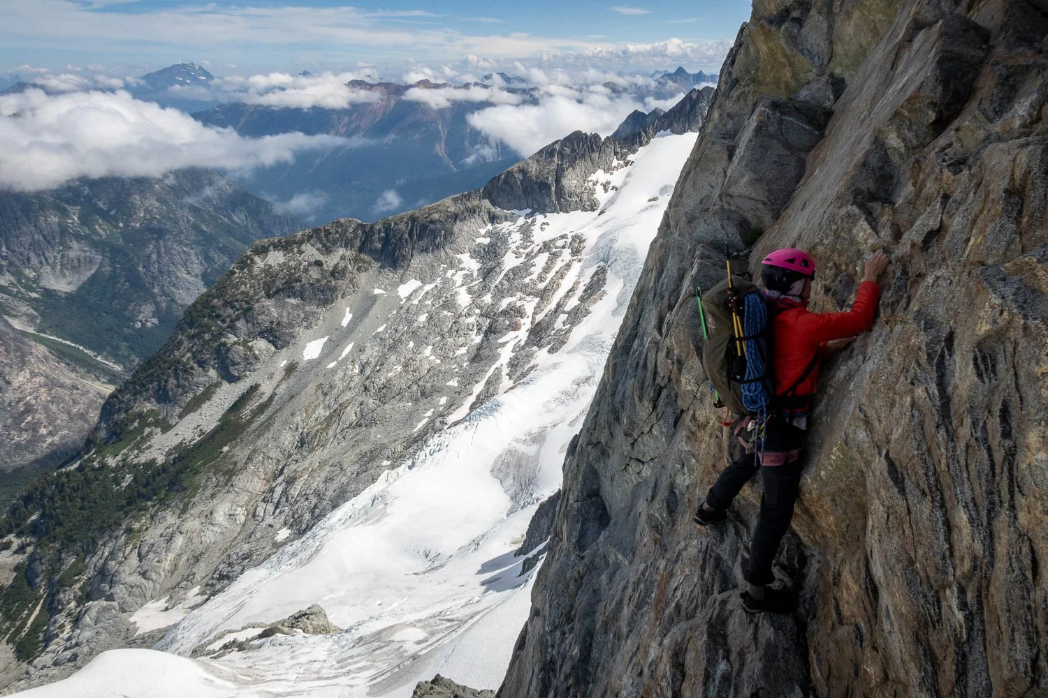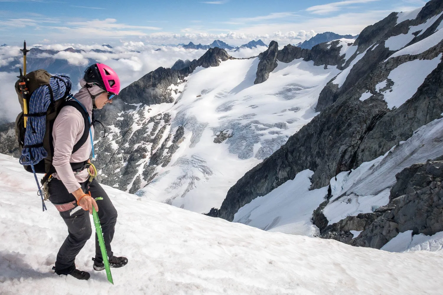 The North Ridge stretching onwards to Tantalus’ summit, with the gorgeous Rumbling Glacier on the left. Spot Austin on the ridge crest at the bottom of the frame.