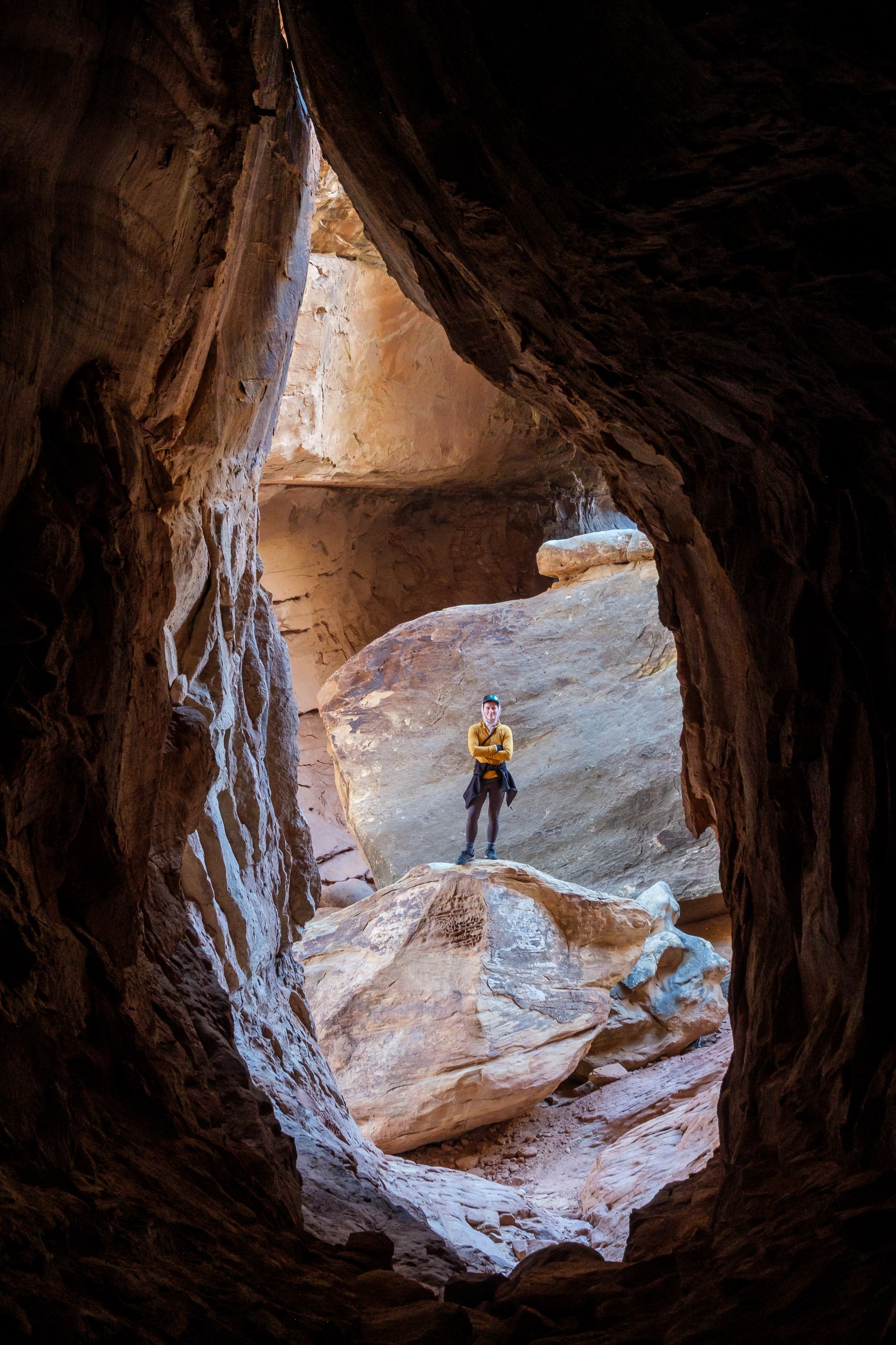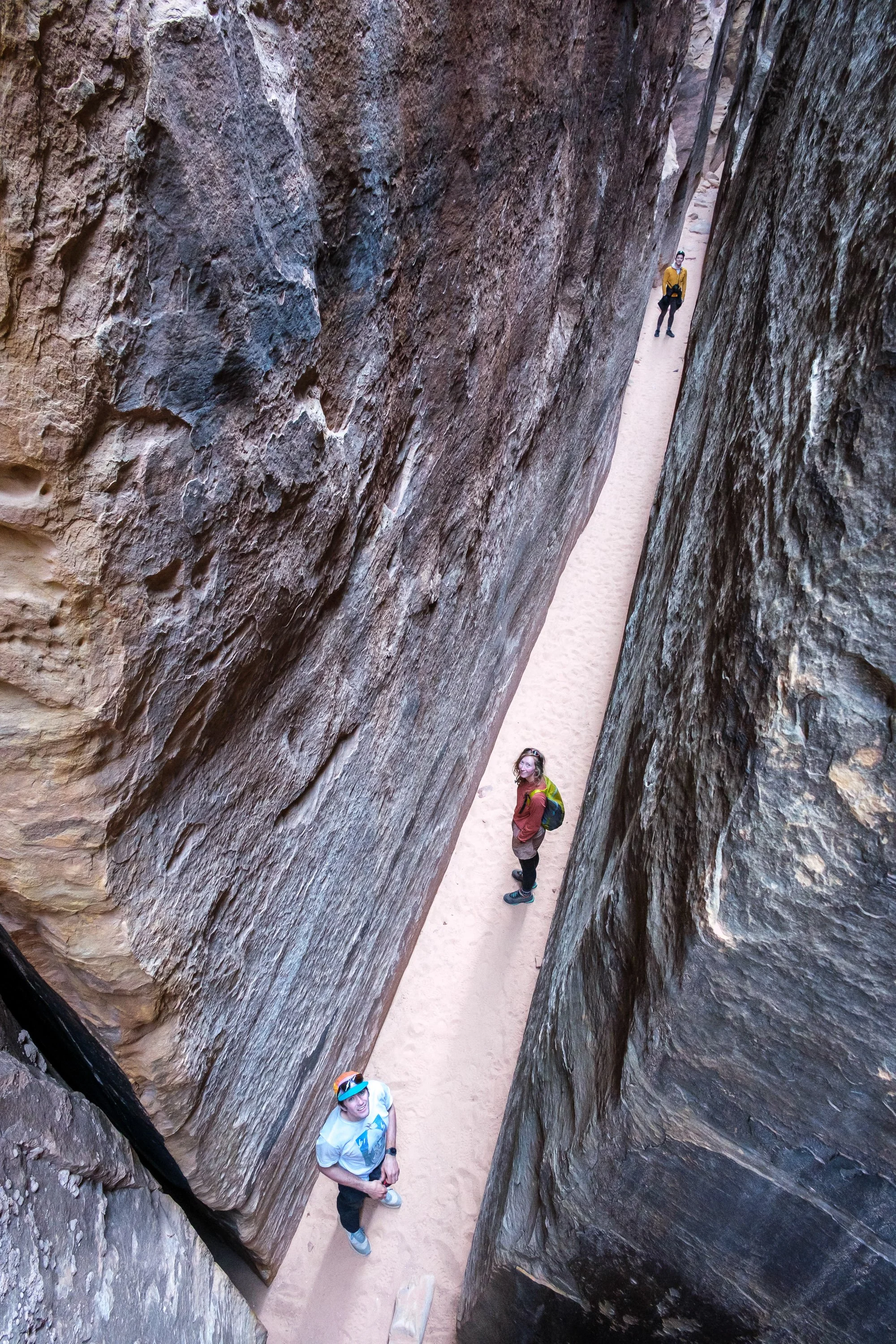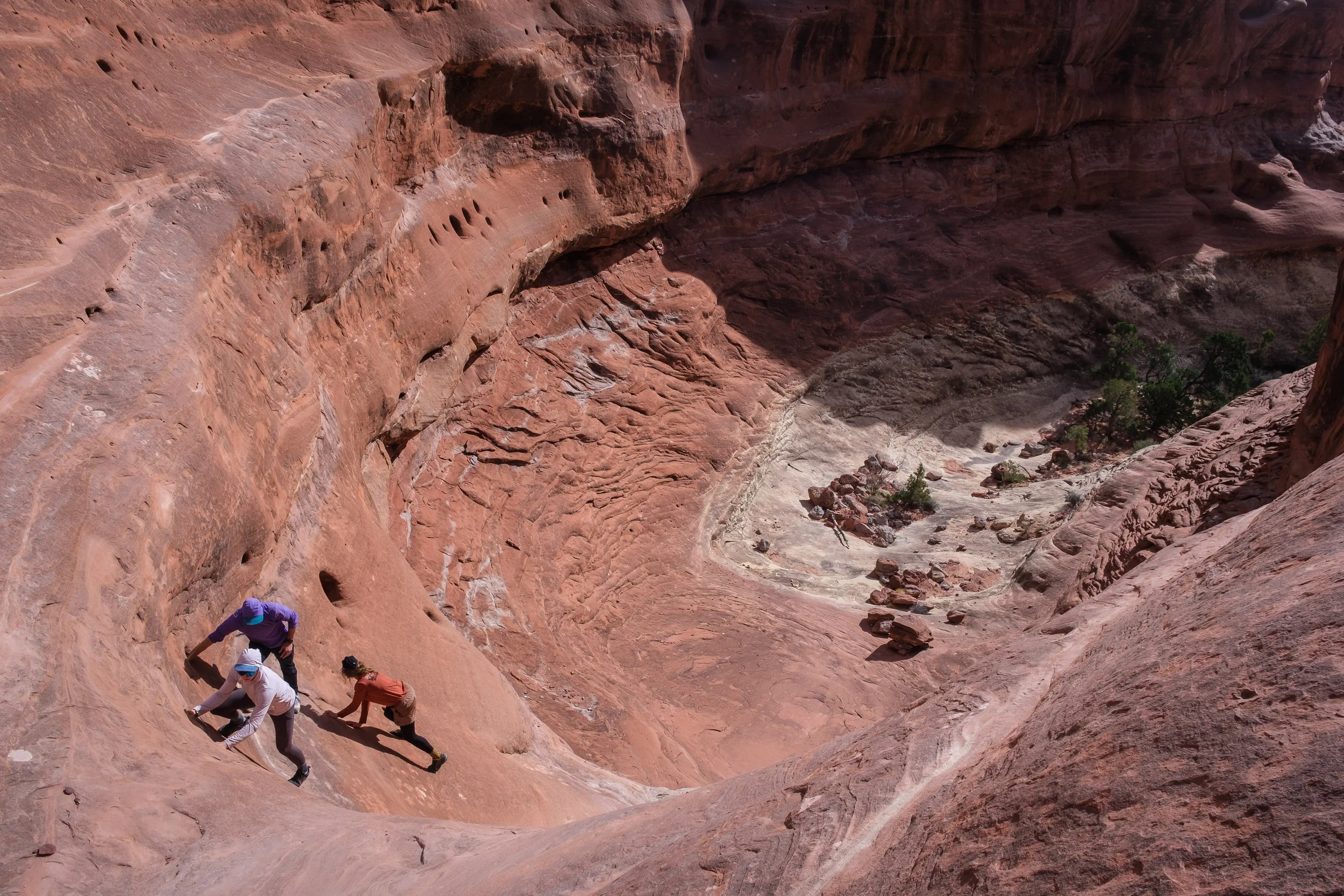There were plenty of day hikers heading out as we made our way up Elephant Canyon, but by the time we arrived at Druid Arch, we had the whole place to ourselves. The arch is truly striking, and I had a bit too much fun scrambling upcanyon to the back side of the arch in pursuit of more angles to photograph from. In my excitement, I jumped down a steep section of slickrock without realizing that it was quite hard to reverse the downclimb. After snapping my picture, I quickly realized I had trapped myself on an isolated block of rock with no way off - steep cliffs on three sides, and the irreversible downclimb on the fourth. After a few desperate run-and-jump failures, I did what any younger brother would—I yelled to Adam to come help me. Adam made his way over to inspect my shameful predicament, and, after gleefully photographing my stuck self, we made a plan. Adam would crouch at the top of the downclimb, and I would run and jump, reaching as high as I could to grab onto him to steady myself before climbing back up the slab. It was a great plan: the only way that this could make the situation worse was if I pulled Adam off his stance and got him stuck with me, which, naturally is exactly what happened. With a partner assist and some good, old-fashioned Weld boys ingenuity, we both made it back up unscathed and with a funny story to tell.
