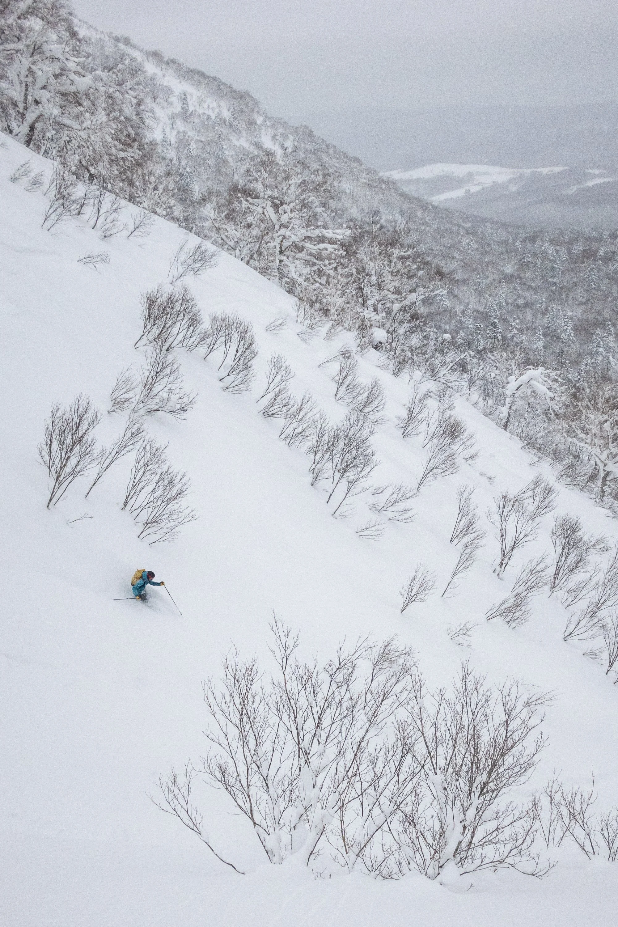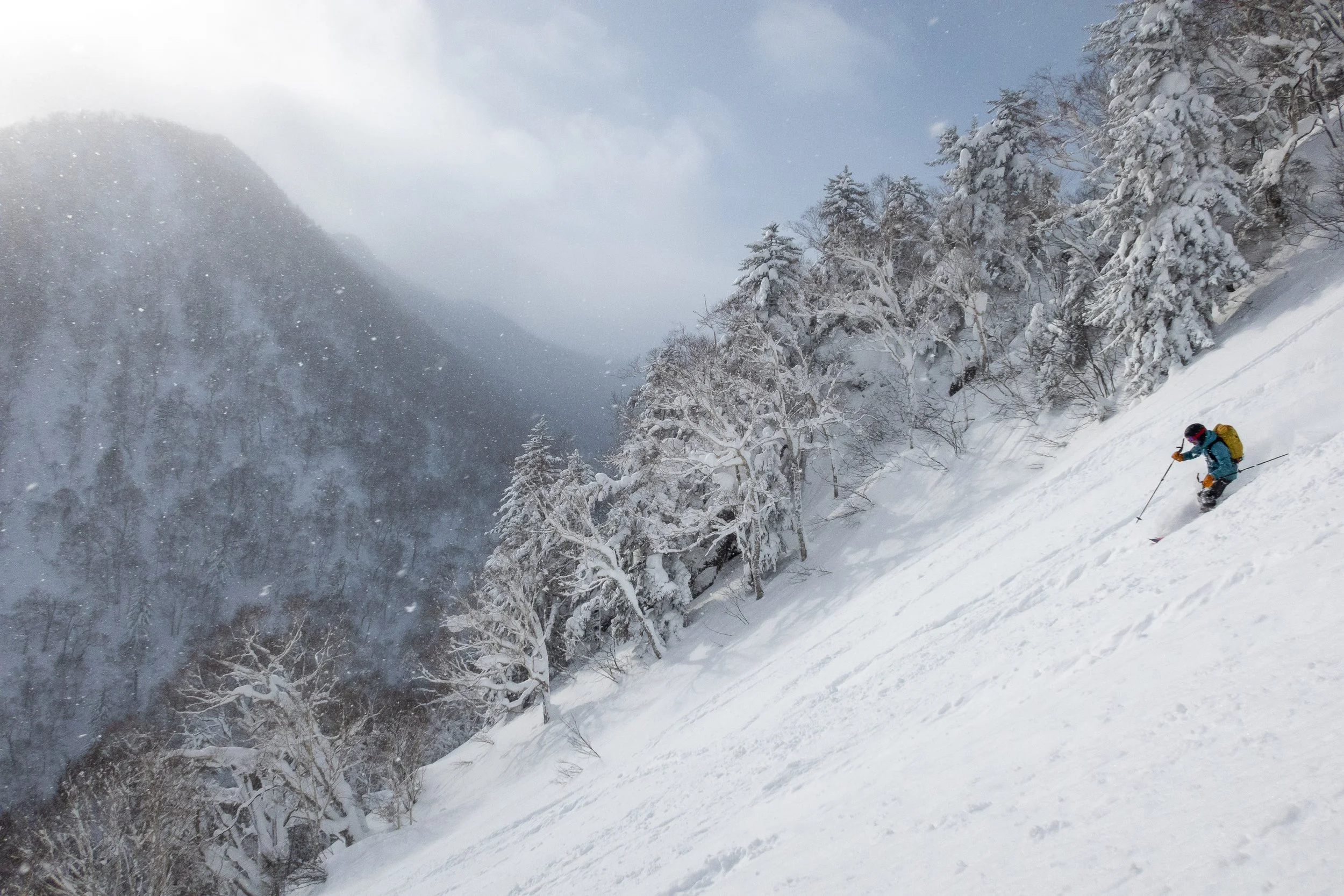 Day 1: After a delayed flight and a long snowy drive to Furano the night before, we got a slow start heading up to Furano-dake, the southernmost mountain in the Tokachi Volcanic Group and part of Daisetsuzan (“Great Snowy Mountains”) National Park, one of the largest national parks in Japan. We met up with two of John’s friends at the trailhead, and headed out for some storm skiing below treeline. After a healthy dose of first day faffing, including heading up too early and getting split up on the skin track, we enjoyed several great (but short) laps of tree skiing.