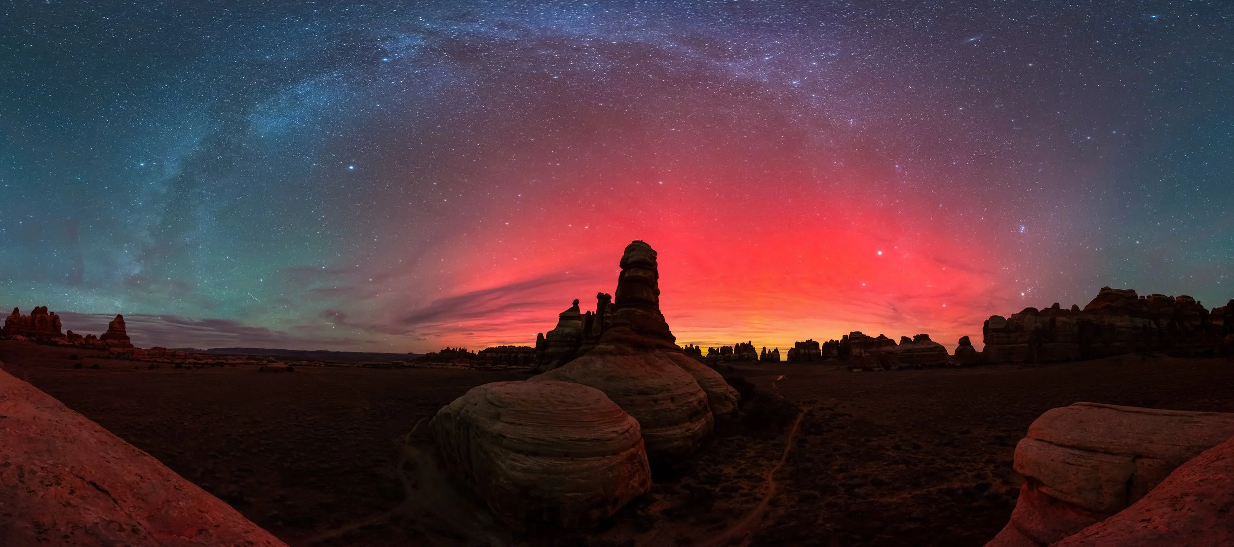 Chesler Park and its sandstone formations under the Milky Way and the Aurora. This is a panorama stitched from 24 frames, each a 20 second exposure.