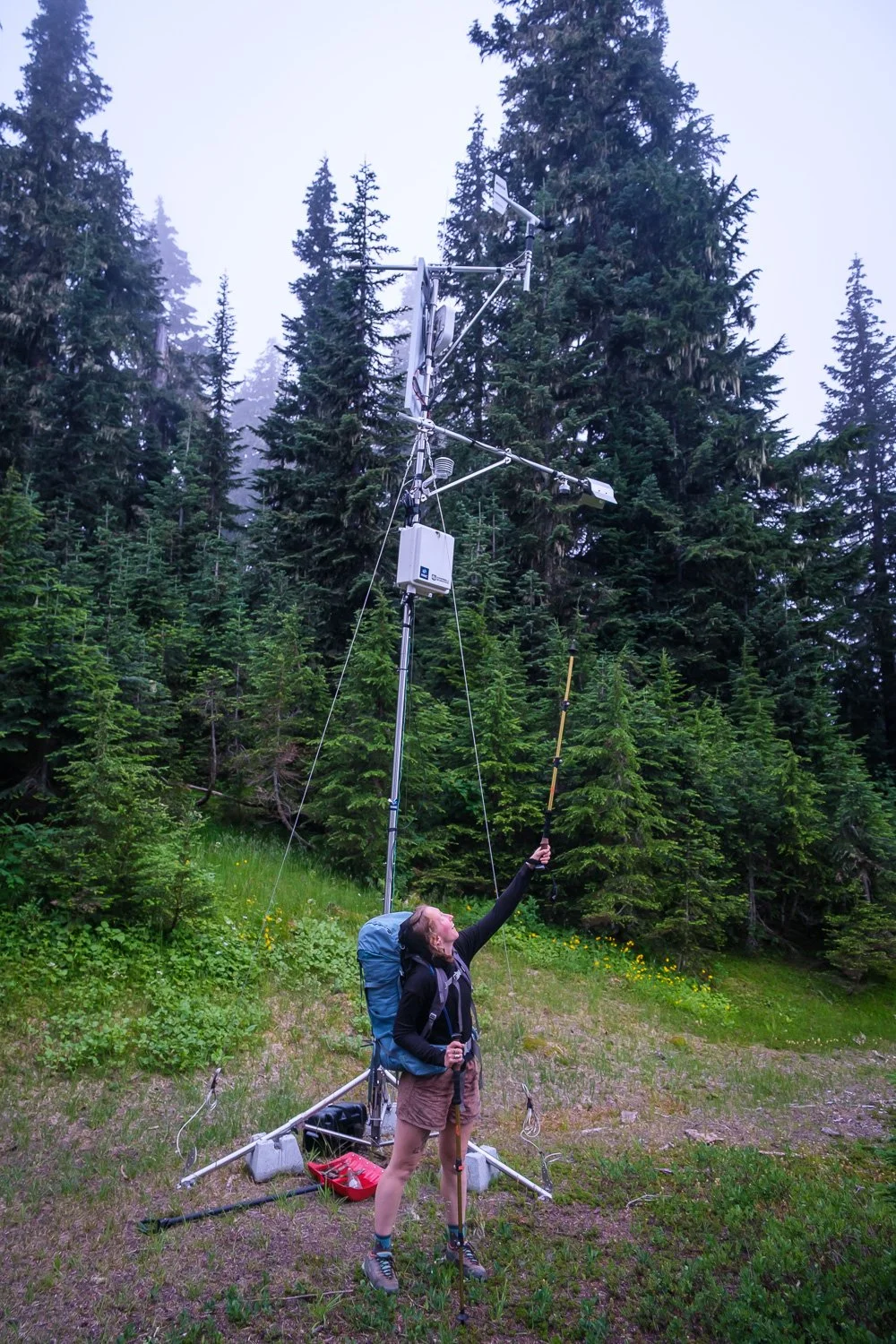 Helene inspecting the remotely-operated snow height gauge and weather station installed by the Northwest Avalanche Center.