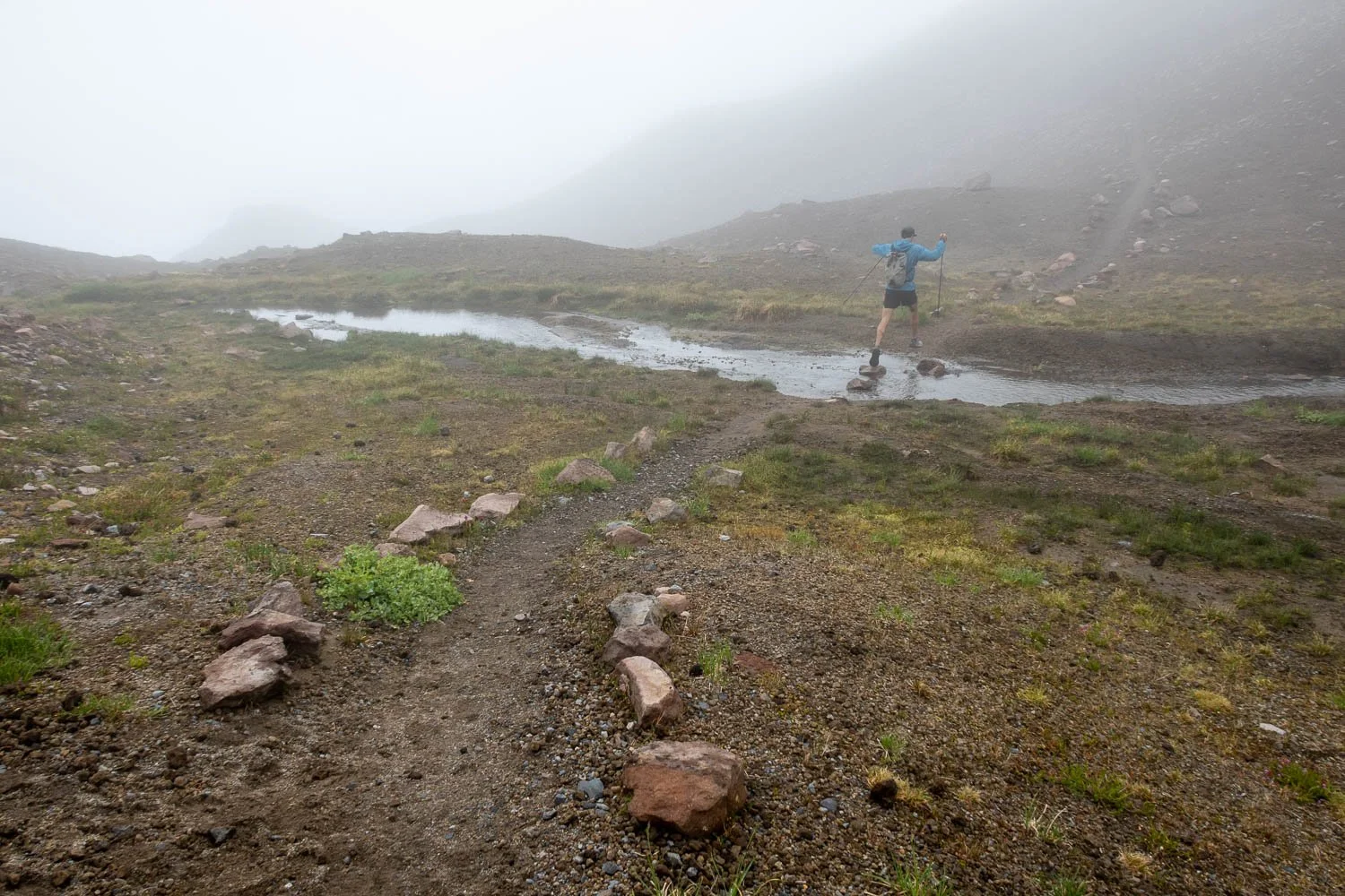 I desperately tried to talk Matt into tagging the Chimneys and catching me up, but he would have none of it. So, we started heading back towards the Wonderland Trail, going slowly through the mist. We made it back to Panhandle Gap and continued south, following the trail as it wraps around the headwaters of the Ohanapecosh River. I felt badly that after pitching Matt on a “trail run” I was barely keeping a decent walking pace, but Matt, like an overly-loyal dog, was content to trot a few paces ahead of me, occasionally stopping to look over his shoulder to see how far I had fallen behind.
