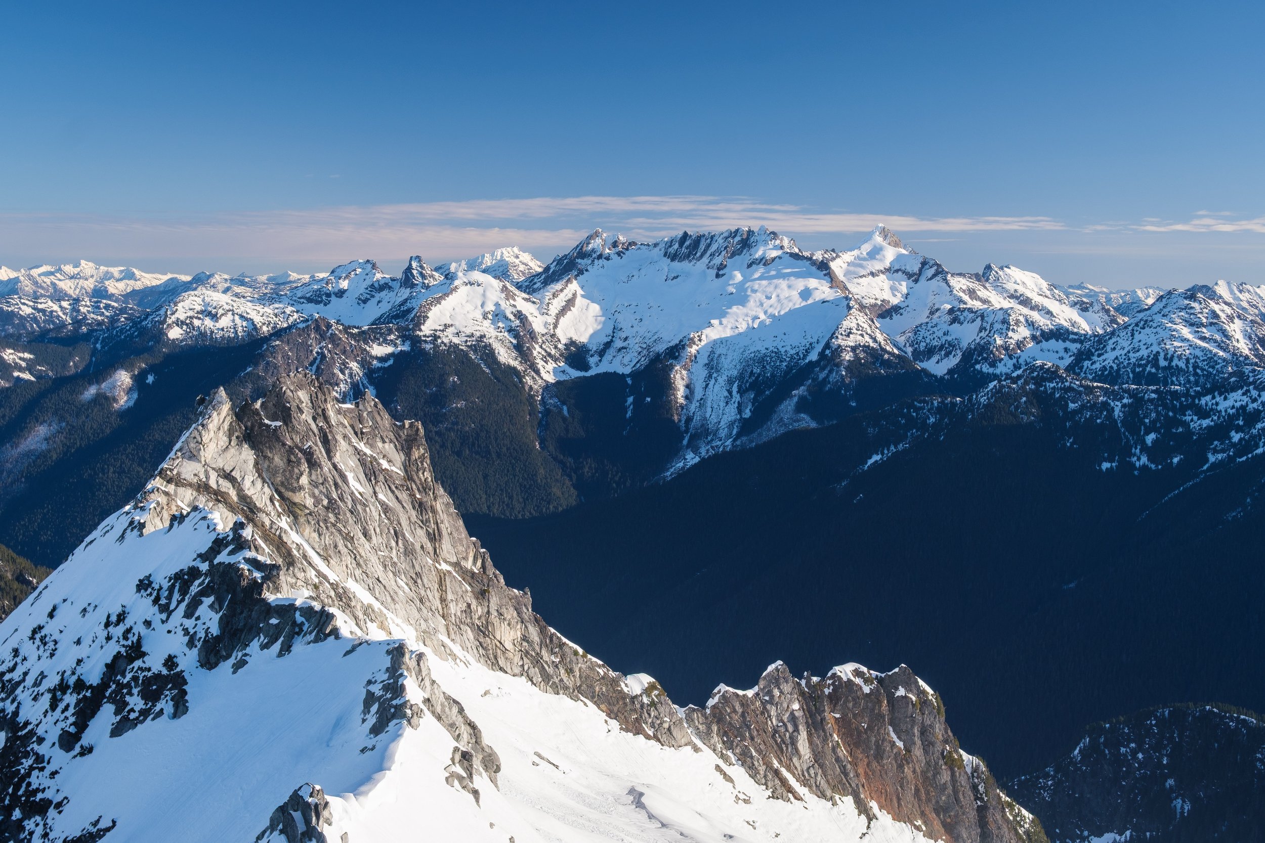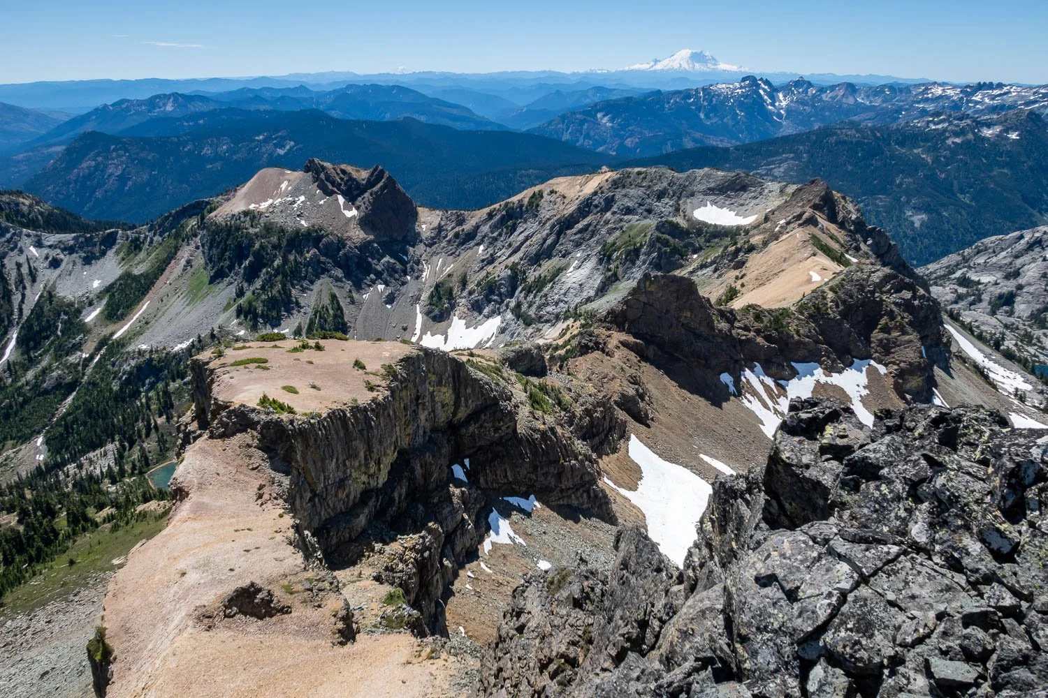 Second time’s the charm for this self-portrait of Helene and I, with Pugh in the center of the image, Sloan looking spiky to the right, and the Monte Cristo Peaks to the right of that. Forgotten Peak closer at far right, with Del Campo and Rainier faintly visible behind it.
