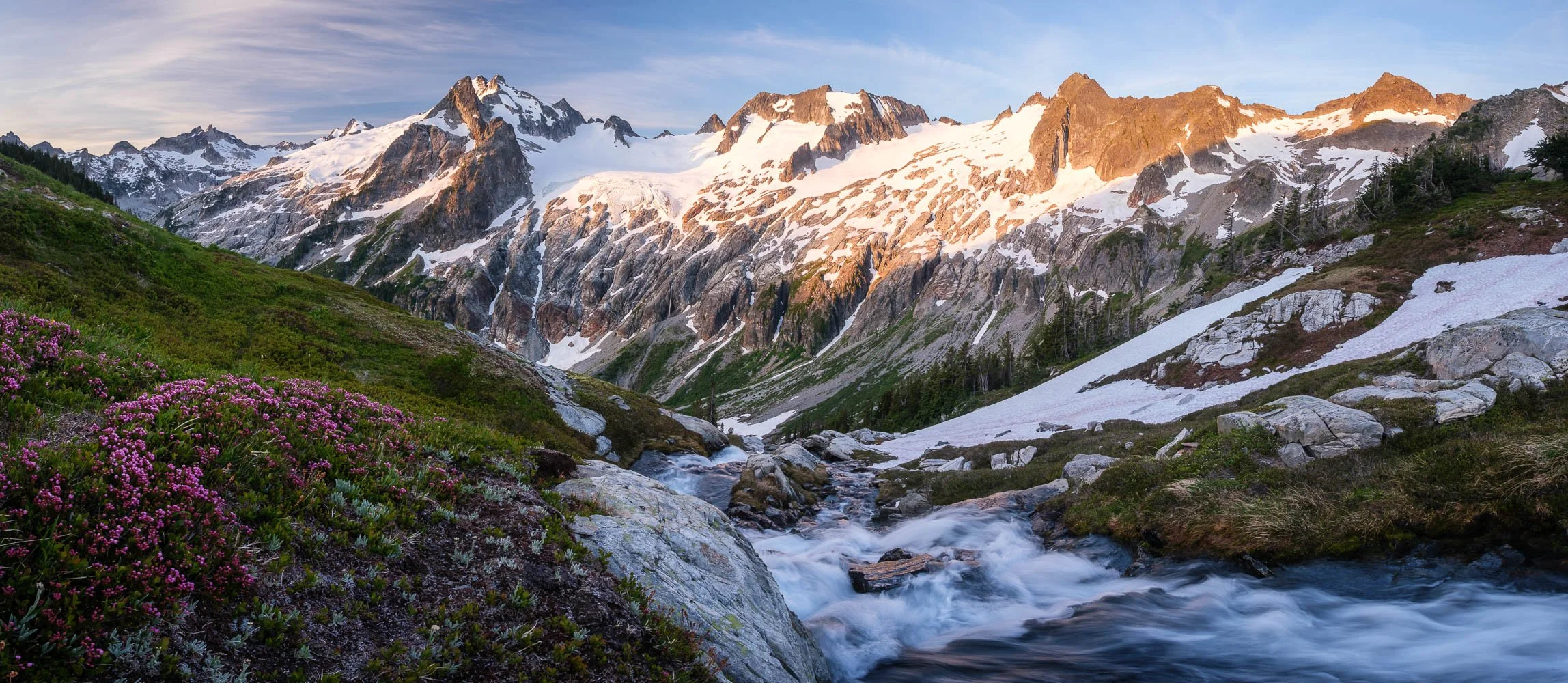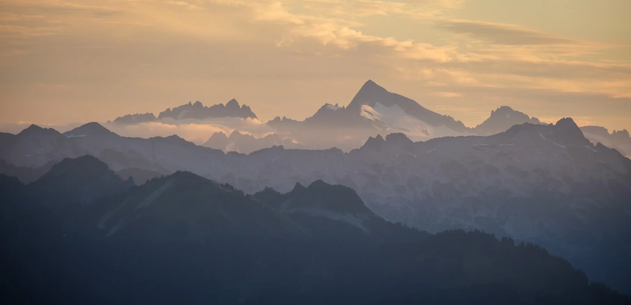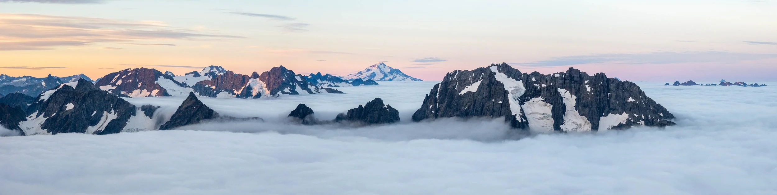 Morning panorama from the summit of Cosho. From L>R: Goode, Logan, Buckner, Sahale, Boston, and Forbidden.