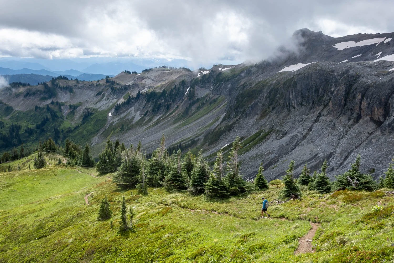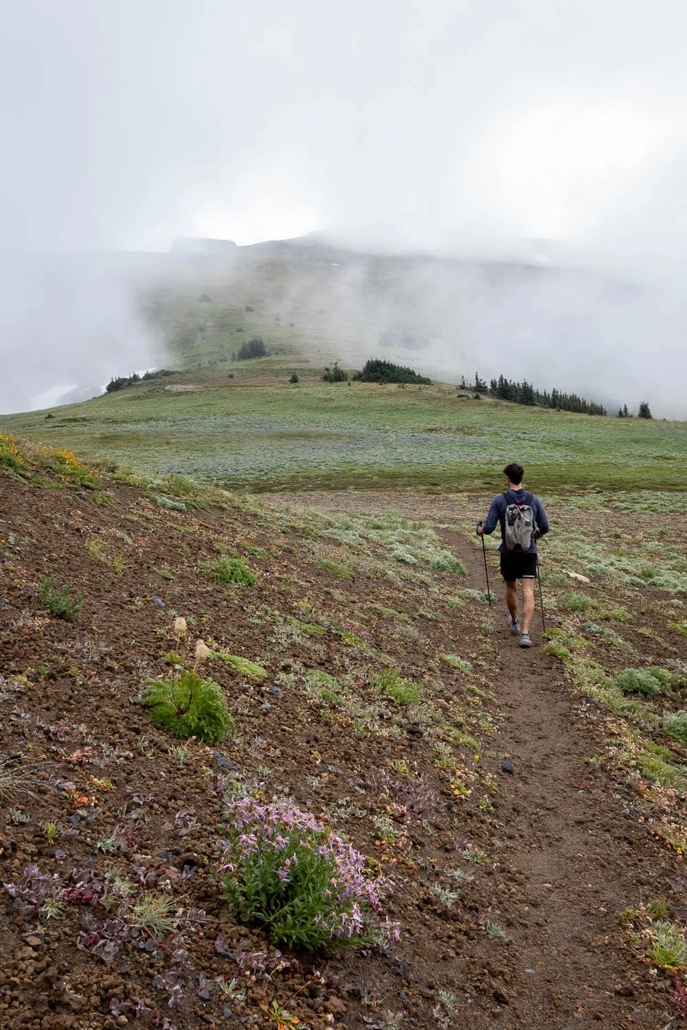 Heading off the Wonderland Trail towards Banshee Peak, hidden in the clouds.