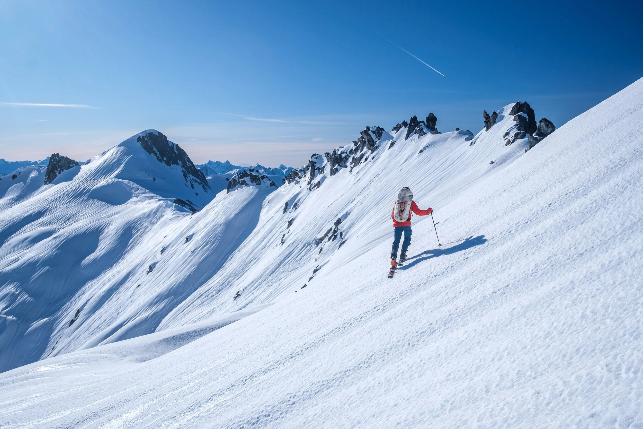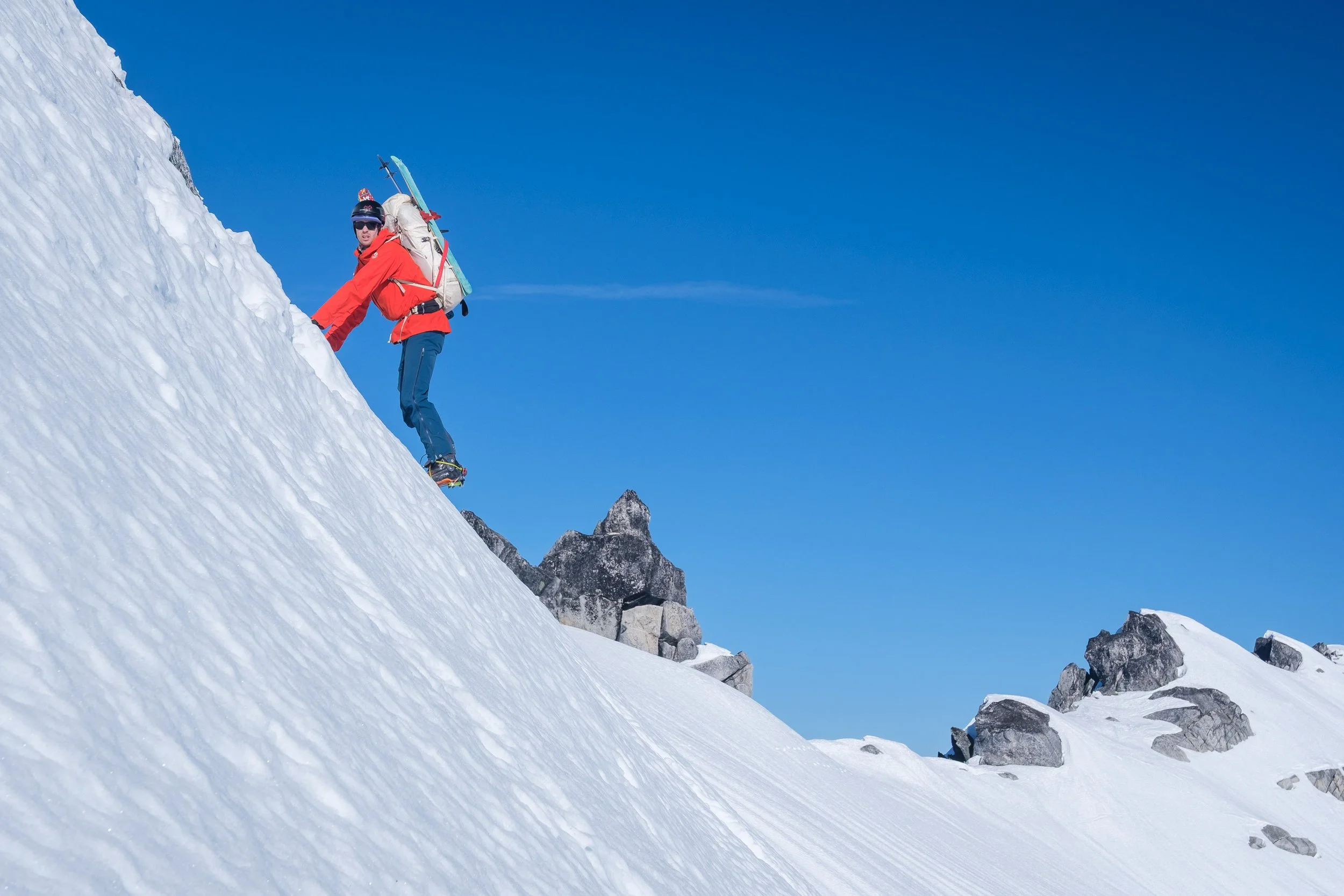 Back at camp, having skipped Big Devil, we had plenty of time for our exit, so we decided to spice things up by traversing along the ridge to the southwest directly to Pt. 6,844, staying above the Monogram Glacier. Firm skinning with ski crampons quickly gave way to steep frontpoint traversing with heavy packs and boot crampons through the steepest part, but quickly we were on the summit, ripping skins for our last descent.