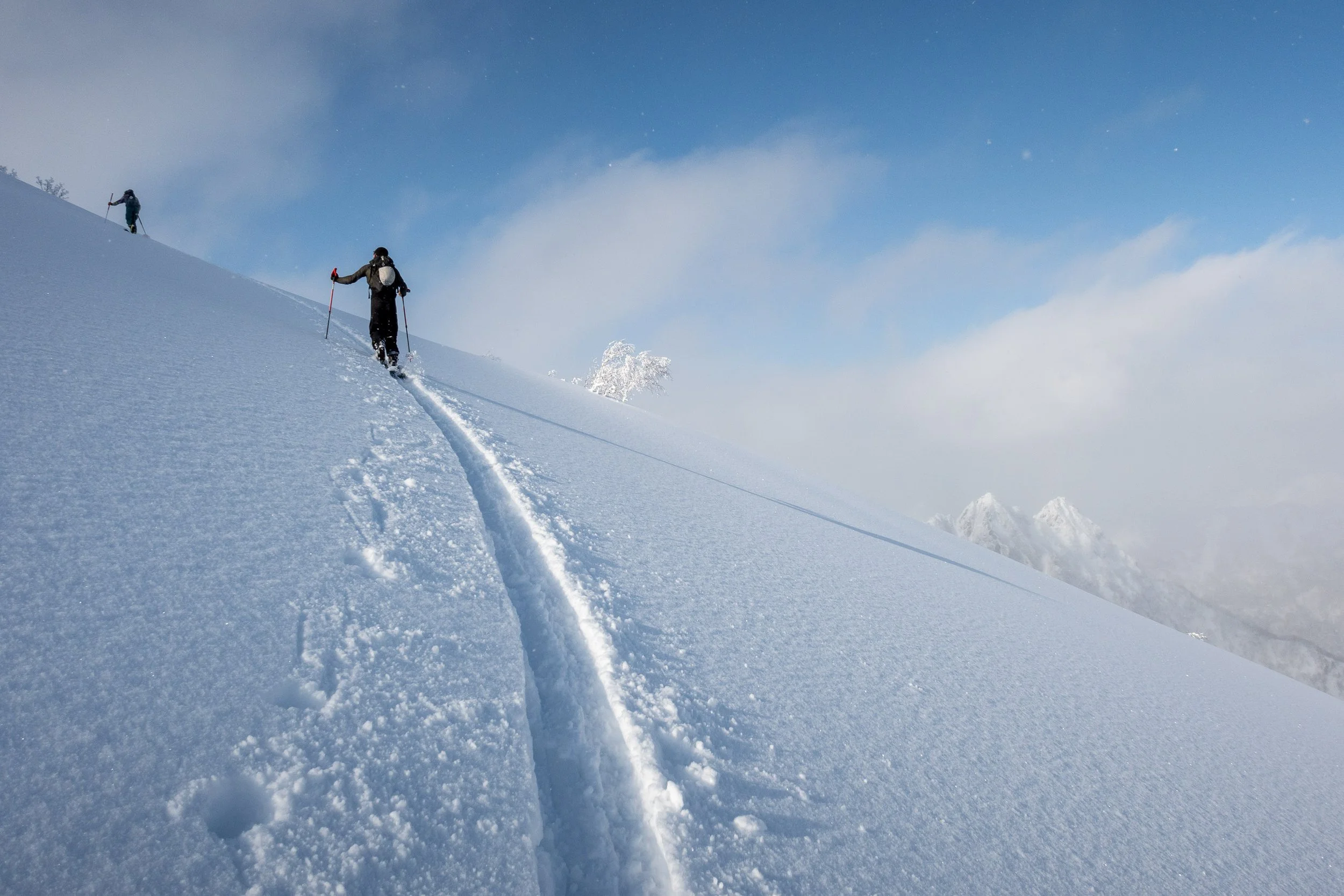 Adam and Will on the skintrack below the false summit of Ashibetsu-dake