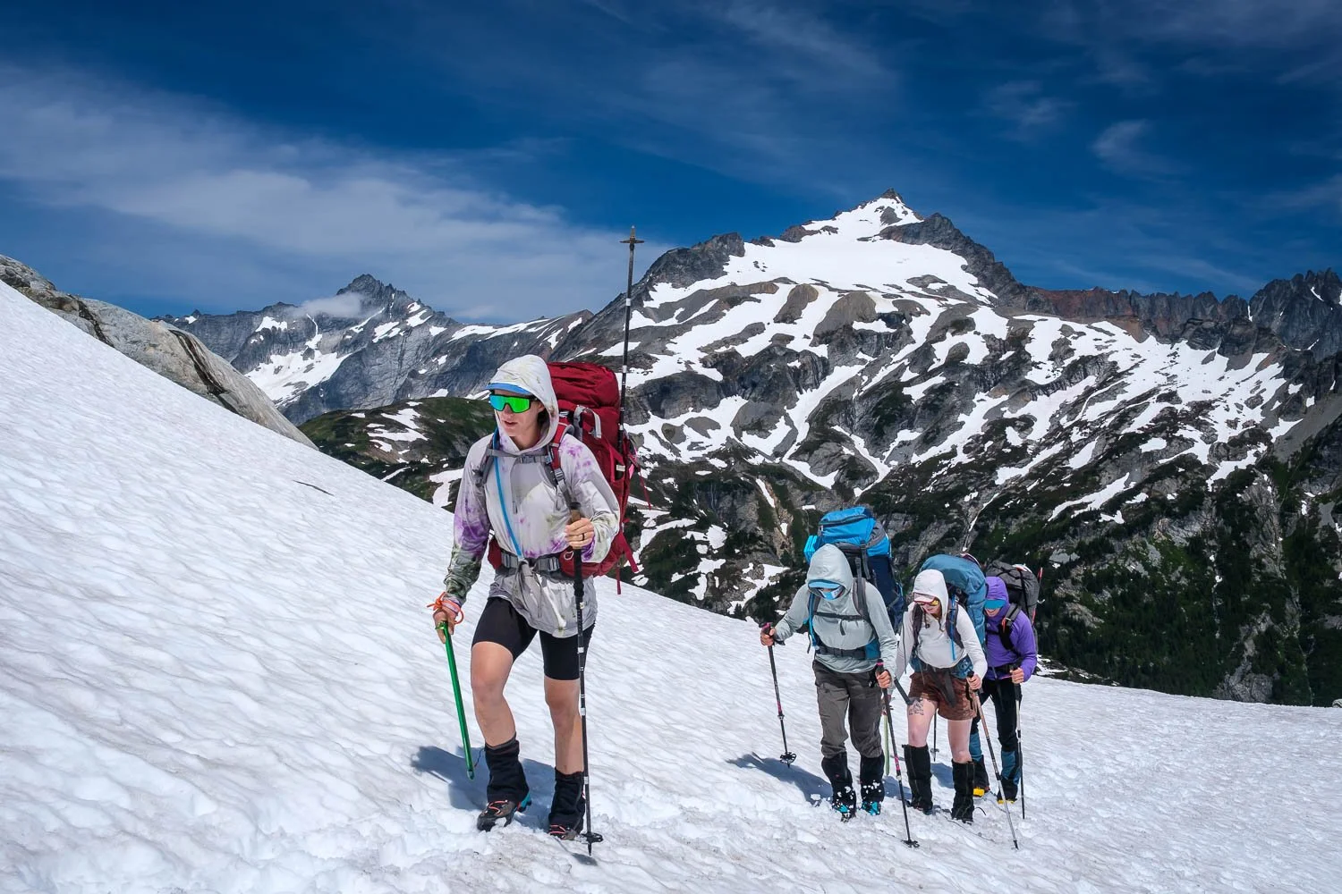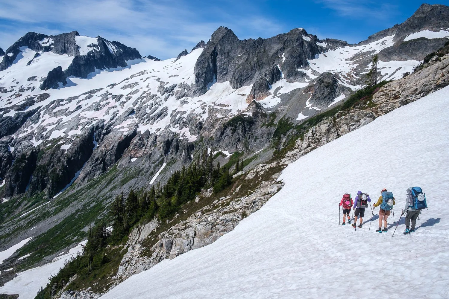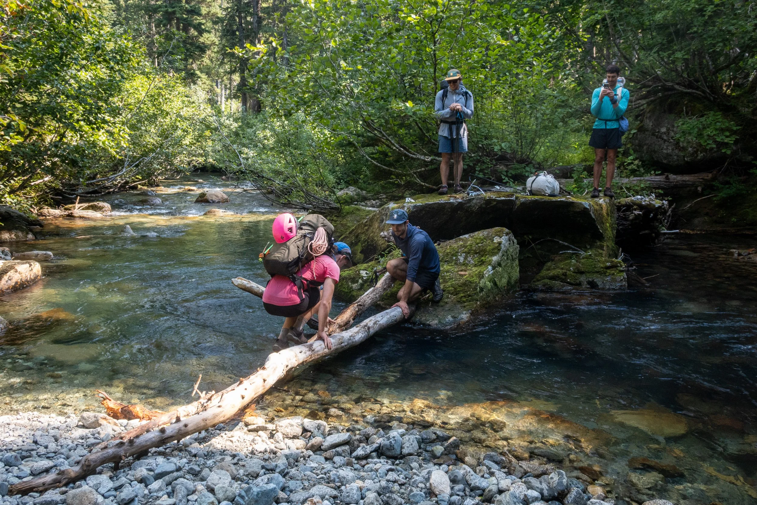 We drove up from Seattle and camped nearby for an early (or just earlier) start, which was still slow with some faffing setting up the car shuttle. We started up the Sigurd Creek trail a bit before 10am, climbing through steep forest for a few miles before crossing Sigurd Creek. The old bridge had washed out years earlier, so the four of us where about to pull our shoes to wade through the calf-deep water, but Matt, ever the construction manager, dragged a log out of the woods and threw it across the creek to make a rickety bridge.