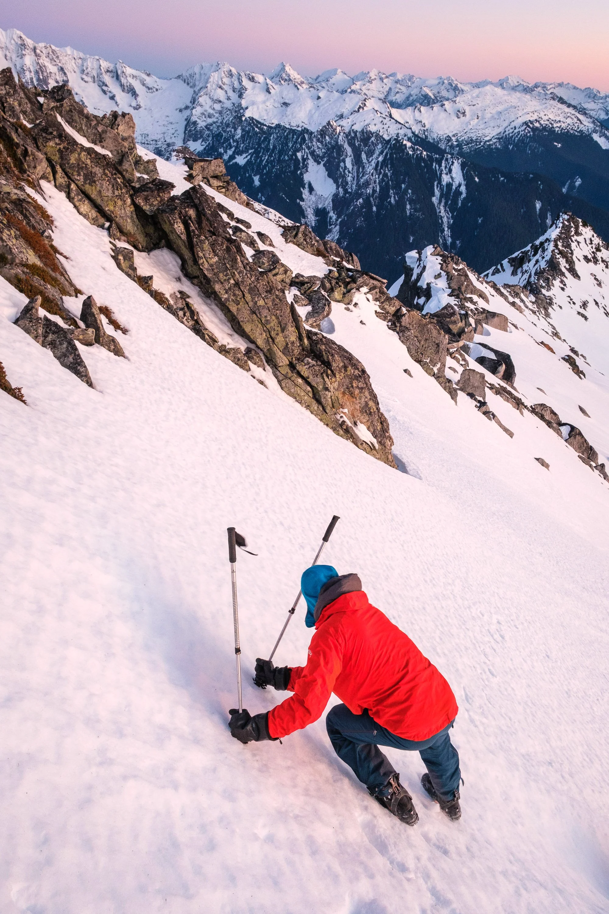 We found a sheltered spot for our tent near some big boulders, and got to work digging a tent platform and wind wall, melting water, and making dinner. A few hill sprints before getting into our sleeping bags meant we were nice and cozy overnight, with temps in the low twenties. After plenty of hours of darkness, I got up before sunrise and wandered up the hill to the west to enjoy great views of the Southern Pickets.