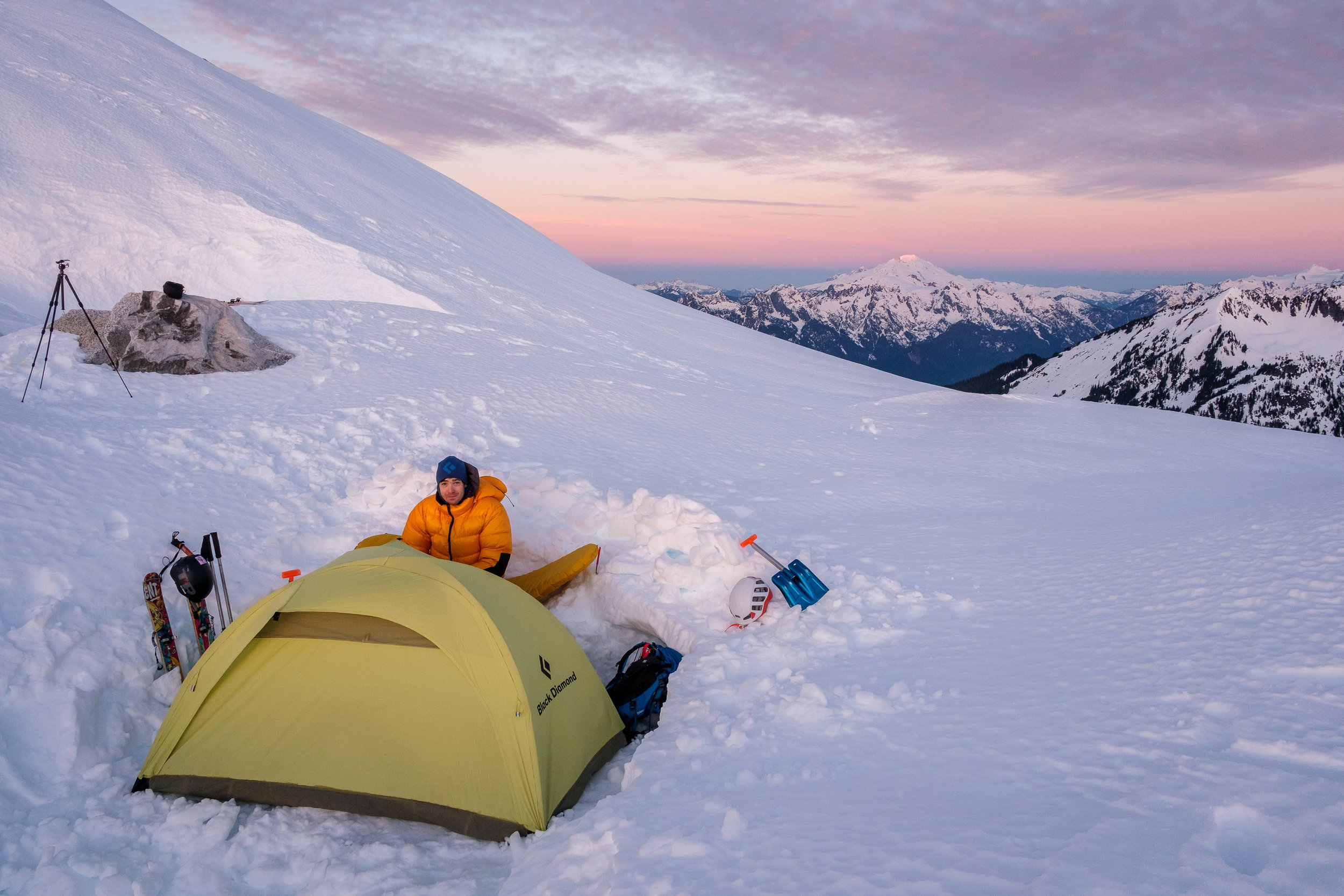 Matt cozy at camp as the first light of the day hits the summit of Baker