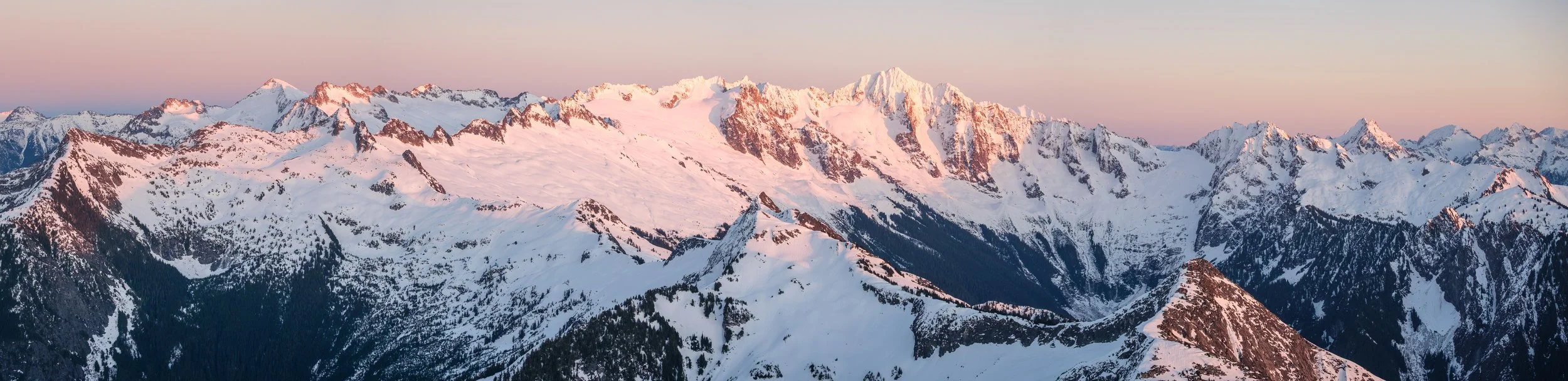 The sun setting just behind Sloan Peak, in a panorama from the summit of Johnson Mountain. Bedal and Pugh are the next major summits to the right of Sloan, with Whitechuck peaking out from behind Painted Mountain, and Mount Baker to the right.