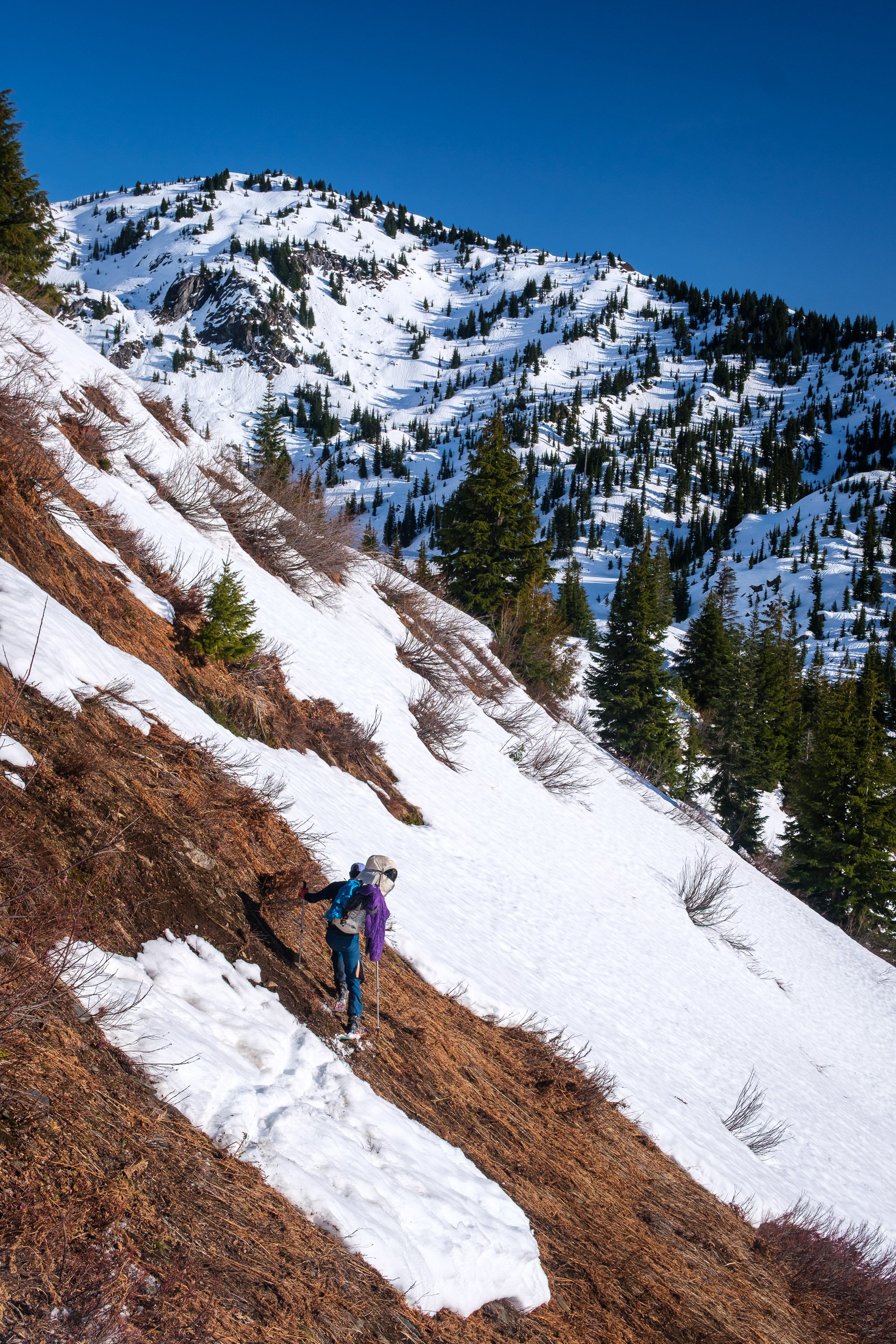 I left my overnight gear at camp, and the newly united three dudes set off for The Three Dicks. We continued along the lovely path on the ridge for another 10 minutes or so, before the ridge steepened and looked more challenging. Here, we dropped easily onto the north side of the ridge (a short bit of 30 degree snow), then walked on easy snow to the “key col” (48.51726, -121.17455) where we crossed back to the south side of the ridge. It looked pretty steep on the south side of the ridge, but it went easily with a tiny bit of class 2/3 scrambling. In the basin below, we traversed talus and snow, crossing an easy rib and staying at around 6,500 feet to stay below the South Buttress of the Western Dick. Once in the main basin south of The Three Dicks, we climbed up easy snow and slabs to the saddle immediately south of The Eastern Dick, between it and Pt. 7,200+.