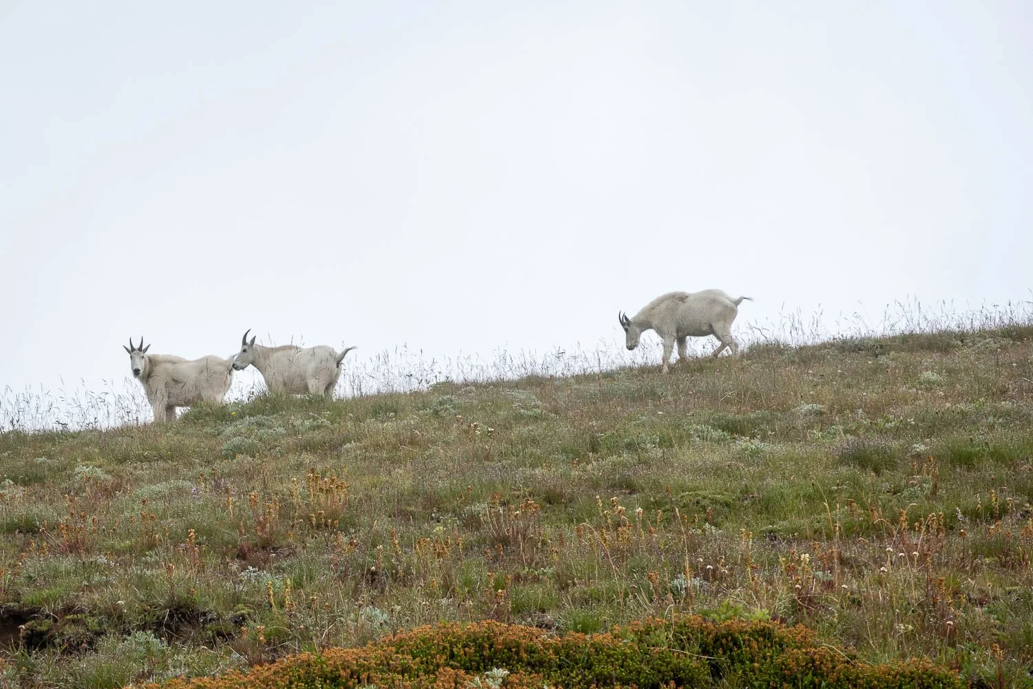 We woke up to a beautiful, crystal clear dawn, with a few lingering blobs of clouds hanging around the summits to the south. We had a fun time scampering around taking photos and finding not only a few mountain goats, but a few game cameras placed by the Tulalip Tribe to track said goats.