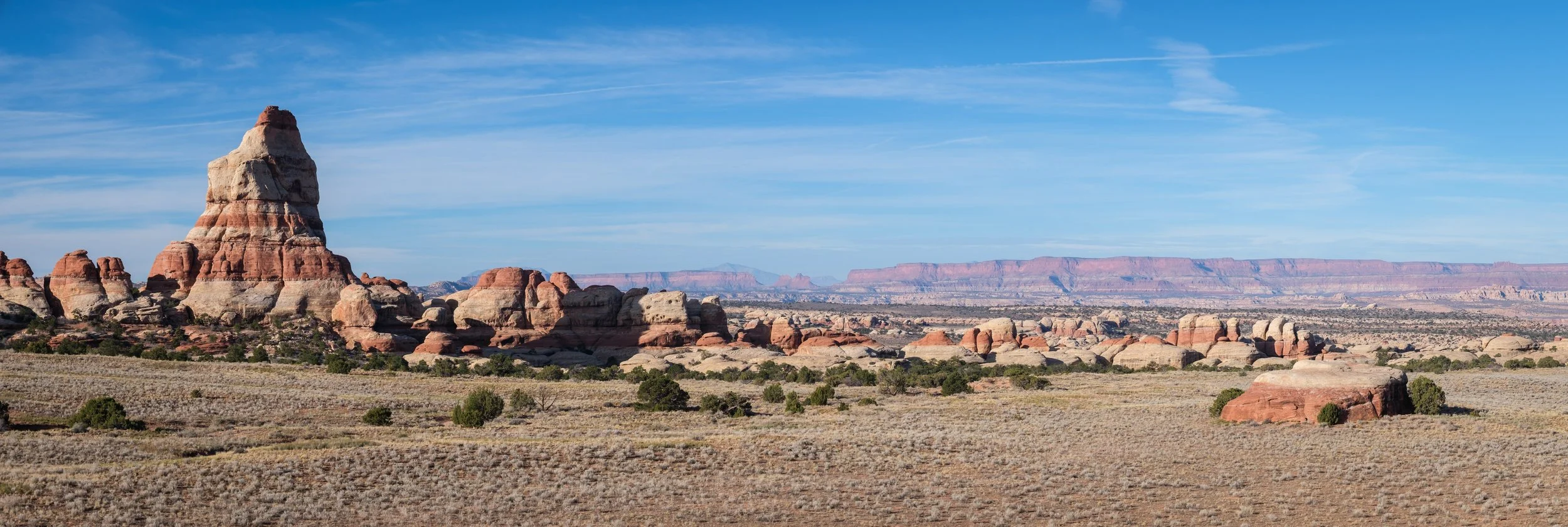 Chesler Park in the morning light, looking across the Colorado River to the Maze District in the distance
