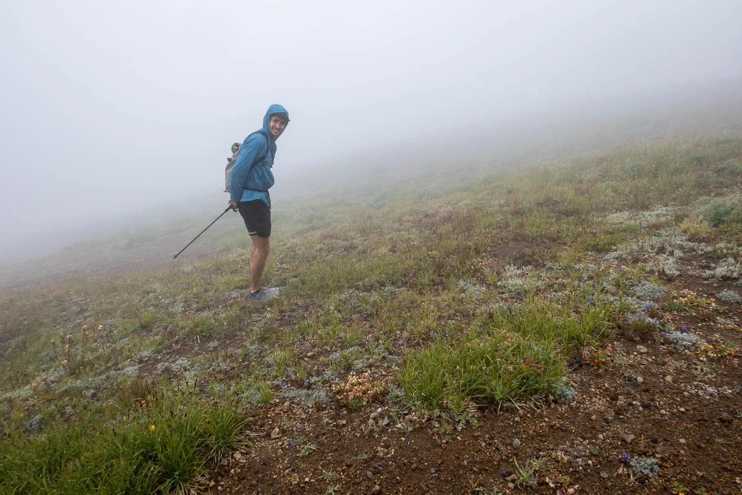 We dropped Matt’s truck at Ohanapecosh and headed back over Cayuse Pass to the Fryingpan Creek Trailhead before sunrise, where we enjoyed watching a true clownshow of parallel parking attempts while we enjoyed breakfast. Under overcast skies, we busted up the Wonderland Trail to Summerland, where the clouds accentuated the color of the wildflowers, which were still going strong for mid-August. We reached a socked-in Panhandle Gap (the highest point on the Wonderland Trail, which circumnavigates Mount Rainier) and set off cross-country, aiming (with some compass assistance) for Banshee Peak.