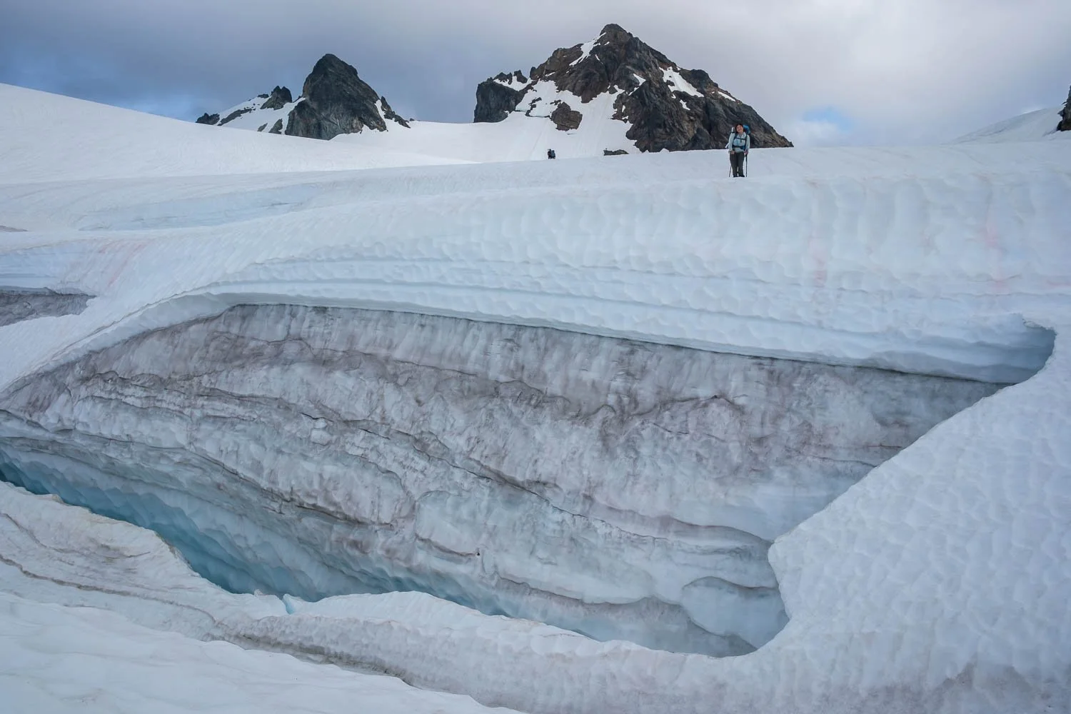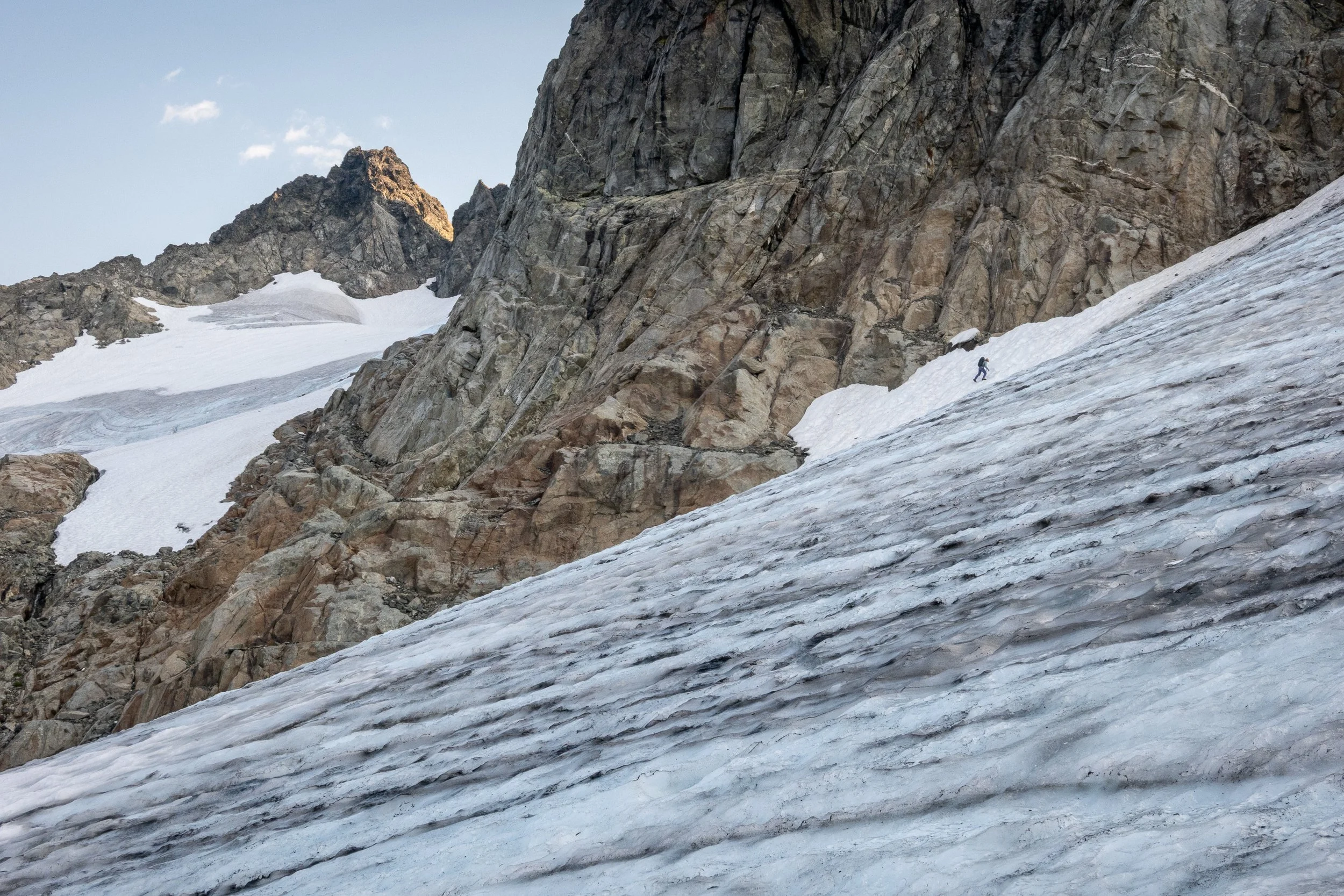 Eric looking small as he traverses above exposed ice on the southwest side of Serratus.