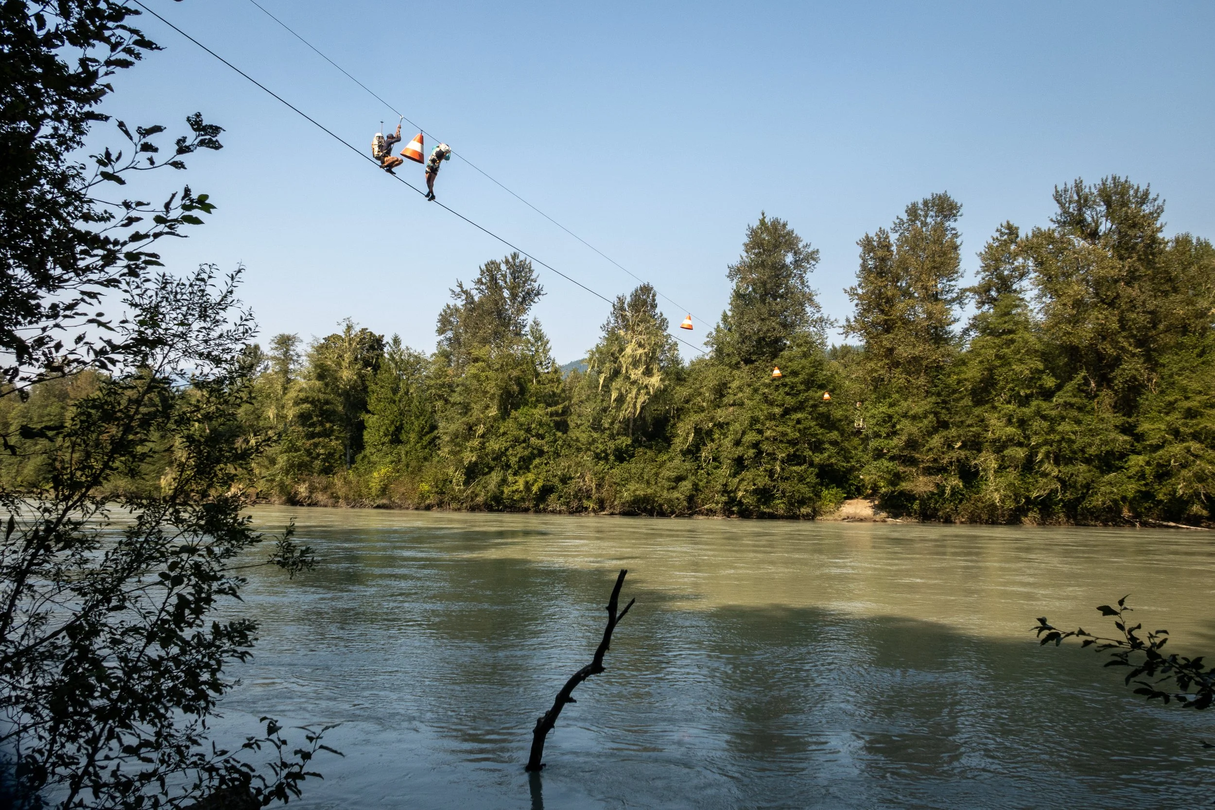 Matt and Austin, high above the Squamish River, swaying back and forth as they attempt to cross the cable to the far side.