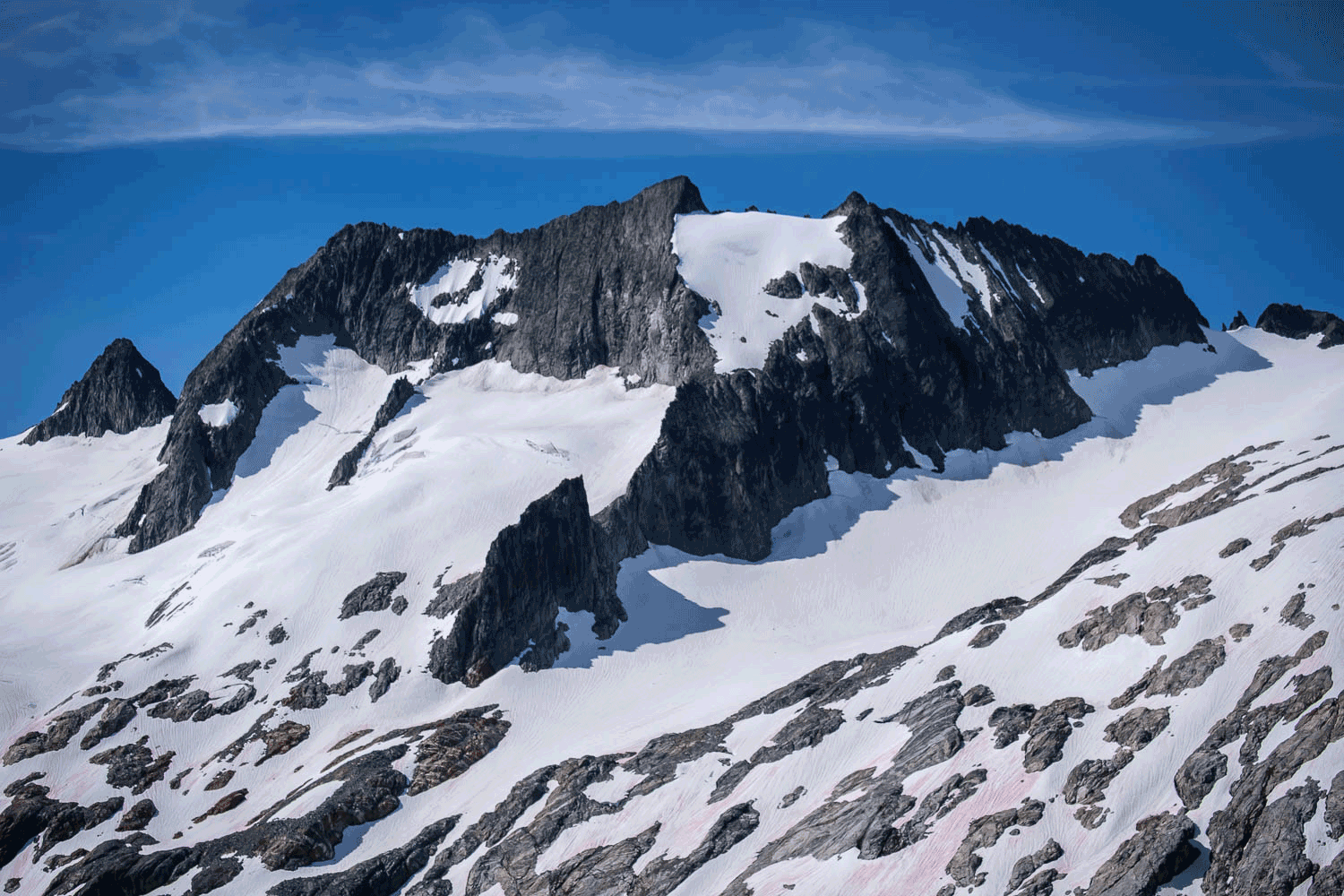 Mount Tantalus and the quasi-detached northernmost lobe of the Rumbling Glacier. This isn’t even the true summit of Tatnlus, just the northernmost end of the mile-long North Ridge.