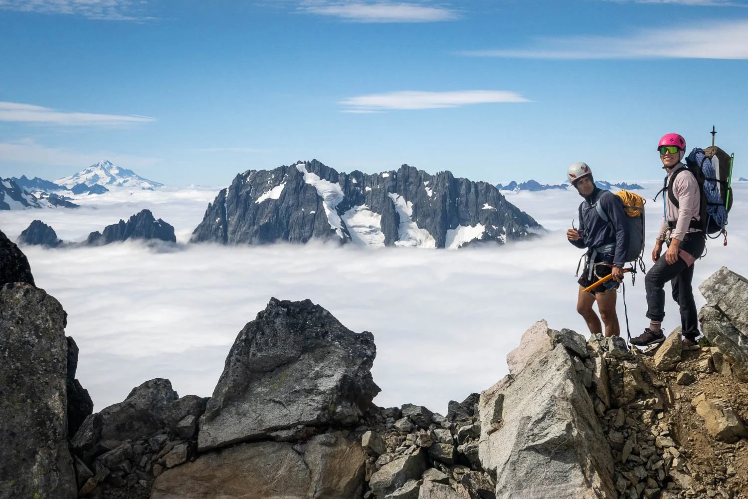 Matt and I on the summit of Banshee Peak, with the Cowlitz Chimneys hiding in the clouds behind us.
