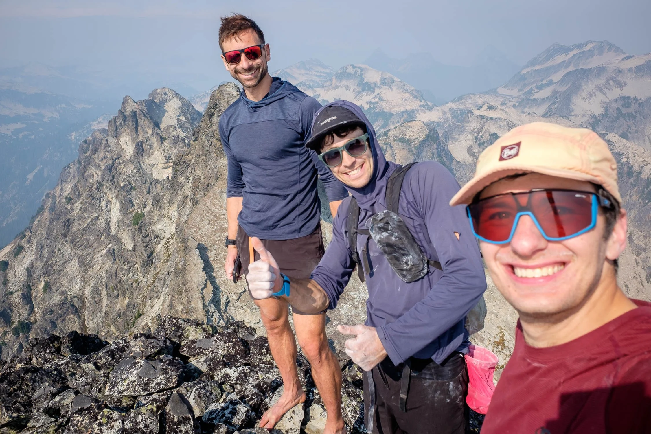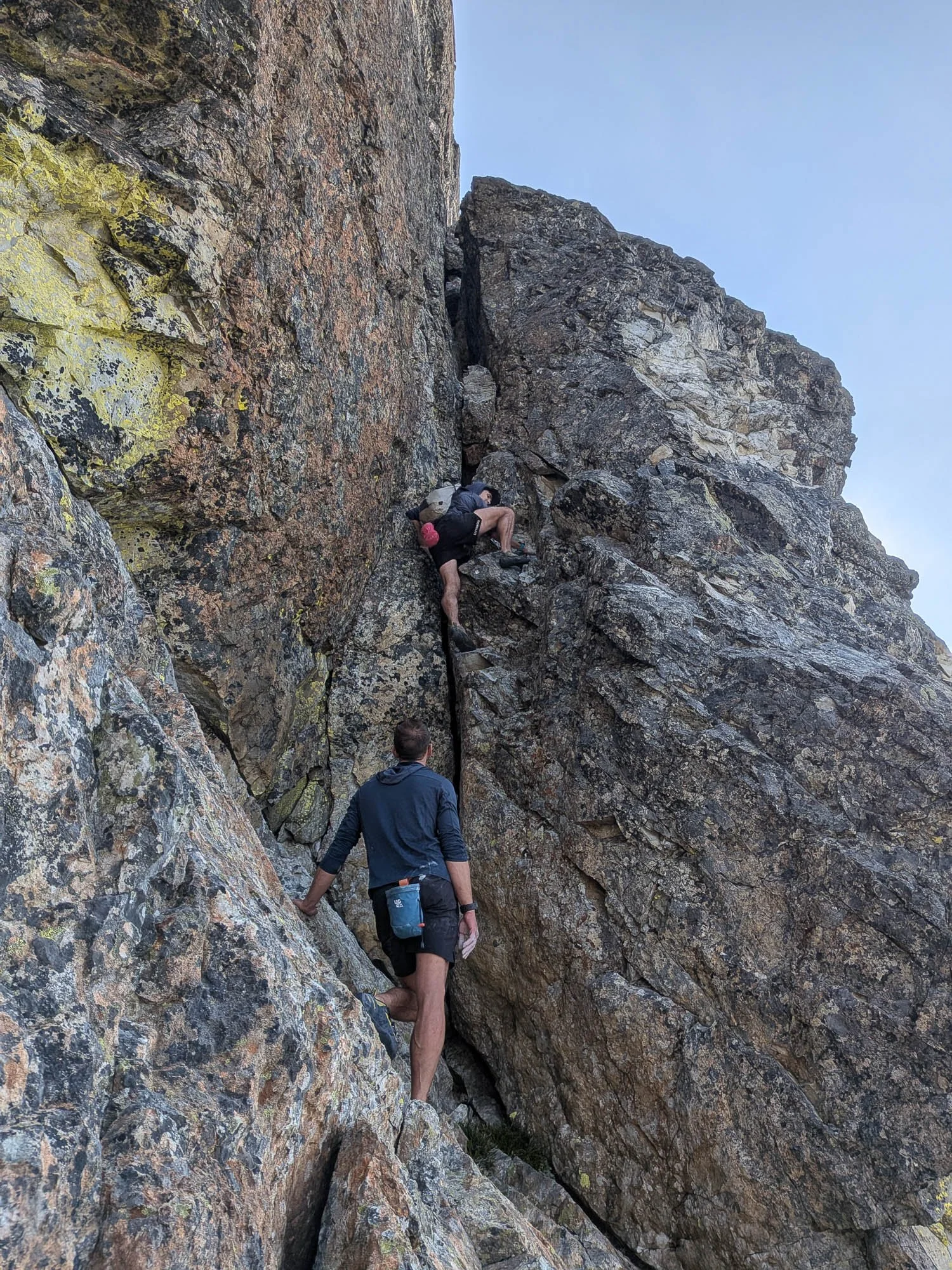 From the top of the slab, we needed to traverse around the west side of the mountain to reach the base of the easiest route up the final summit block. Rather than dropping a hundred feet to cross a gully, we traversed on some exposed scrambling up high, then walked up an easy heather bench for ~300 yards to reach the notch in the ridge immediately north of the summit. We dropped packs here, changed into rock shoes, and soloed up to the summit, accidentally making things a bit trickier by going too far climbers left at the start. When on route, the climbing was pretty easy but exposed and on chossy rock. The chimney itself was super fun, and it was easy above it to the true summit at 12:20.