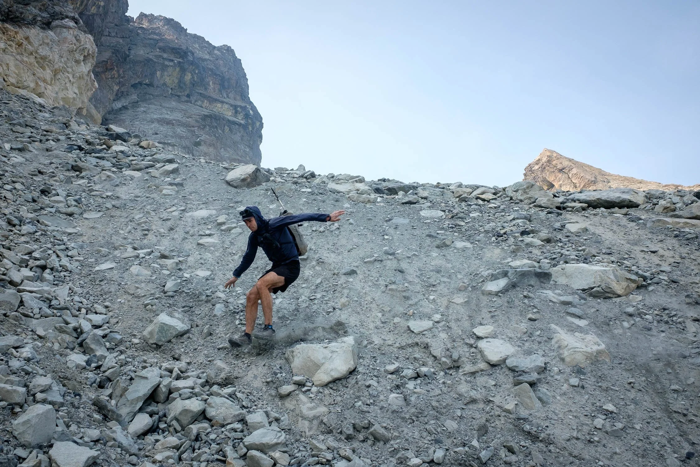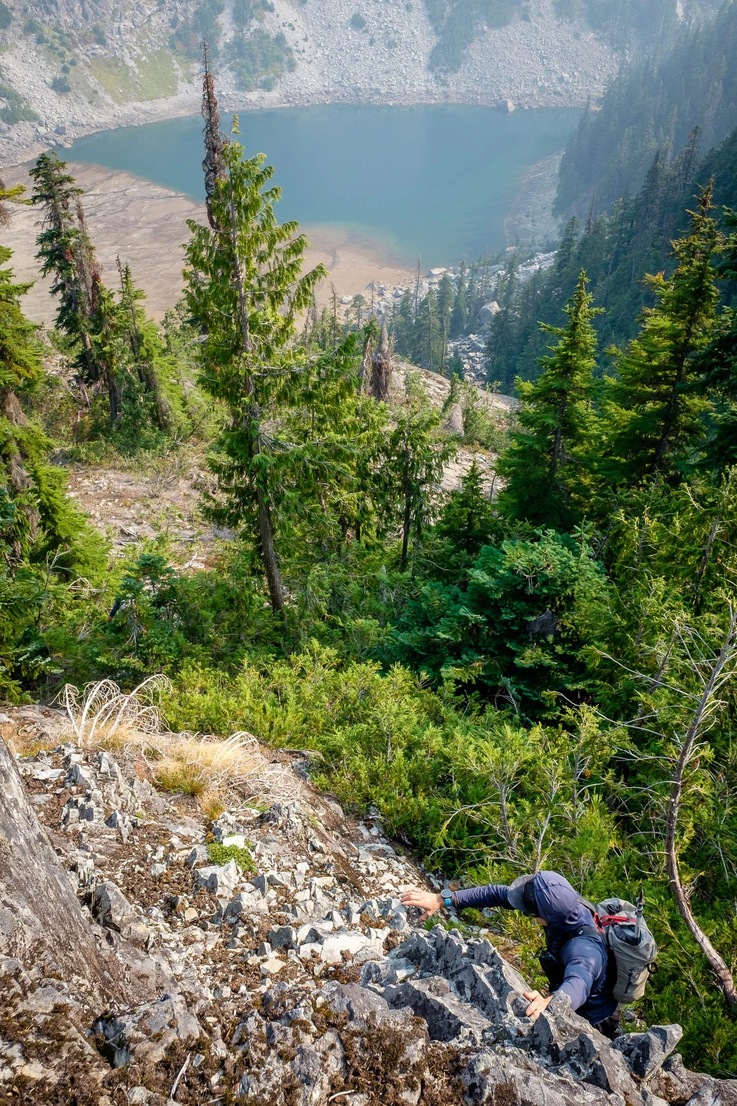 Matt downclimbing dirty cliff bands above Shovel Lake