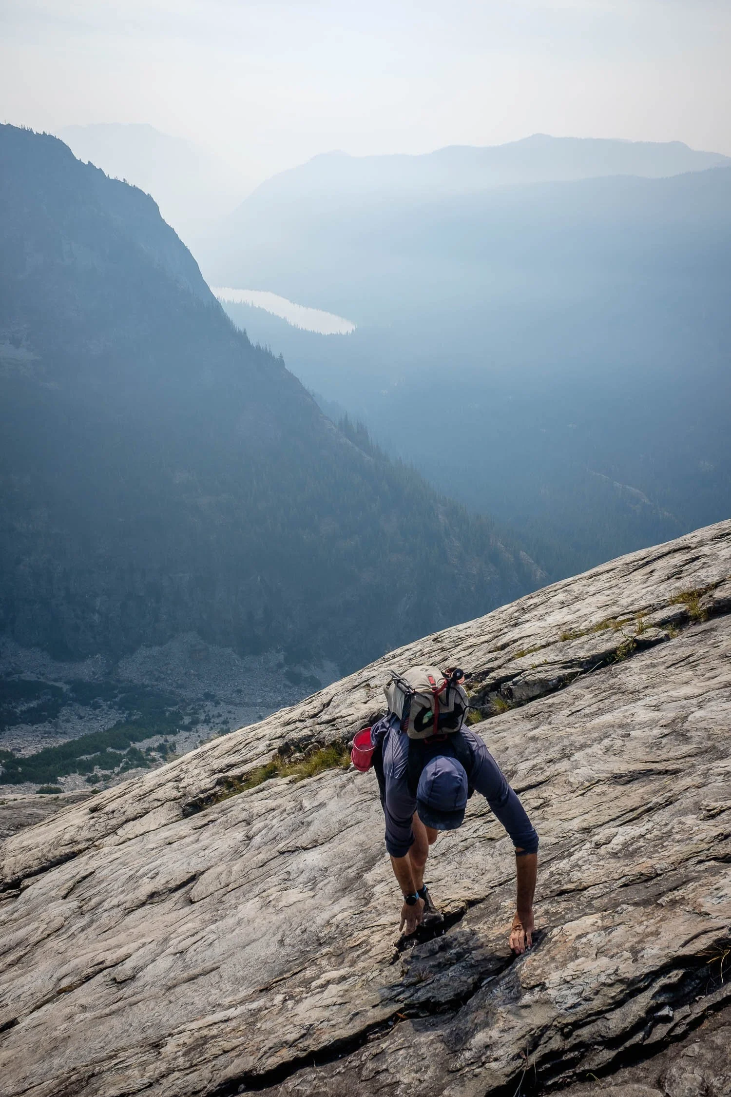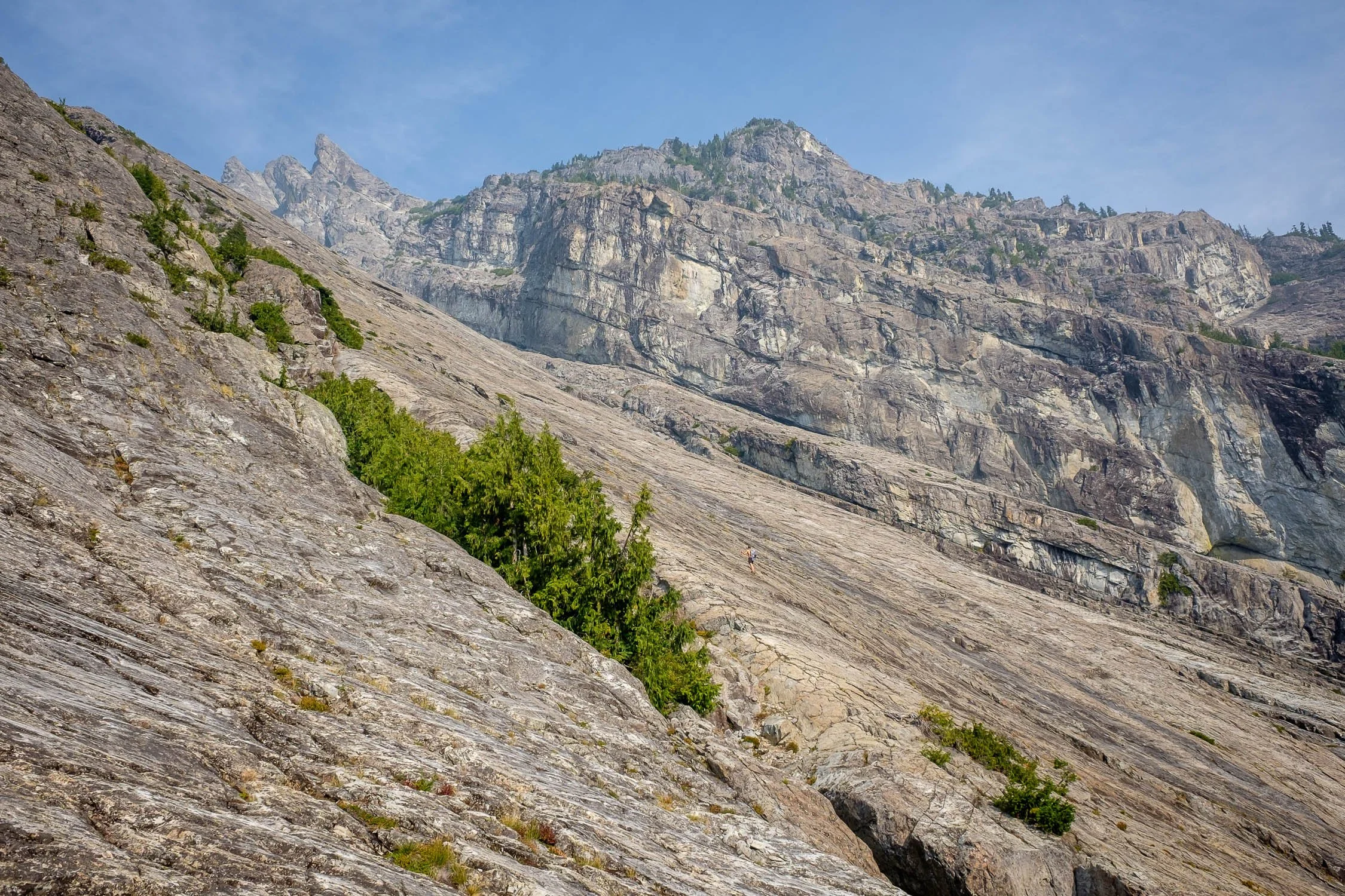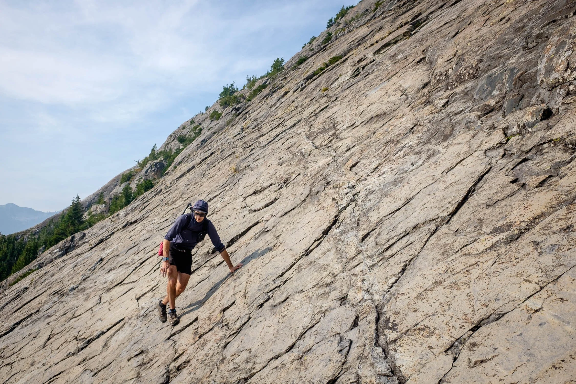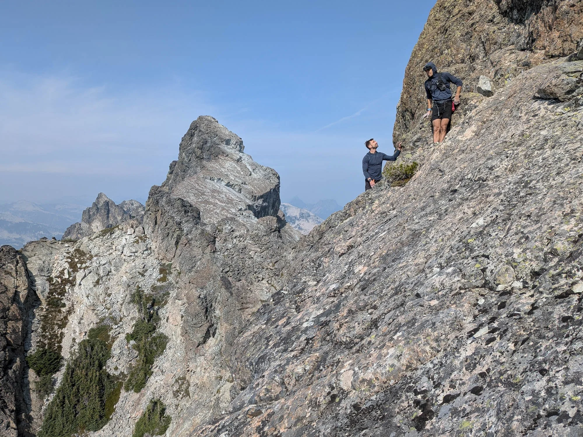We started climbing up the broad slab—it seems like it goes pretty much everywhere. The climbing was super fun and easy, and we did the whole thing in trail runners, only using our hands in a few spots. The scale of the terrain is huge. The slab is hundreds of yards wide, with a massive corner on the ridge, and only a few patches of vegetation. The only shame was how quickly the climb went by. After about an hour and twenty minutes we topped the slab out on the south shoulder of Bears Breast, about 600 vertical feet below the summit, with great (albeit hazy) views to the south.
