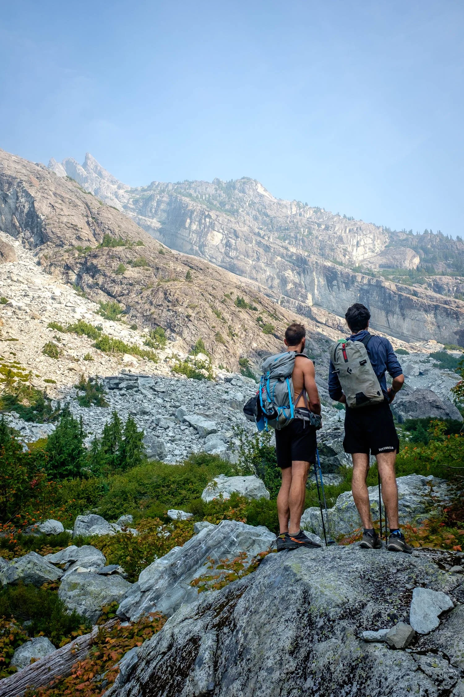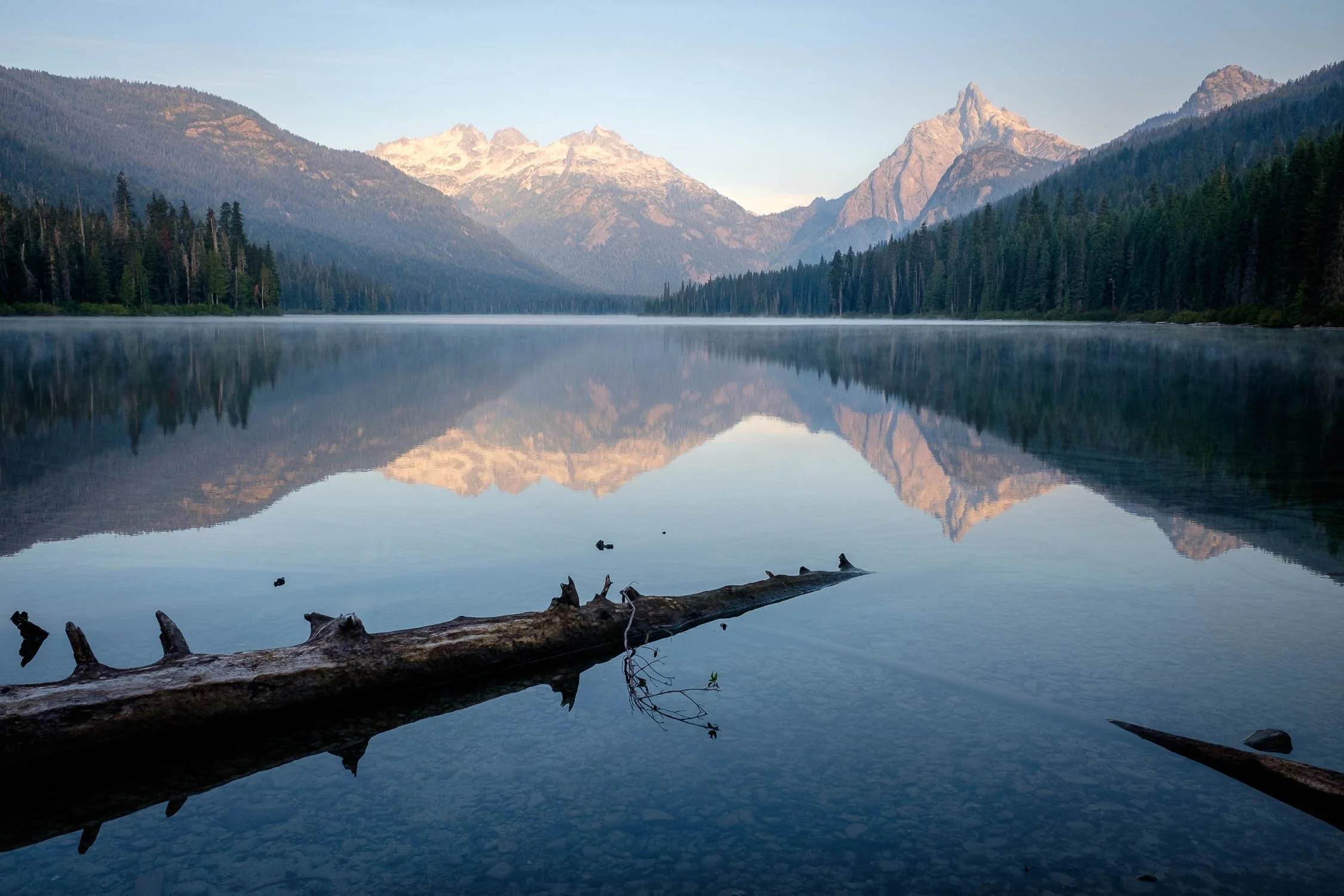 We reached Waptus Lake just as the morning light was lighting up a nice view of Bears Breast through the hazy sky. The handful of parties camped near the lakeshore were just about the only people we saw all day. We continued around the lake to hit the PCT, then continued a few miles further to the bridge over the Waptus River before leaving the trail and following the east side of Shovel Creek.