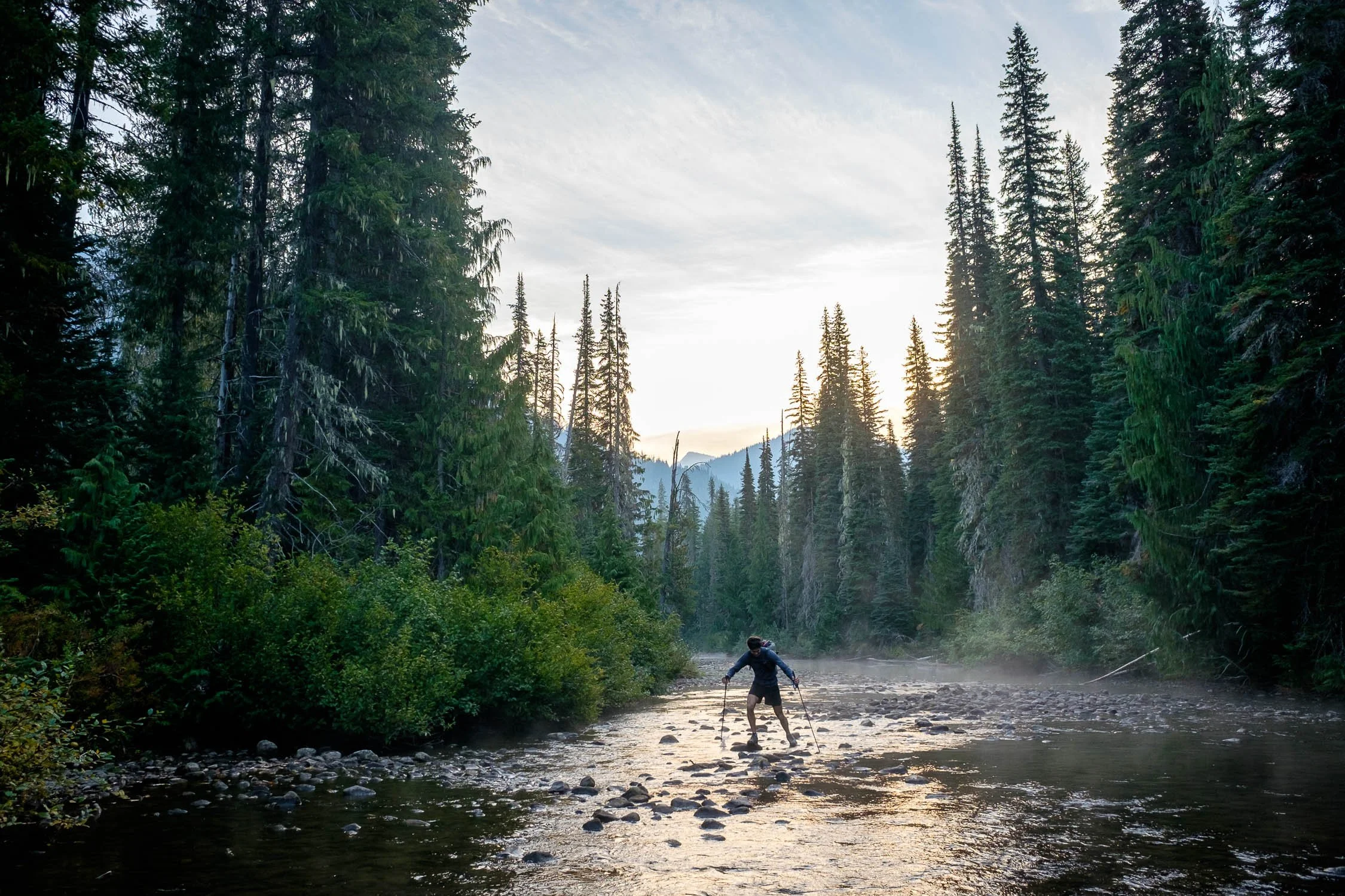 Matt managing to keep his feet dry crossing the Waptus River, with some wisps of fog clinging to the water in the chilly morning.