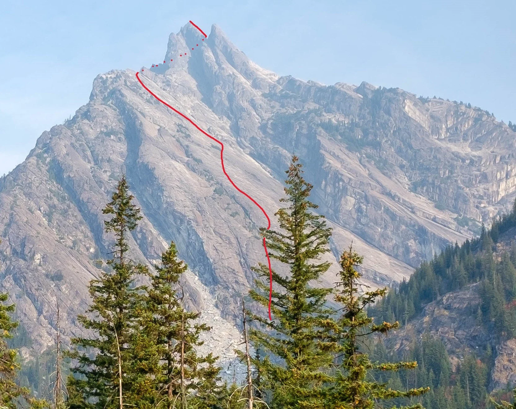 An annotated view of our route up the mega-slab from the forest near where we left the PCT.