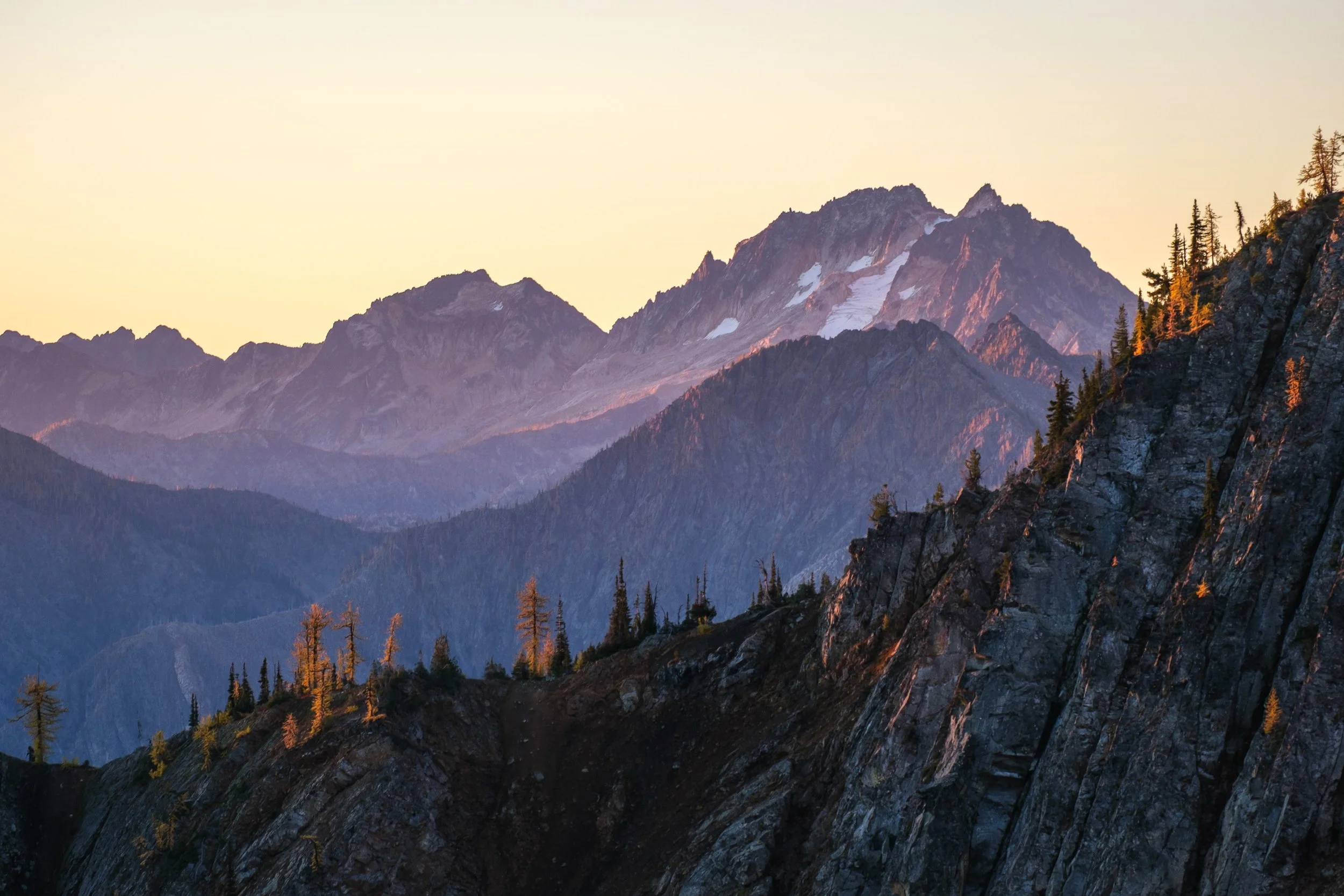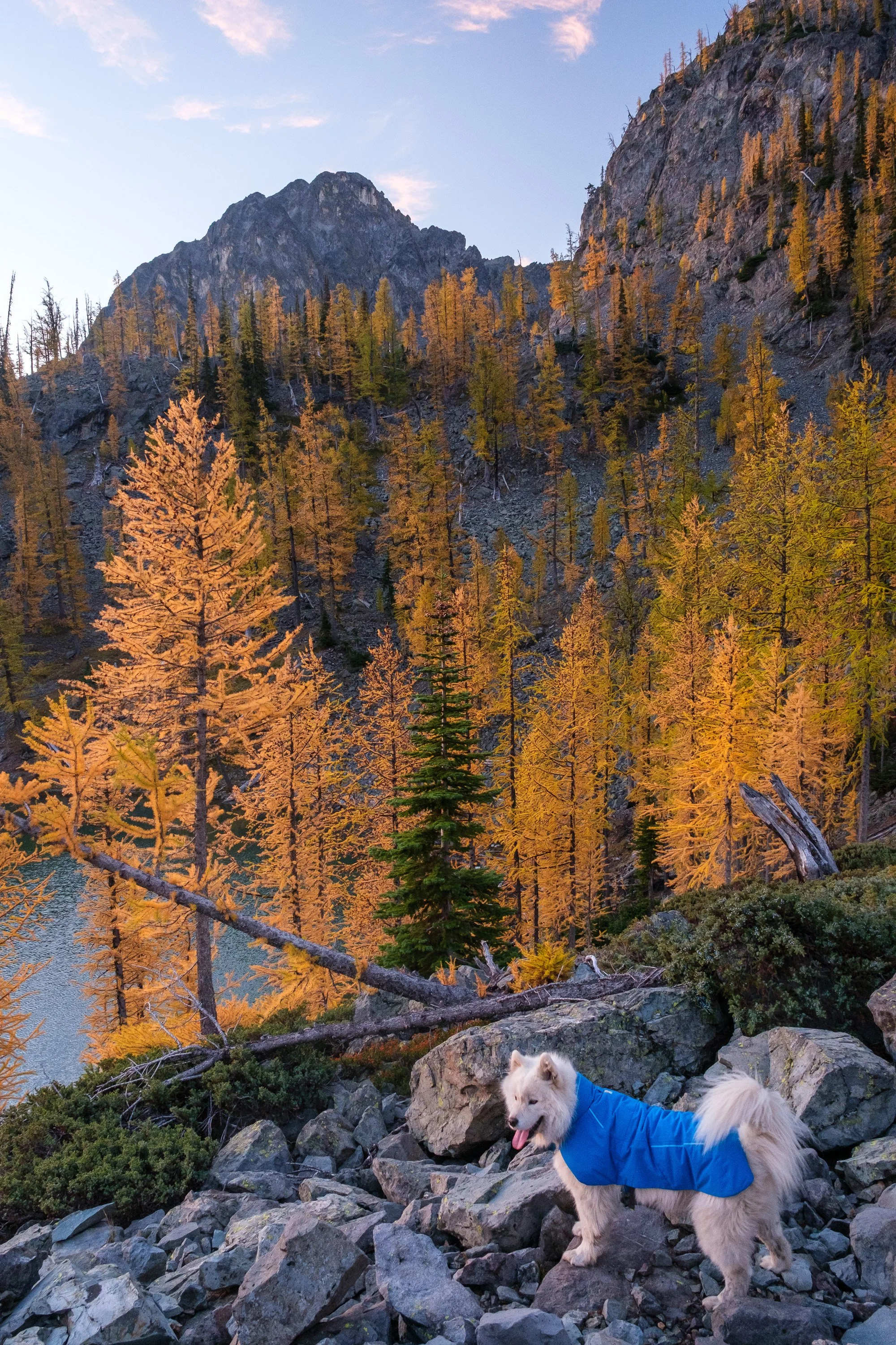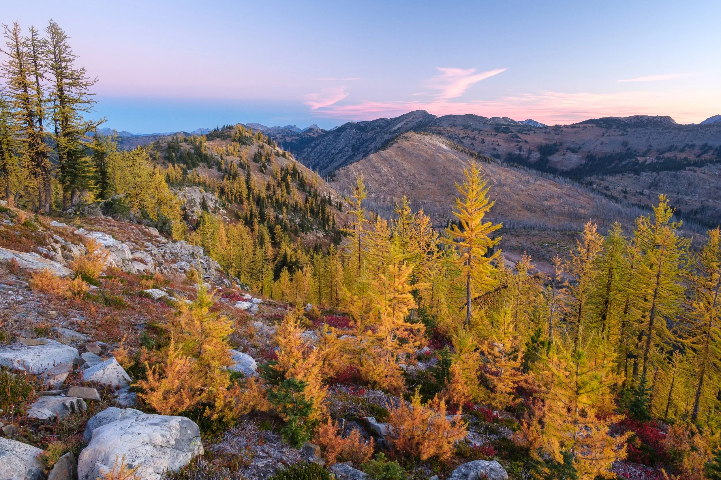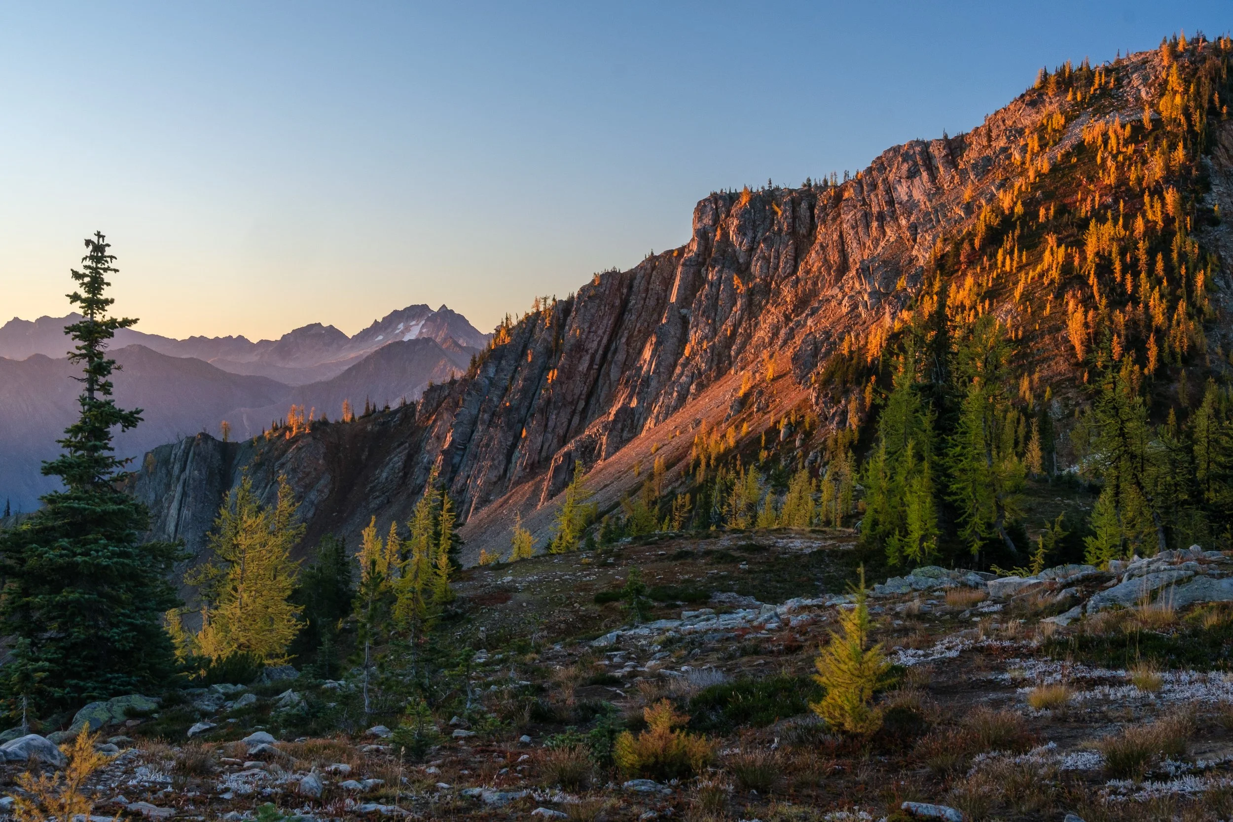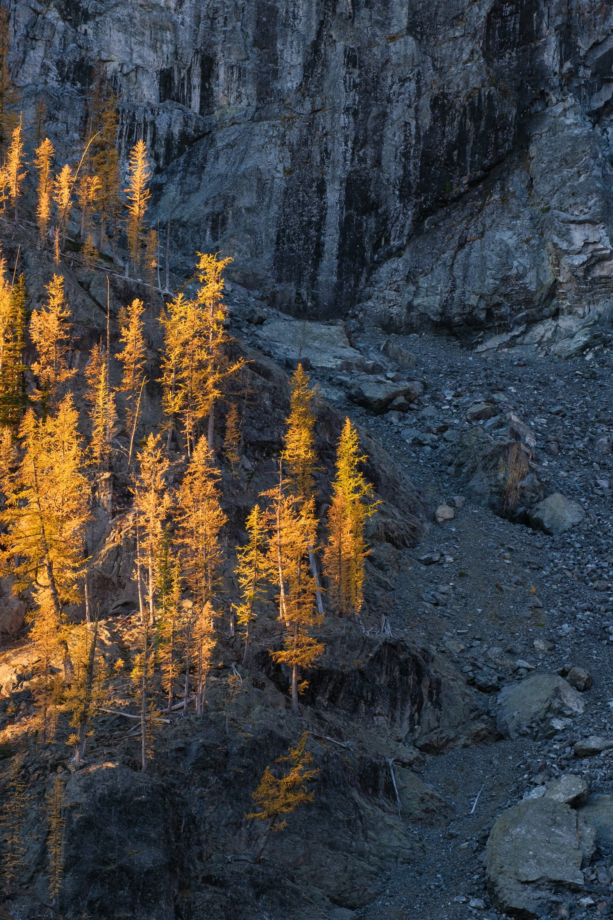 Larches catch the morning light high on Sherman Peak