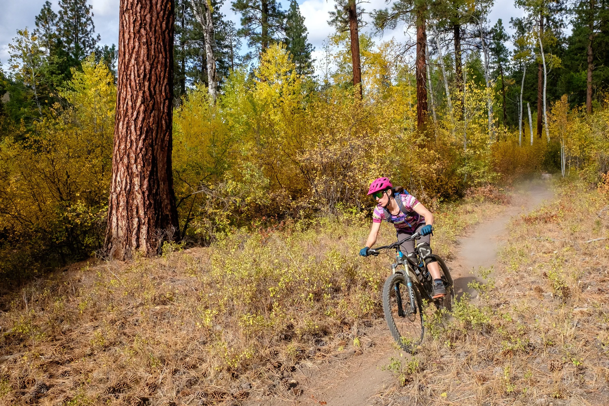 Becca ripping down the final descent on the Buck Mountain Loop