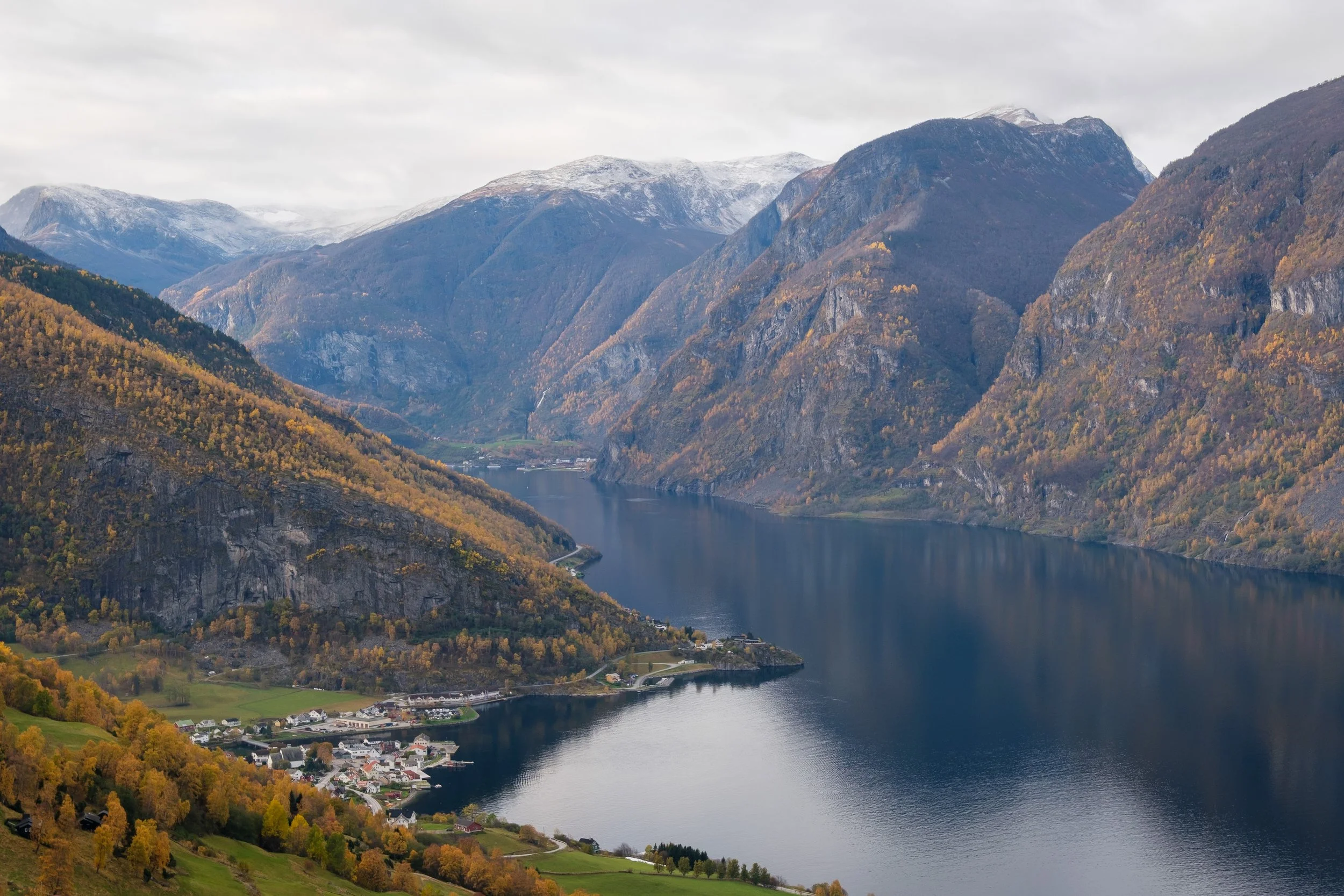 Aurlandsvangen and Aurlandsfjorden from the old highway