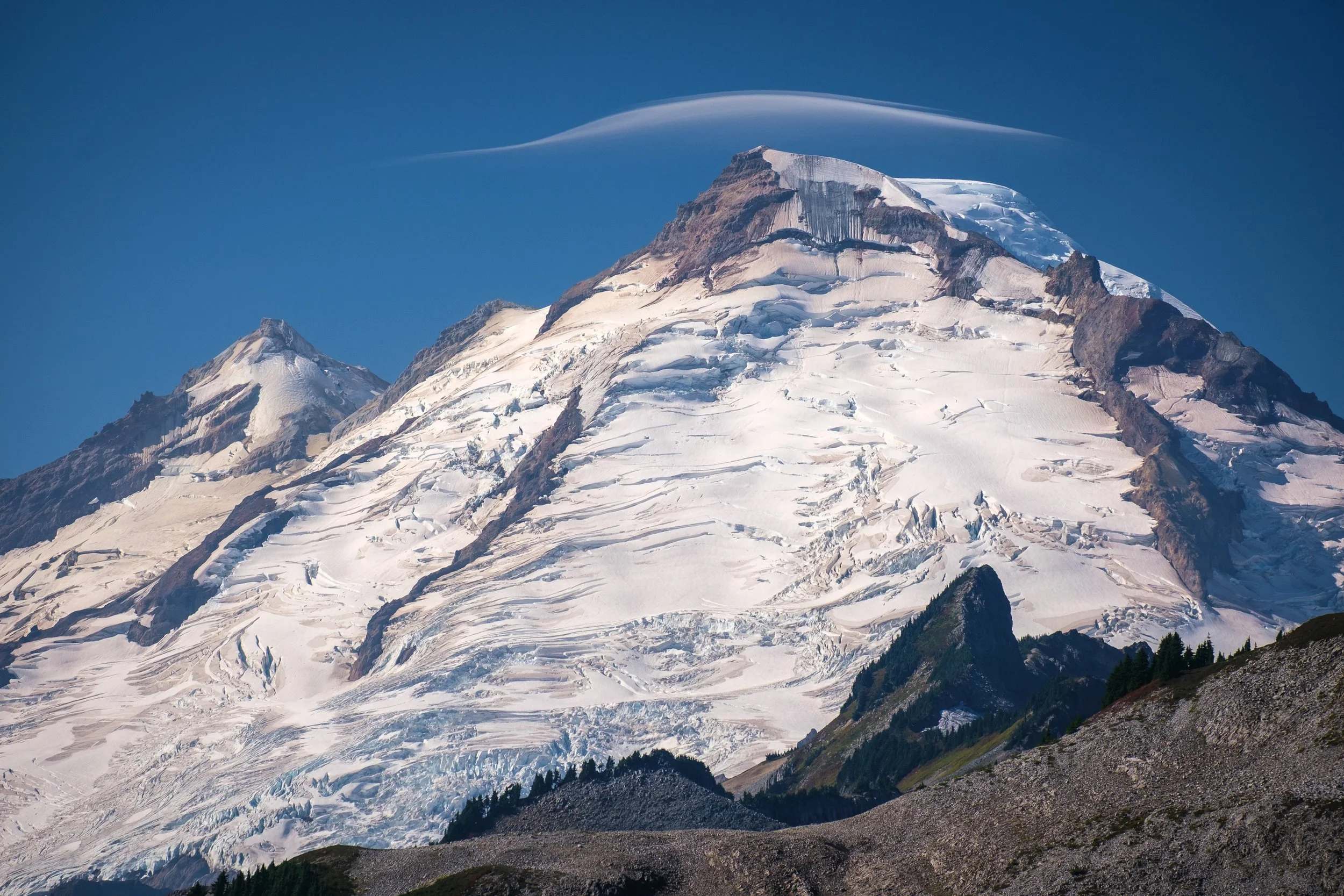 Lenticular clouds over Mount Baker, with Coleman Pinnacle in the foreground.