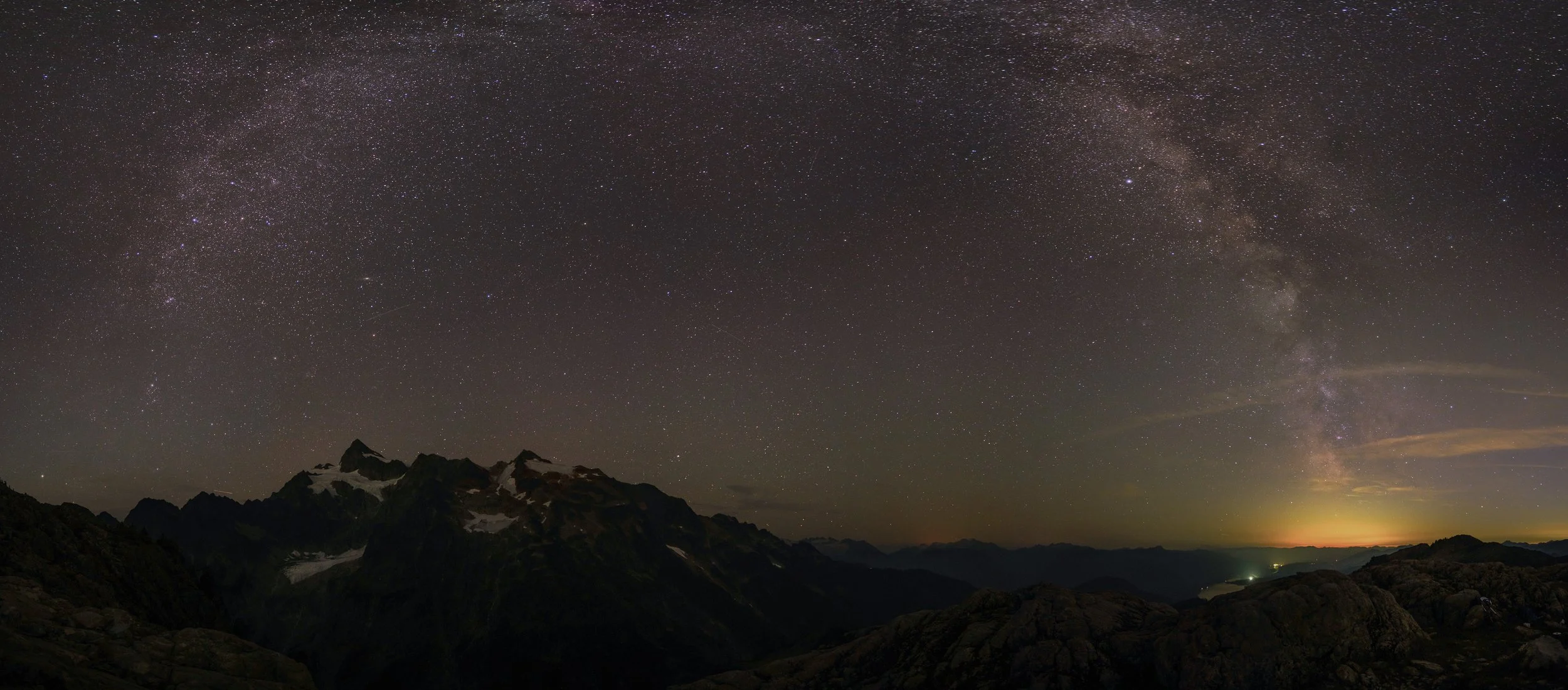 Milky Way panorama above Mount Shuksan, with Baker Lake at the right.