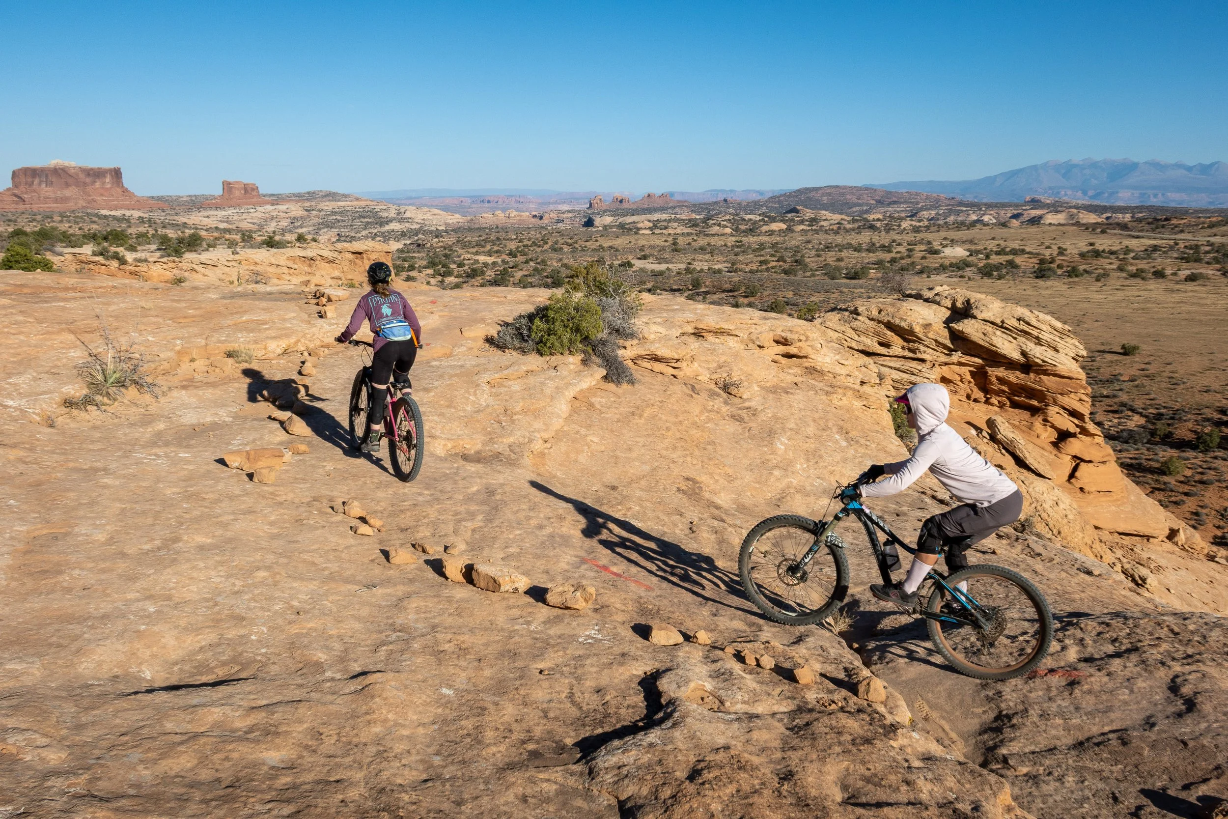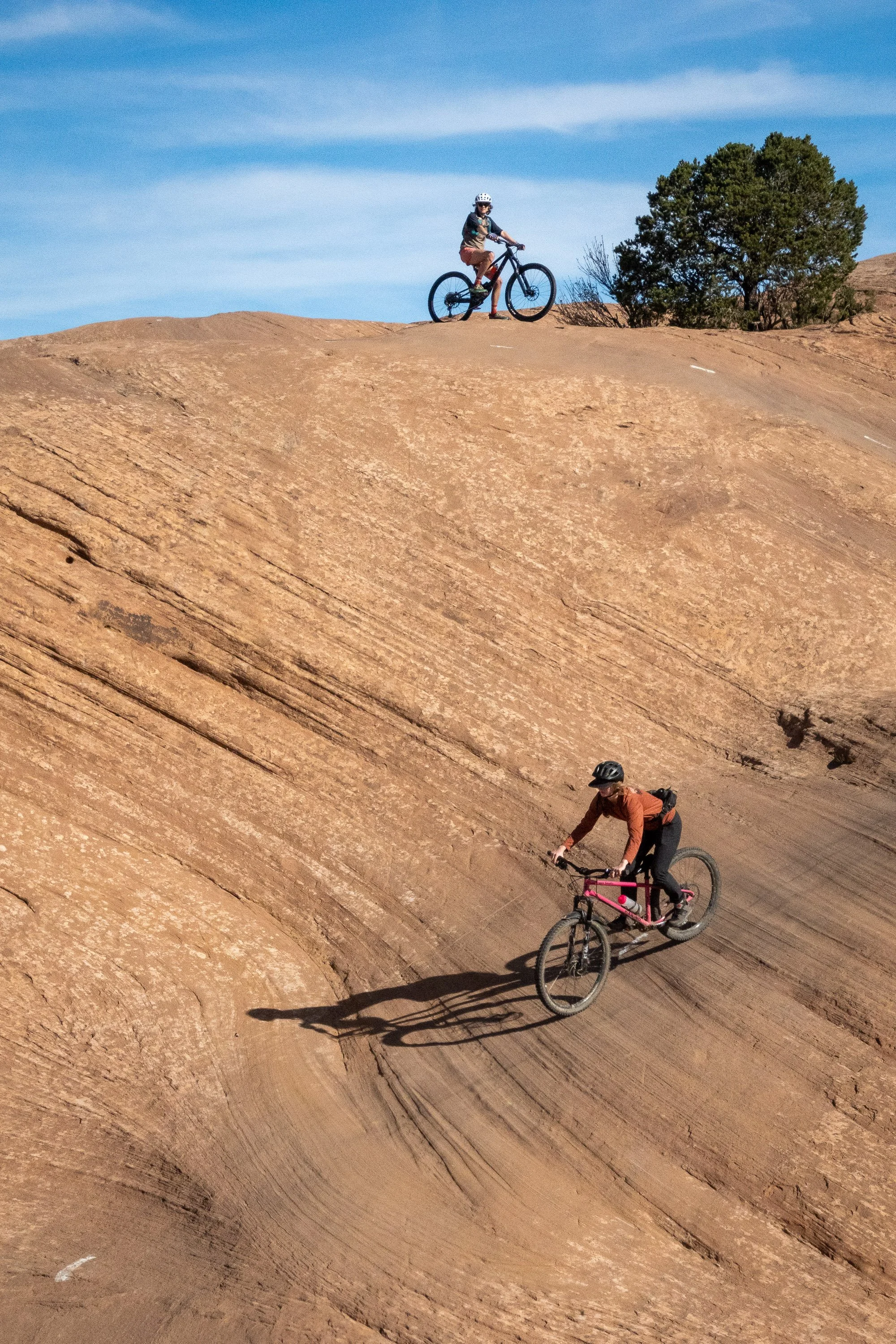 Mack looks on as Helene descends a steeper section of the Slickrock Trail