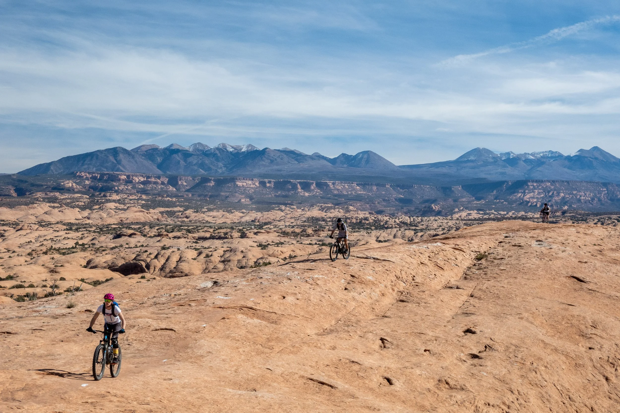 Becca leads the group with the La Sal mountains in the background and endless sandstone on the Slickrock Trail