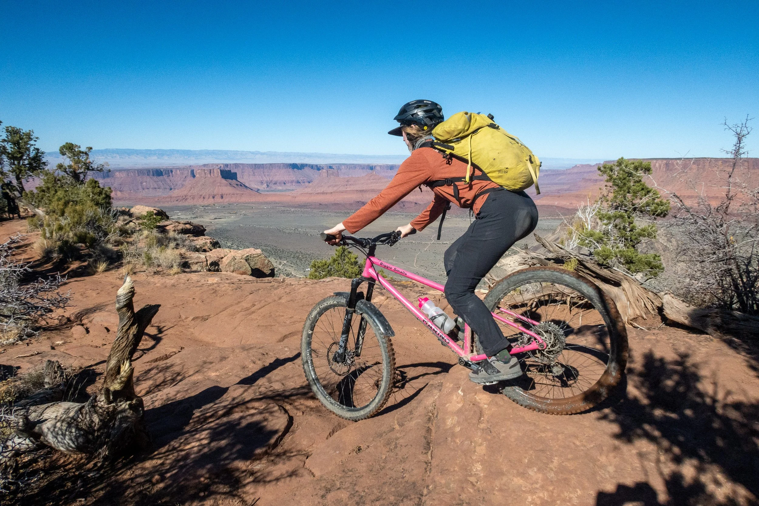 Dunlin getting boosted on Hazard County, with slickrock country inn the distance far below