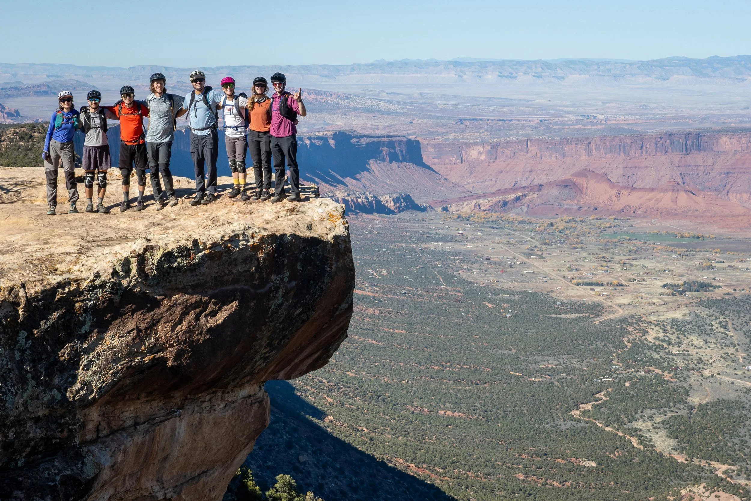 Group photo on Porcupine Rim, far above Castle Valley. The trail winds along the valley rim for miles before descending to the Colorado
